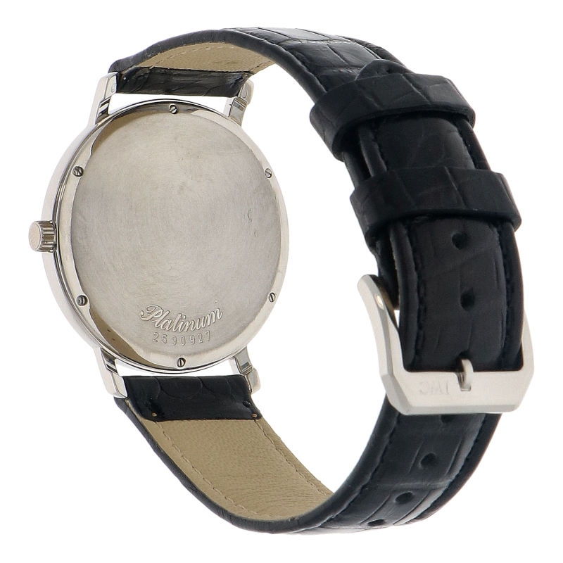 In diesem Fall steht der spezifische Code -007 für Platin, aus dem das Gehäuse gefertigt ist. Das Gehäuse hat eine klassische, schlanke Form mit einer polierten Oberfläche und einem tragbaren Durchmesser von 36 mm. Das silberne Zifferblatt hat schwarze arabische Indexe und ist in Hilfszifferblätter für Kalenderfunktionen und Mondphase unterteilt. Die Uhr wird von einem Handaufzugswerk angetrieben und verfügt über Funktionen wie Stunden, Minuten, Datum, Tag, Monat, Mondphase und Jahresanzeige. Das Hauptmerkmal ist der Ewige Kalender (Perpetual Caldendar Calendar). Dabei handelt es sich um einen Mechanismus, der automatisch die Anzahl der Tage in jedem Monat berücksichtigt, auch in Schaltjahren. Geliefert an einem schwarzen Lederarmband mit Platinschließe.