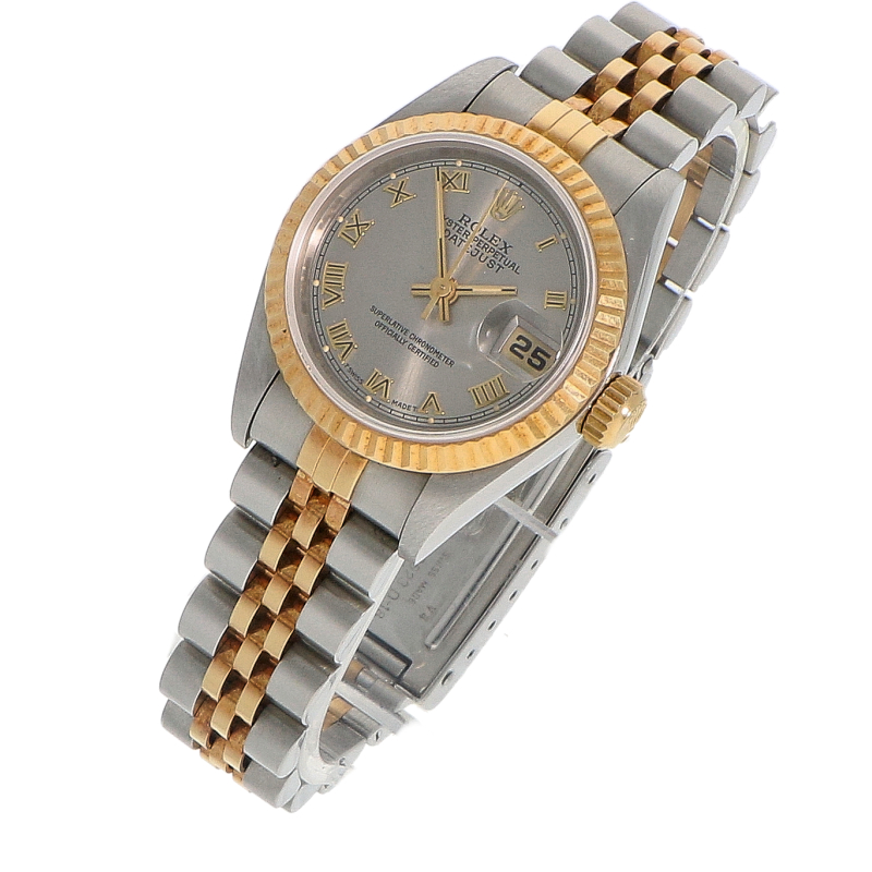 Edelstahlgehäuse (26 mm) mit gezahnter Lünette aus 18 Karat Gelbgold. Sehr schönes silbernes „Sunray”-Zifferblatt mit aufgesetzten römischen Stundenindizes aus Gelbgold. Kratzfestes Saphirglas. Automatikwerk mit Datumsanzeige (Kal. 2135). Edelstahl- und 18 Karat Gelbgold-Jubilee-Armband mit Faltschließe.