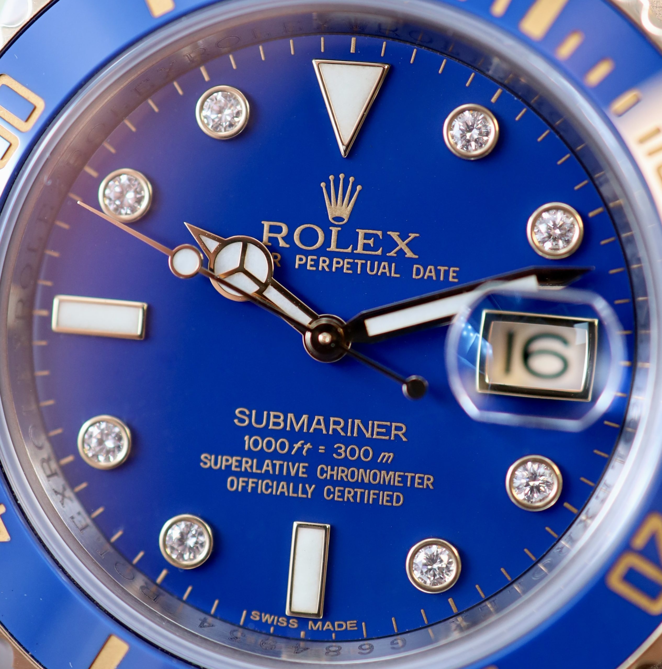 Als die 116613LB 2009 die klassische 16613 ablöste, brachte Rolex eine moderne Version des Serti-Zifferblatts heraus. Es gibt 8 brillantgeschliffene Diamant-Stundenmarkierungen, kombiniert mit dem standardmäßigen Lume-Dreieck bei 12 Uhr und Balken bei 6 und 9 Uhr. Da die Ref. 116613 mit dem Maxi-Zifferblatt – mit größeren Zeigern und Stundenmarkierungen – ausgestattet ist, sind auch die Diamanten auf dem Zifferblatt größer als bei früheren Submariner-Modellen. Diese Uhr hat auch ein sogenanntes „Flat Blue”-Zifferblatt. Dabei handelt es sich um eine lackblaue Farbe, die genau zur blauen Keramiklünette passt. Um 2013 kehrte Rolex wieder zum glänzenden „Sunburst”-Zifferblatt in Blau zurück, aber die Diamantoption wurde zu dieser Zeit aus dem Sortiment genommen. Das macht diese Uhr ziemlich selten, da diese Ausführung nur sehr kurz produziert wurde. Dieses Modell ist auch für sein „Two-Tone”-Design (eine Kombination aus Edelstahl und 18 Karat Gelbgold) bekannt. Obwohl der Durchmesser 40 mm beträgt, wirkt die 116613 aufgrund der breiteren Bandanstöße und dickeren Kronenschutzvorrichtungen größer als ihr Vorgängermodell. Angetrieben wird sie vom legendären Kaliber 3135.