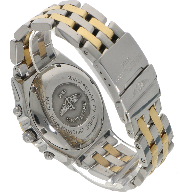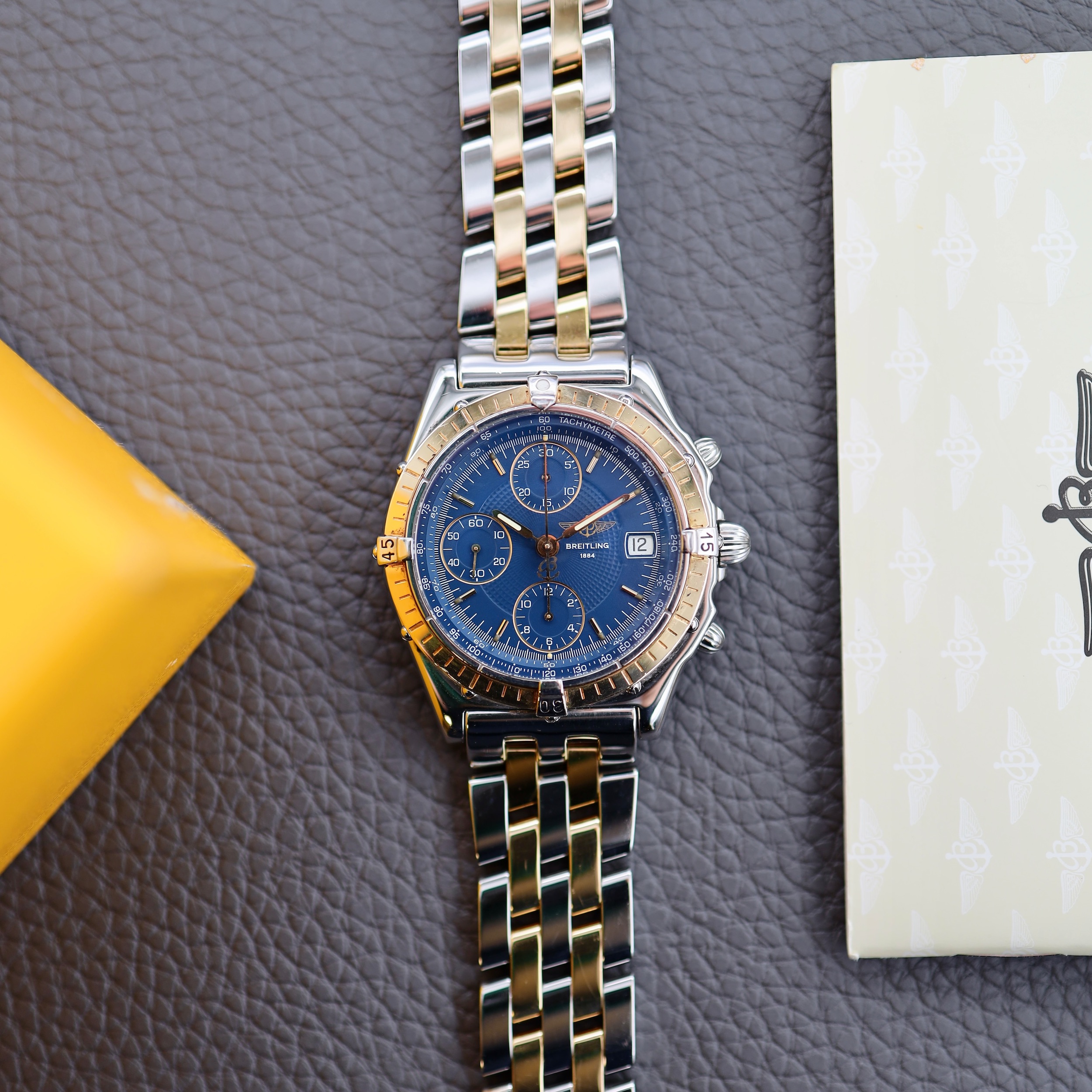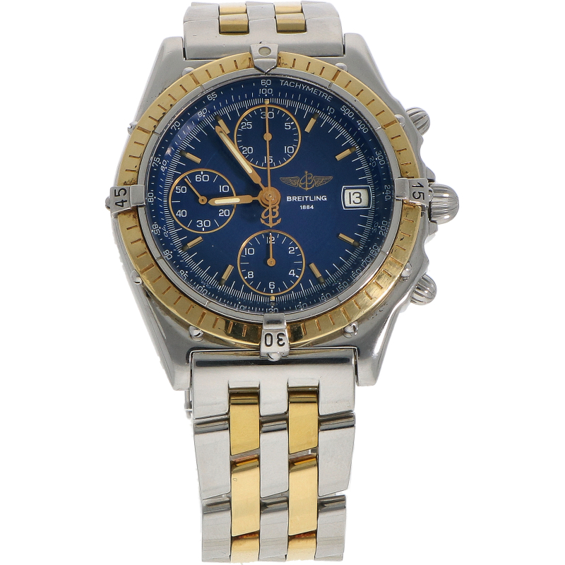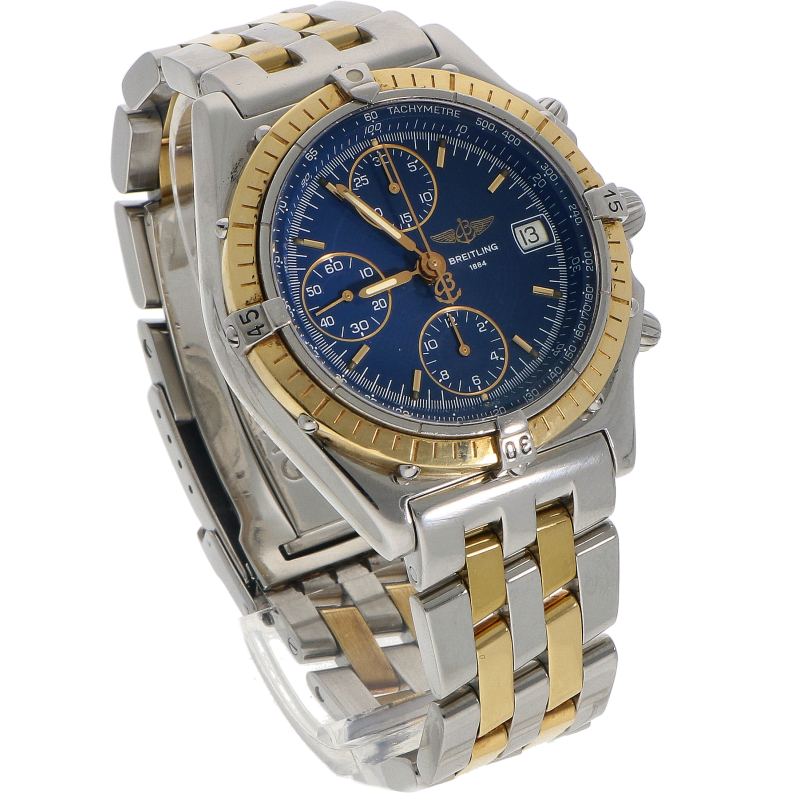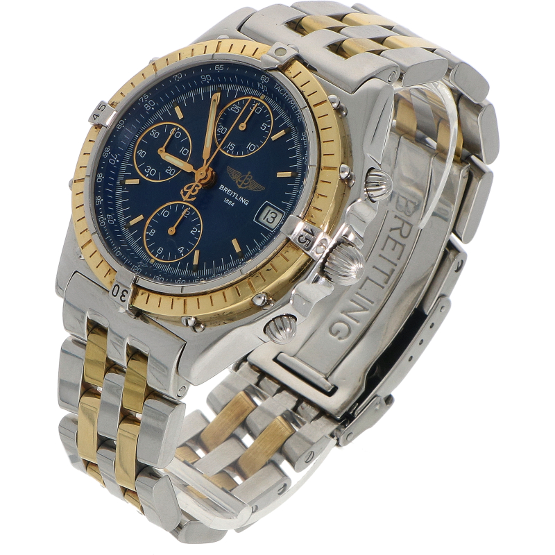Dit horloge is een absolute klassieker uit de jaren ’90. Het belichaamt de stoere, luxueuze stijl van Breitling uit die tijd. De kast is gemaakt van gepolijst roestvrij staal en heeft een diameter van 39mm. Destijds een fors herenhorloge, tegenwoordig een klassieke maat! Een van de meest herkenbare kenmerken van dit horloge is de 18- karaats geelgouden lunette. Het is een unidirectionele ring met vier ‘Rider Tabs’, om de lunette makkelijker te kunnen bedienen met vlieghandschoenen aan. De blauwe wijzerplaat heeft een typische chronograaf- indeling met drie sub-dials op 6,9 en 12 uur positie. De datumvenster bevindt zich op 3 uur positie. Op de buitenste rand van de wijzerplaat vind je een Tachymeter- schaal om de snelheden te berekenen. Binnenin tikt een automatisch chronograaf uurwerk. Geleverd op een staal/gouden Pilot armband.