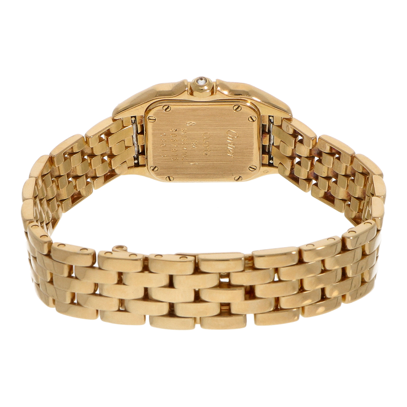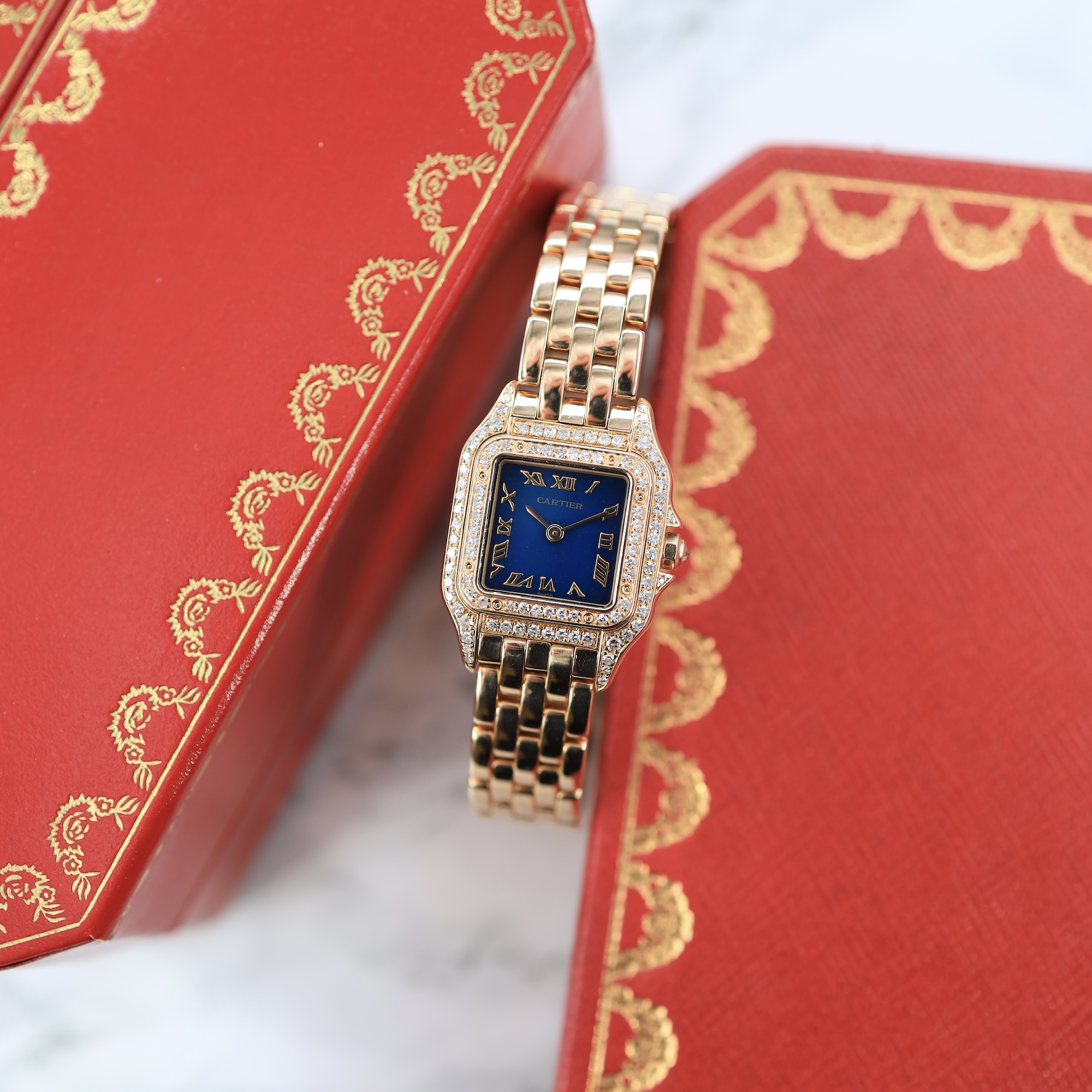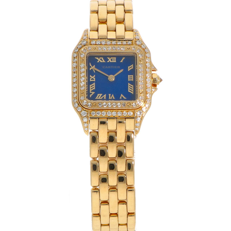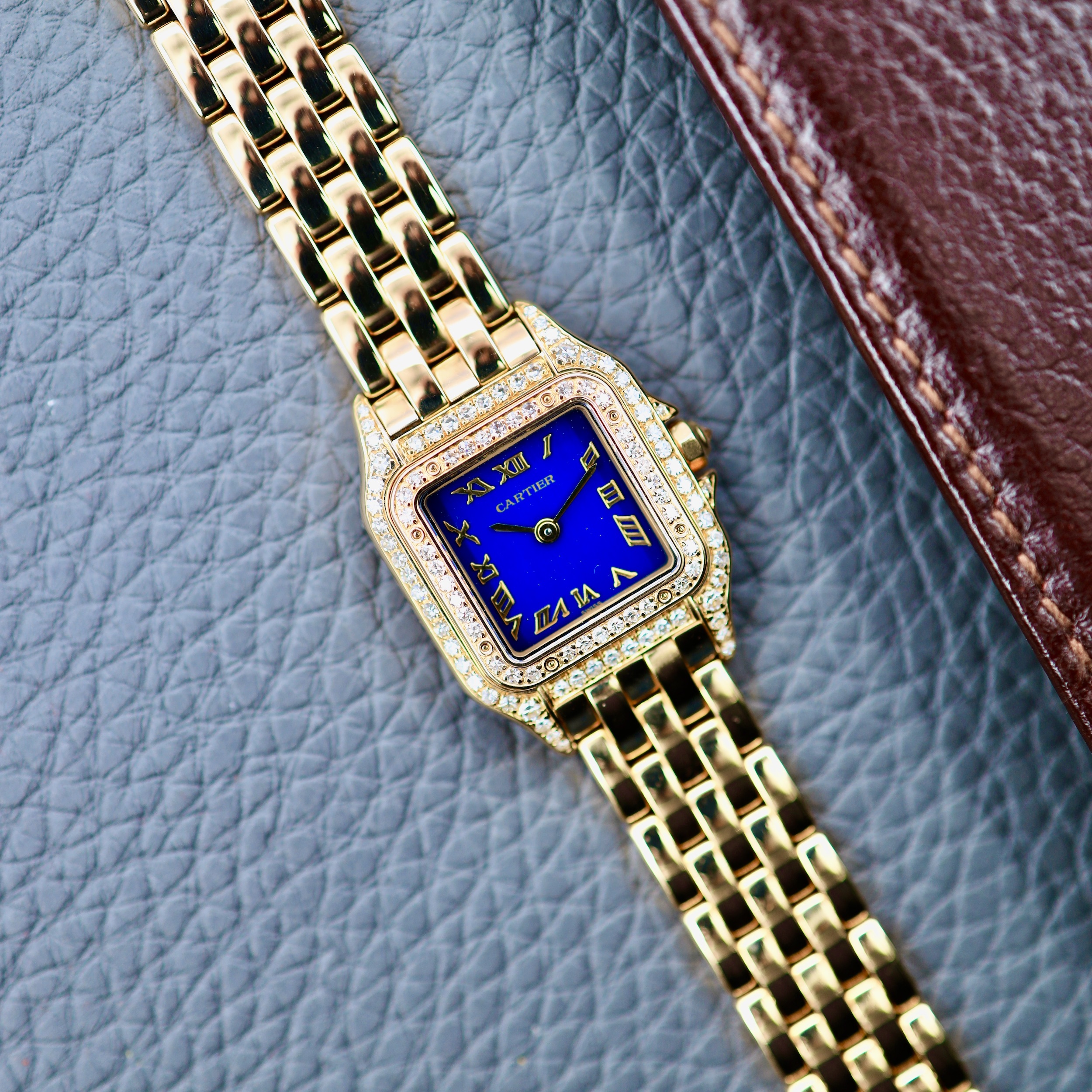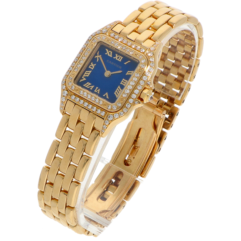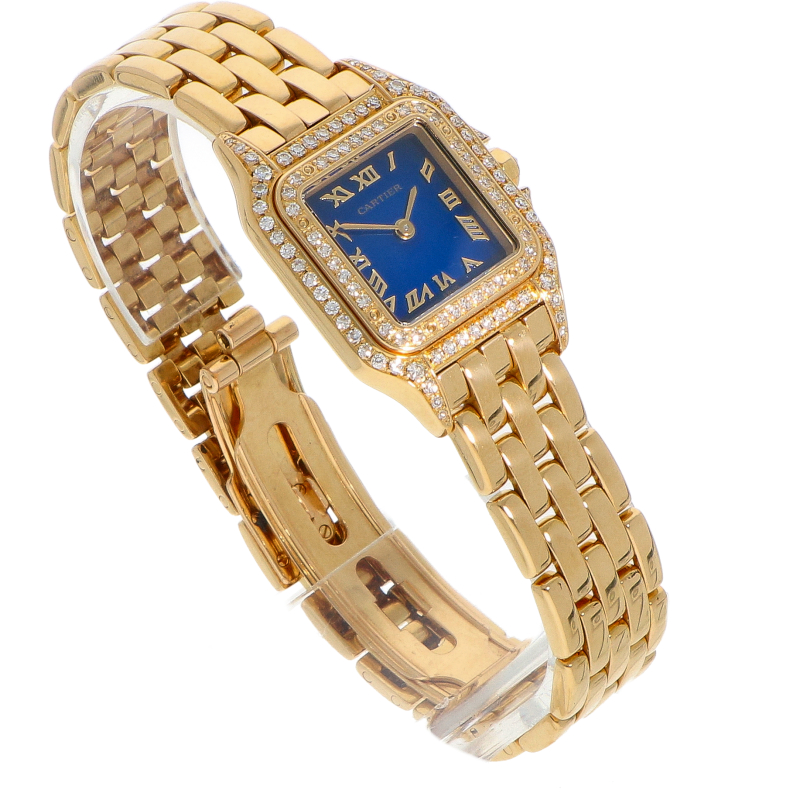 Dit is een zeer exclusieve variant van Cartier Panthère 8057915 ‘Small Model’ (22mm). Het horloge is volledig uitgevoerd in 18- karaats geelgoud. De kast, de lugs en de bezel zijn bezet met diamanten, rechtstreeks vanuit de Cartier- fabriek. De helderblauwe wijzerplaat met geelgouden Romeinse uurmarkeringen en wijzers biedt een mooi contrast. Het horloge wordt aangedreven door een quartz uurwerk. De klassieke Panthère- band is zeer soepel en bestaat uit kleine, gepolijste schakels die om de pols vallen als een armband.