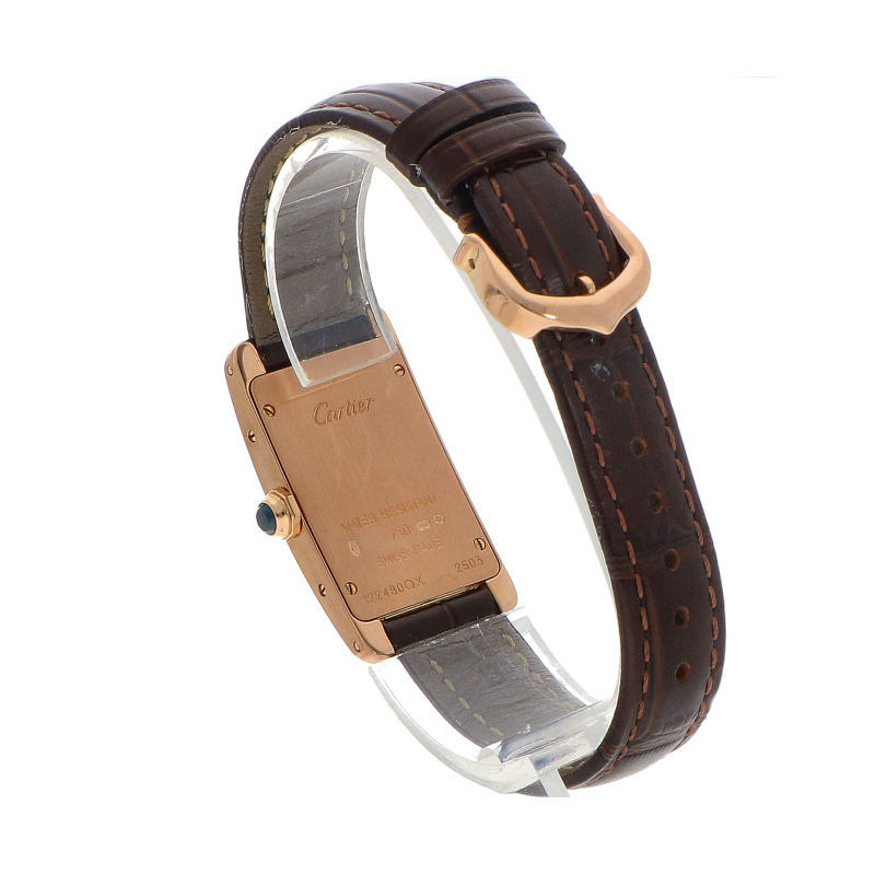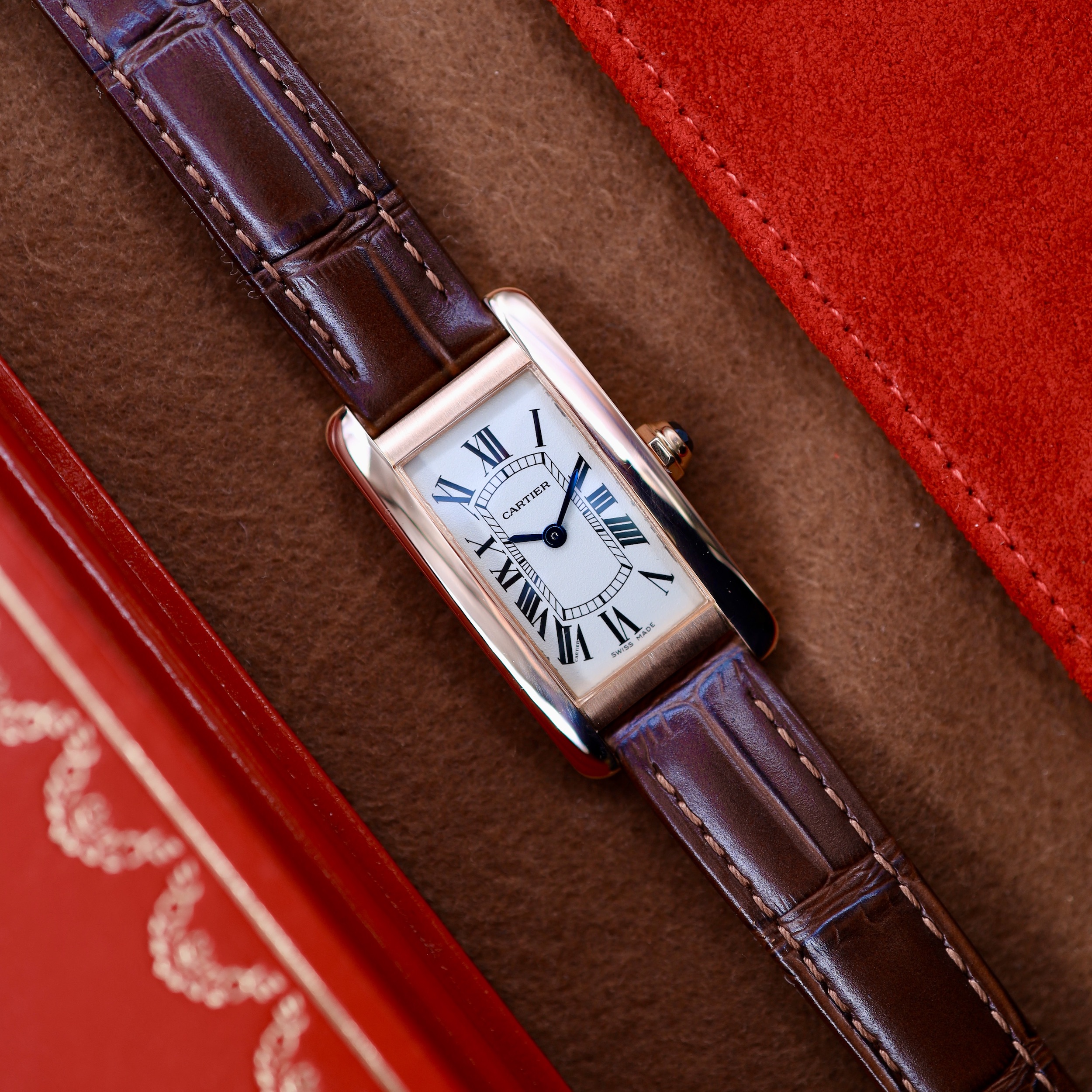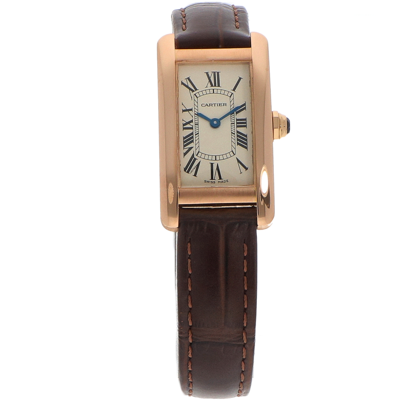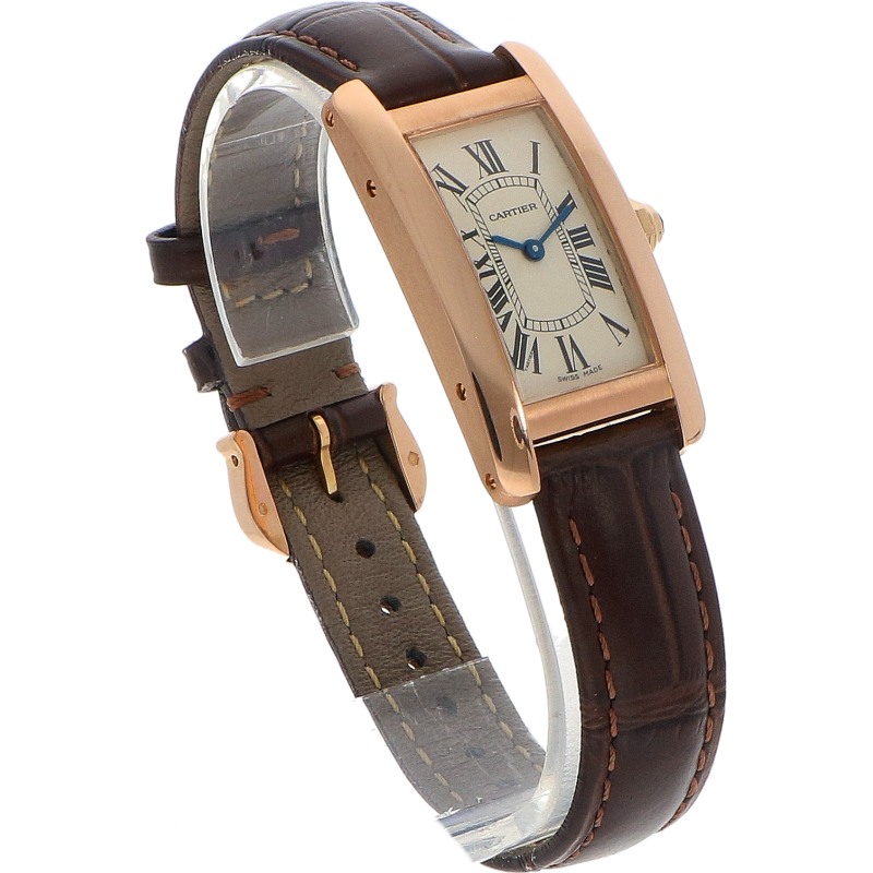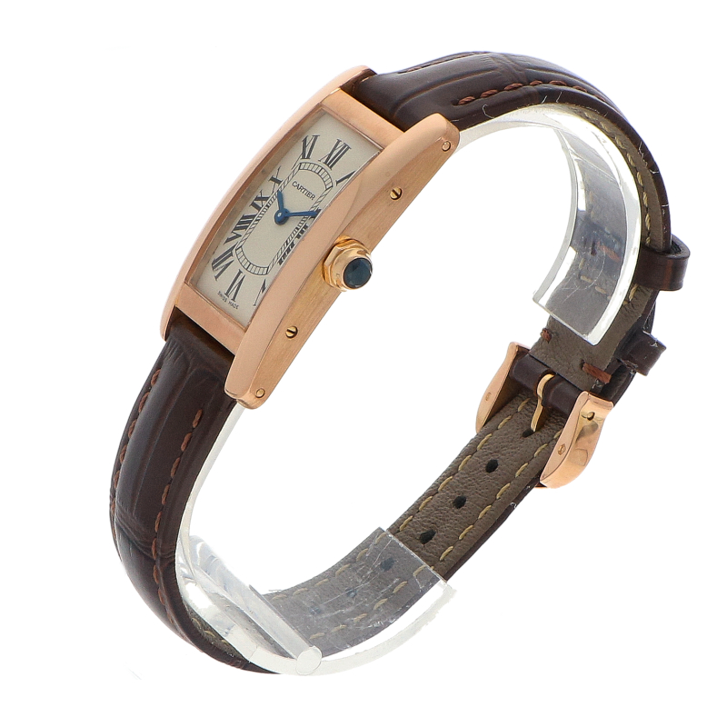 De Tank Américaine staat bekend om zijn gebogen kast, die langer en smaller is dan de traditionele Tank. Ref. 2503 is uitgevoerd in 18- karaats roségoud. De kast meet 19mm x 35mm. De kenmerkende achtzijdige kroon is bezet met een blauwe saffier. De witte wijzerplaat heeft de klassieke zwarte Romeinse cijfers en geblauwde stalen zwaardwijzers. Het horloge wordt aangedreven door een quartz uurwerk. Geleverd op een nieuwe lederen band met een 18- karaats roségouden gespje van Cartier.