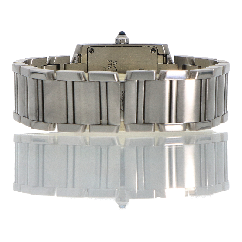 Ref. 2384 is a 'Small Model' measuring 20 x 25 mm. The watch is made of high-quality stainless steel. What makes this watch special is its iridescent mother-of-pearl dial. The dial changes color depending on the angle: from soft pink to light blue and green. It features white Roman hour markers and blued steel sword hands. This model is powered by an extremely reliable Cartier quartz movement. The Française's strap is inspired by the caterpillar tracks of an army tank, but executed in a refined, polished, and brushed style. A concealed butterfly clasp allows the design to flow uninterrupted.