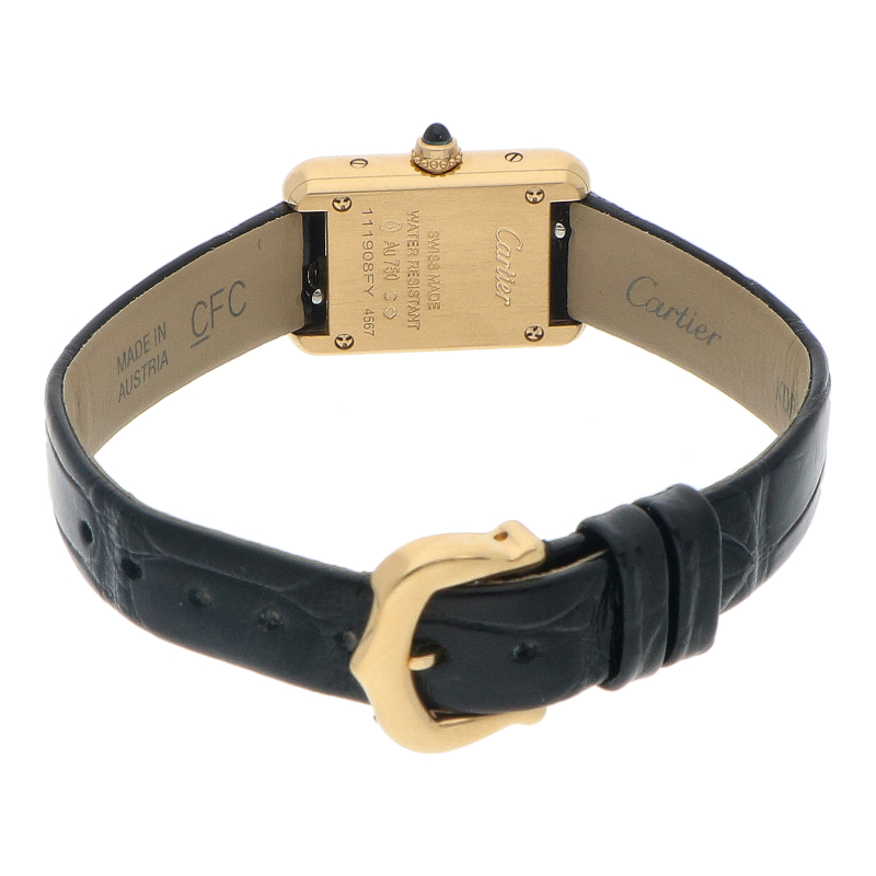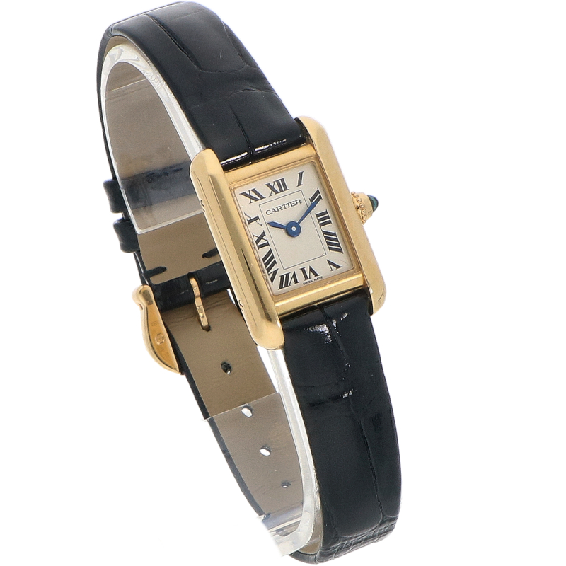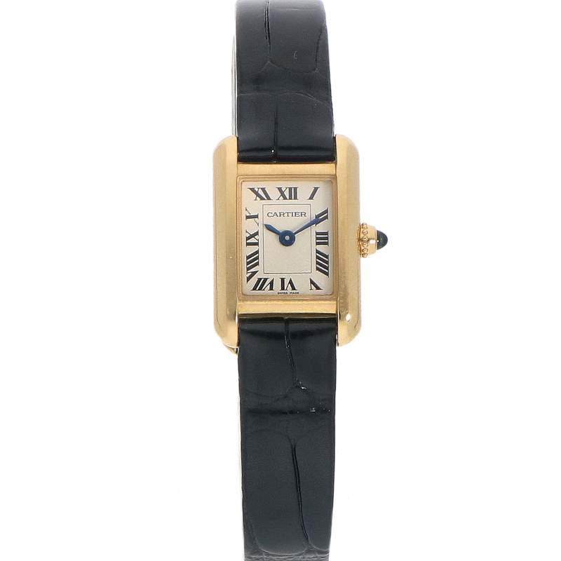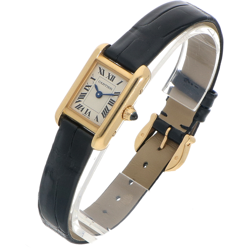 Reference WGTA0352 is a mini model of the iconic Tank Louis. With the case dimensions of 16x24mm, it is a very discreet and elegant watch. The case is made of 18-karat yellow gold. The silver-tone dial features Roman hour markers and blued steel hands. The beaded crown is set with a blue sapphire cabochon. The watch is powered by quartz movement and comes on a shiny black alligator leather strap with an 18-karat yellow gold Ardillon buckle.