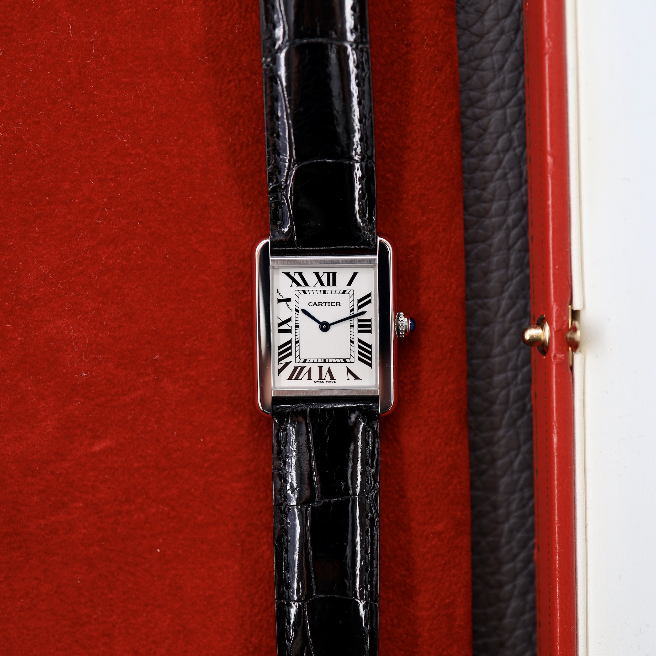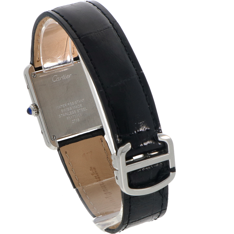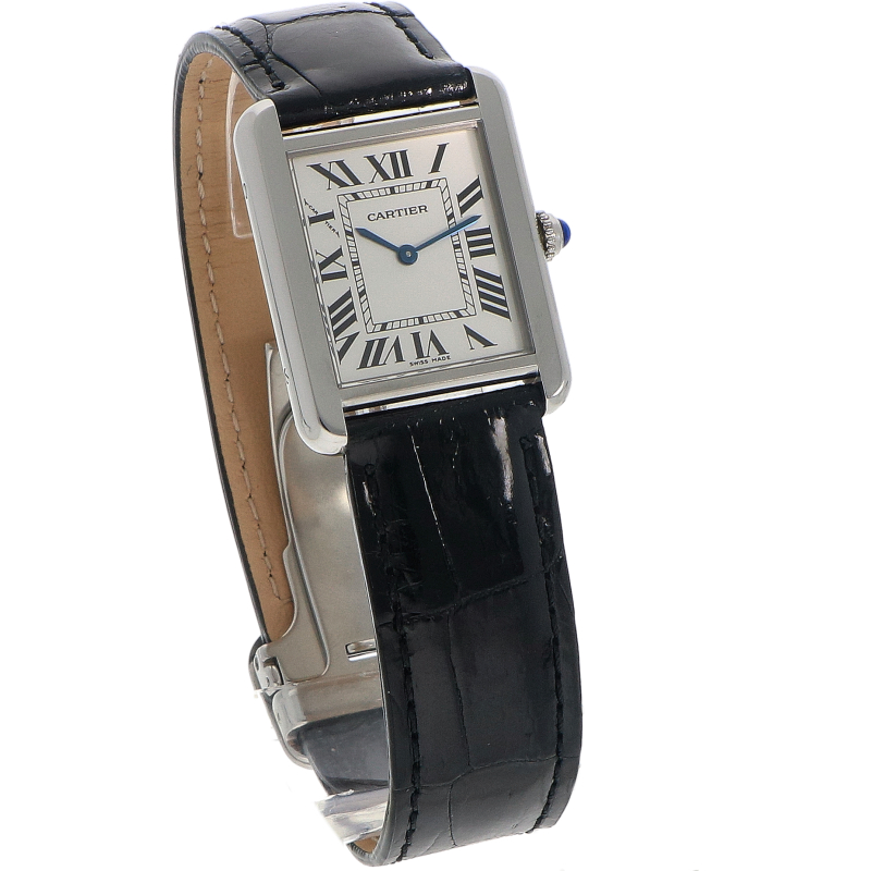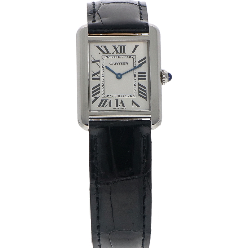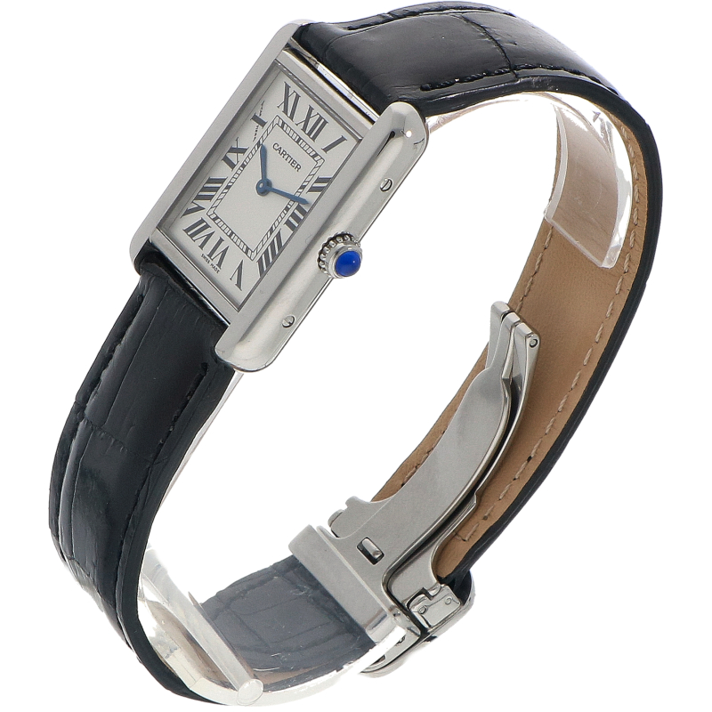 The Tank Solo 2716 is a more modern and minimalist interpretation of the original Tank designs. The case is made of stainless steel and measures 24 x 31 mm ("Small Model"). The white dial features black Roman hour markers and blued steel sword hands. The crown is set with a blue sapphire cabochon. The watch is powered by a quartz movement and comes on a new leather strap with a folding clasp.