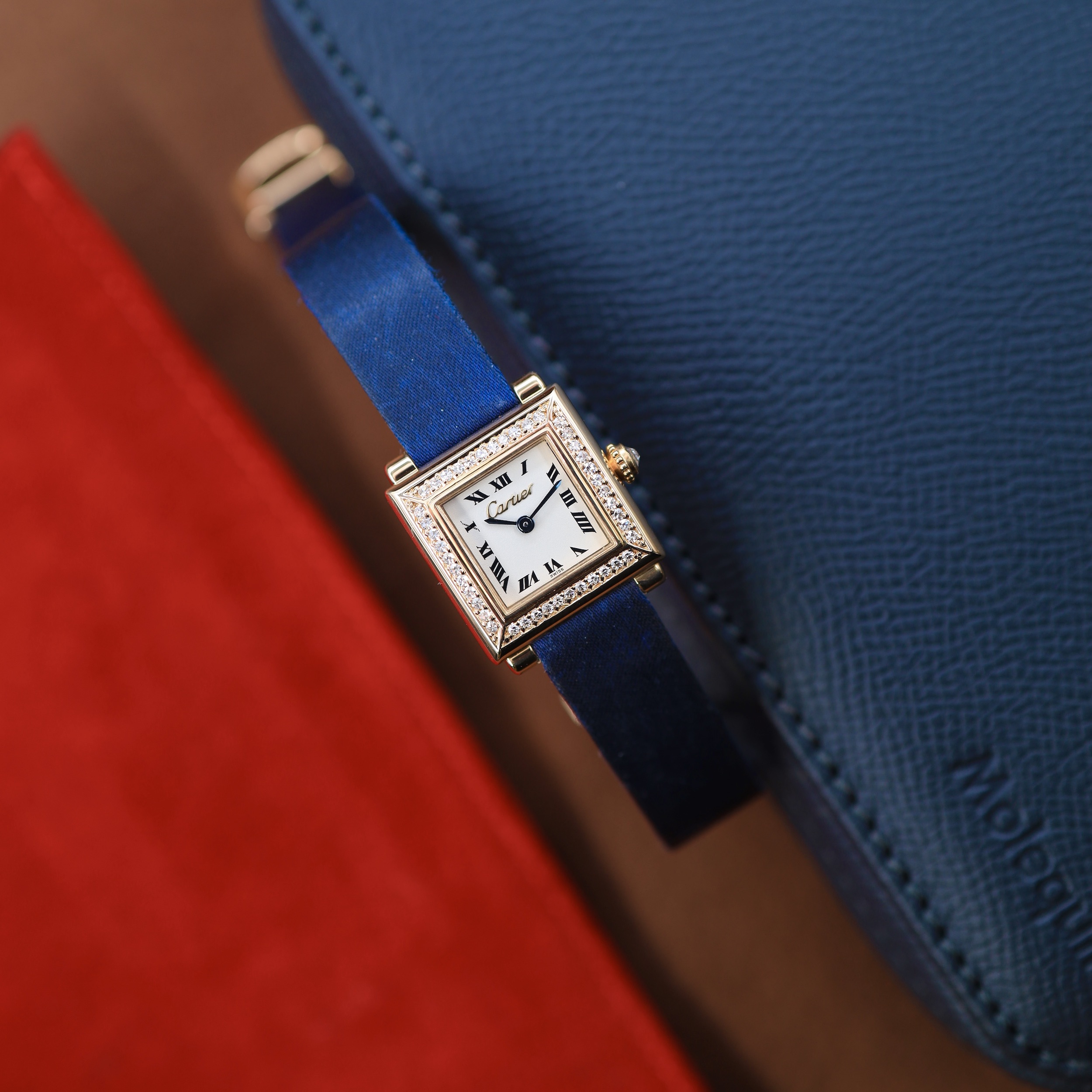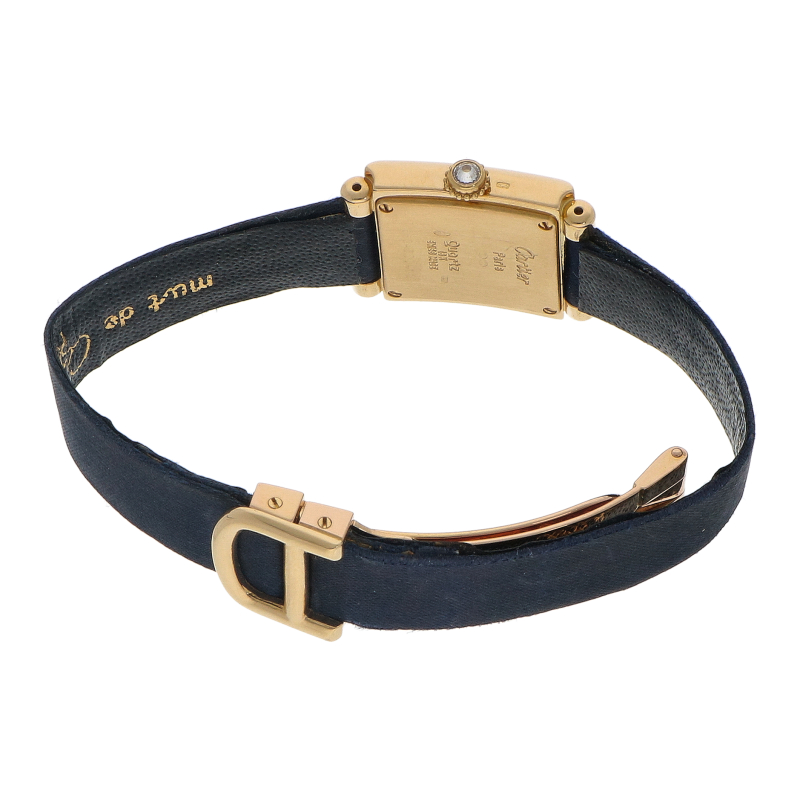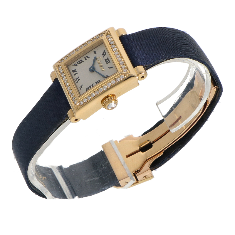 Cartier Trocadero is a rare and extremely elegant watch, known for its jewel-like appearance. The case is made of 18-carat yellow gold. The design pays homage to the square shape with soft, rounded corners (carré shape). Measuring 20 x 20 mm, it is a very compact watch. The bezel is completely set with brilliant-cut diamonds, making it a very luxurious model. The classic dial has black Roman numerals and blued steel sword hands. The watch is equipped with a quartz movement. Delivered on a Cartier strap with an 18-karat yellow gold folding clasp.
