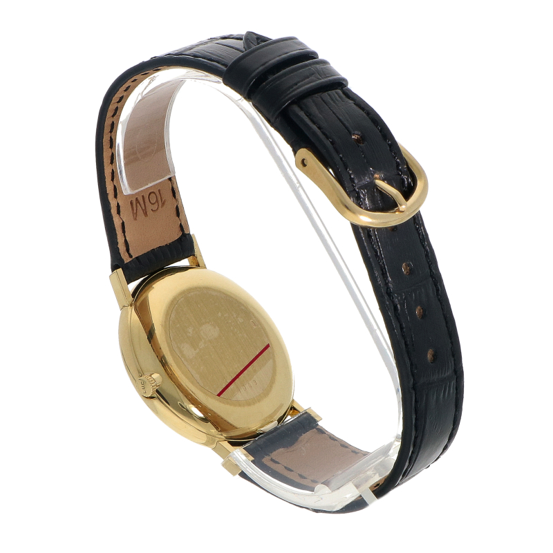 This model (ref. 1048) is an elegant vintage unisex watch. It is executed in 18-karat solid gold and has an unusual case shape. The diameter of the case is 33mm. It features a white dial with Roman hour markers. It is powered by a hand-winding movement and comes on a new leather strap.