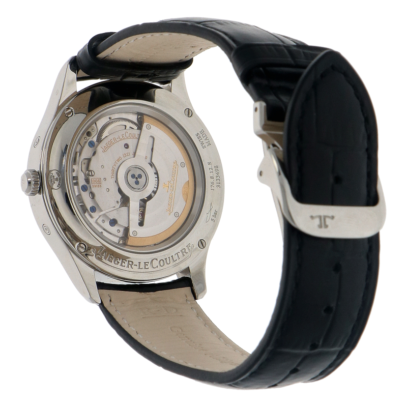 The Master Calendar is a "Triple Calendar" watch, which means it displays the day, date, and month, supplemented with a moon phase. It has a polished stainless steel case with an elegant diameter of 39 mm. It is powered by an automatic movement cal. 866 (which can be admired through the sapphire crystal case back). Like all Jaeger-LeCoultre Master Control models, this watch has also undergone the rigorous 1000 Hours Control test. Delivered on a black alligator leather strap with a folding clasp.