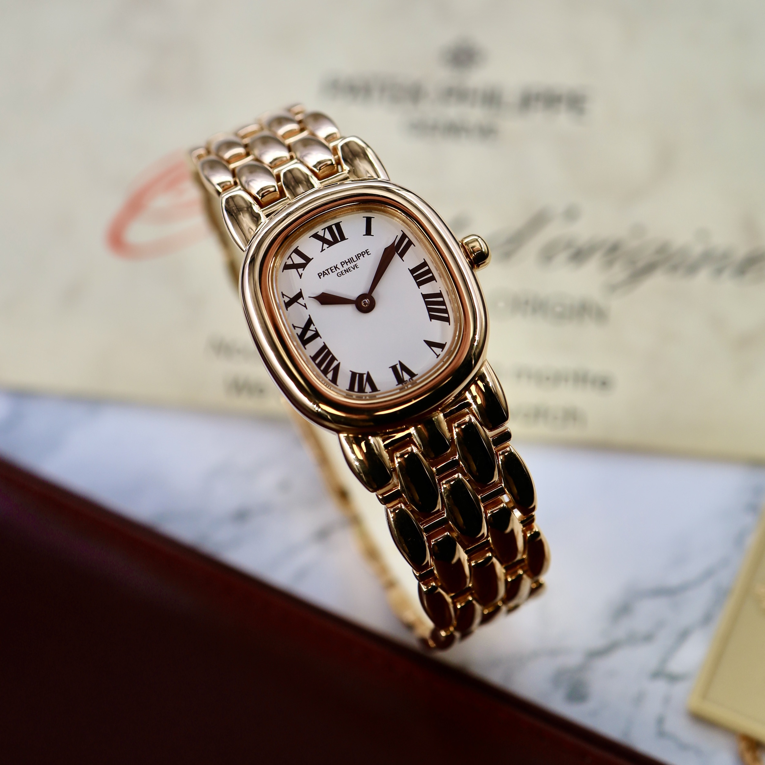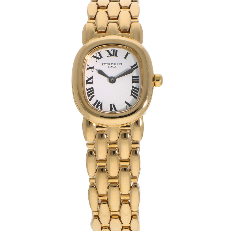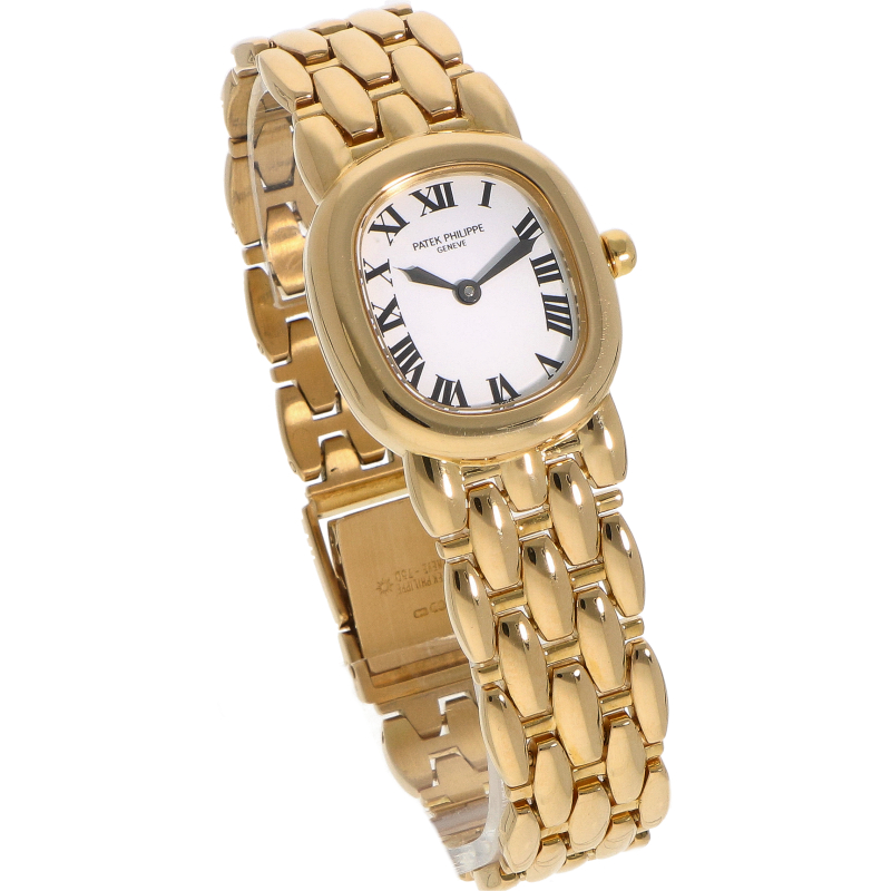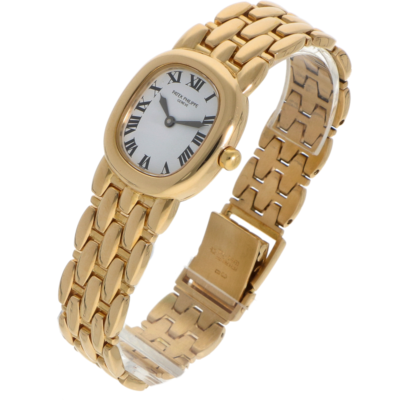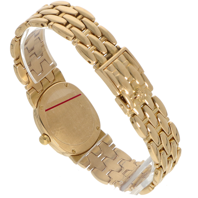 Ref. 4830 is a refined ladies' watch from the famous Golden Ellipse collection. The oval case is crafted from 18-carat yellow gold. The dimensions are very compact and feminine: 23 x 26 mm. The dial is porcelain white with black Roman numerals. The watch is equipped with a high-quality quartz movement. It comes on a fully integrated 18-karat yellow gold link bracelet. This gives the watch a more jewel-like appearance.