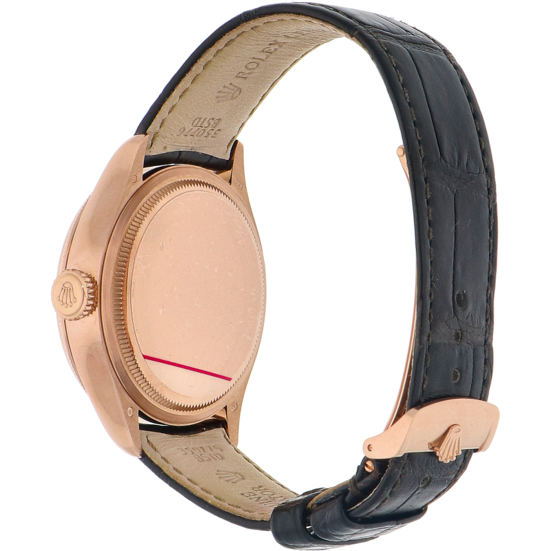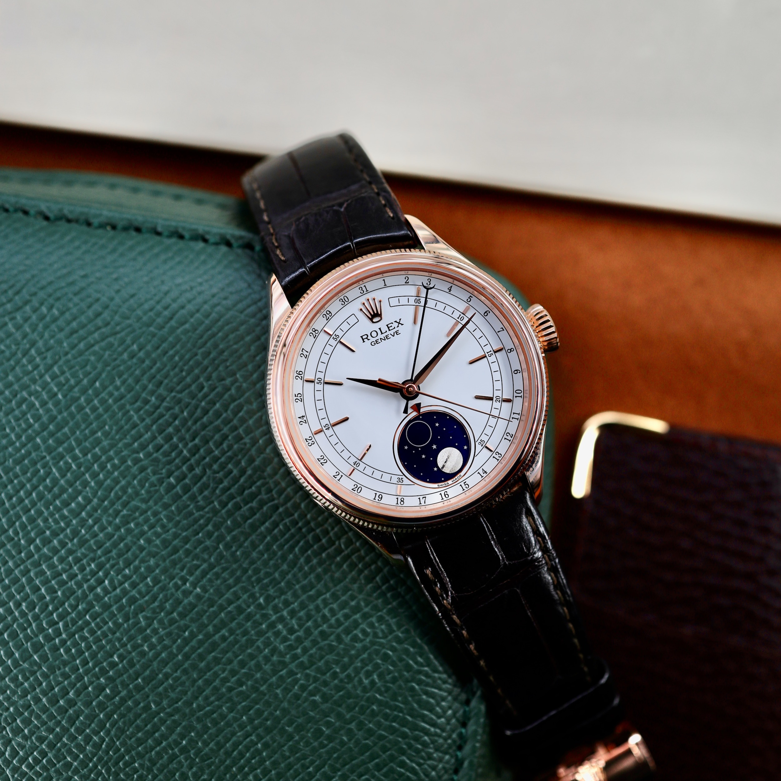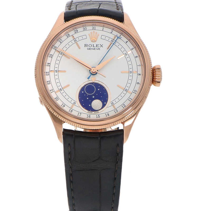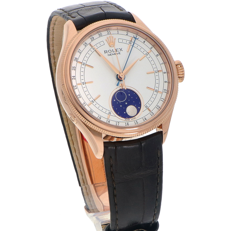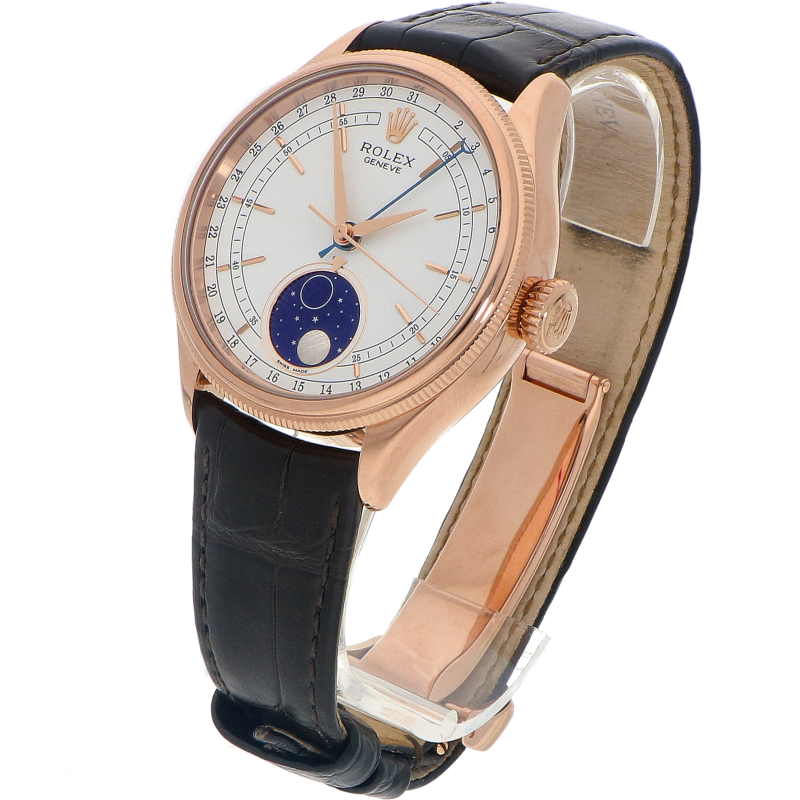 Reference 50535 is an elegant and complex dresswatch model, part of the Rolex Cellini collection. This is one of the few modern Rolex models with a moonphase indicator. The watch is made of 18-carat Everose gold (Rolex's patented alloy roségud). The diameter of the case is 39mm. The white lacquered dial shows the following functions: hours, minutes, seconds, date (via central blued steel hand) and a moon phase. The latter is a very prominent feature at 6 o'clock, with a blue enameled disc. The moon is made of a small piece of meteorite. The watch is powered by automatic movement cal. 3195 and comes on a classic alligator leather strap with an 18-karat Everose gold folding clasp.