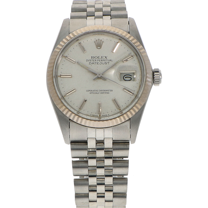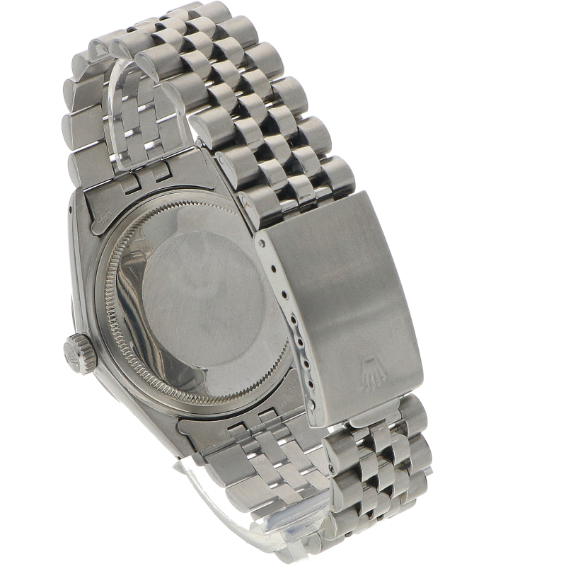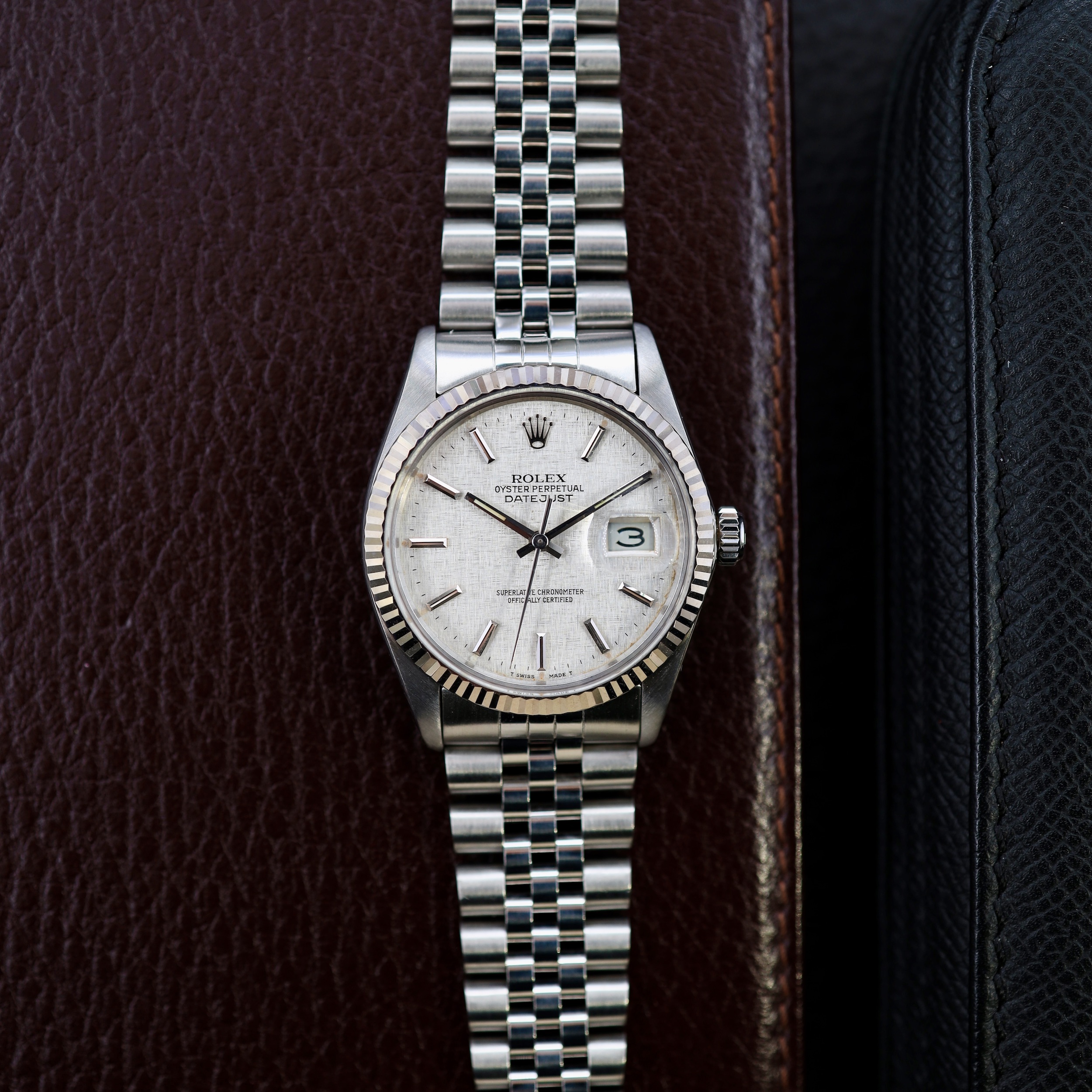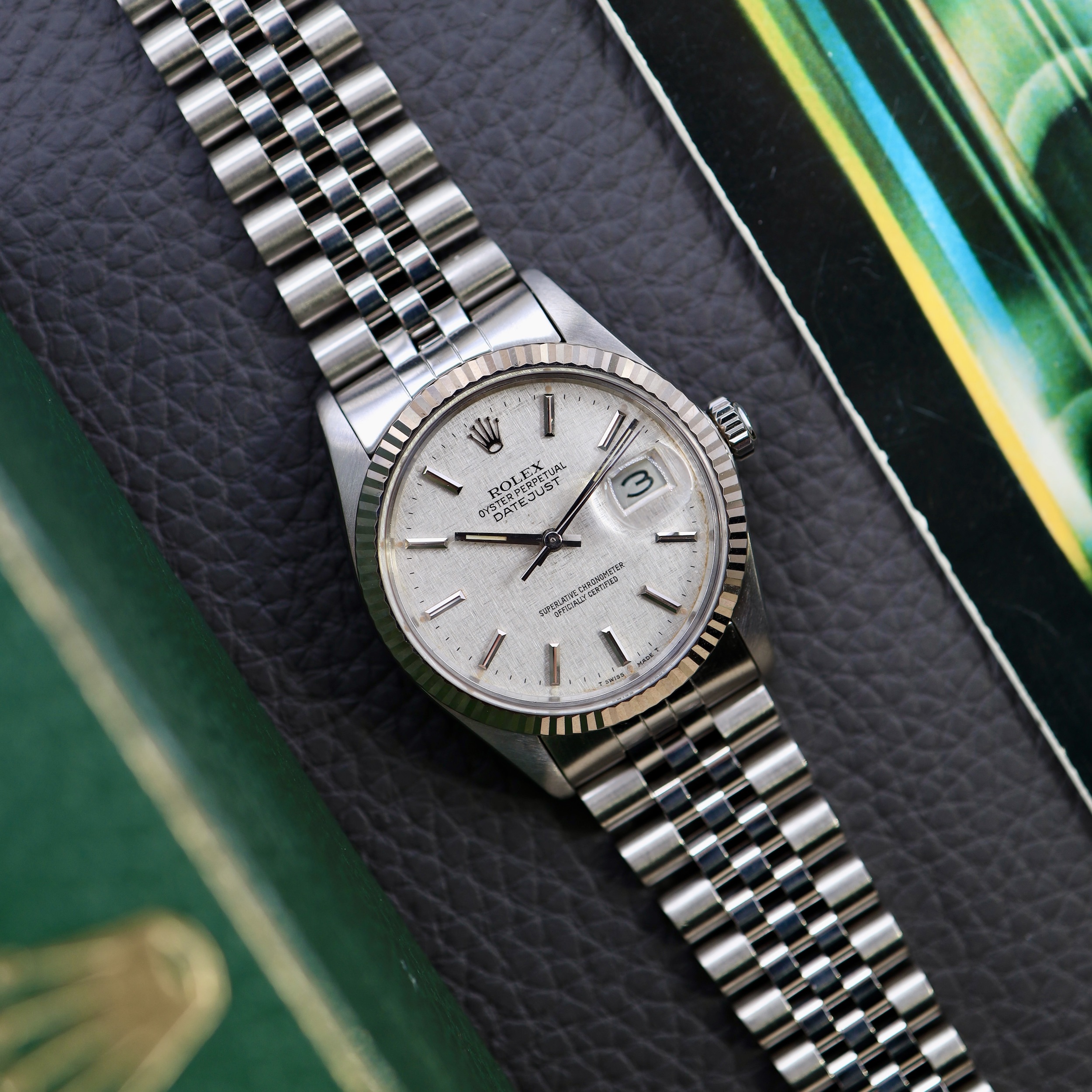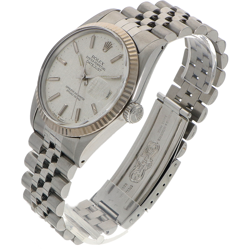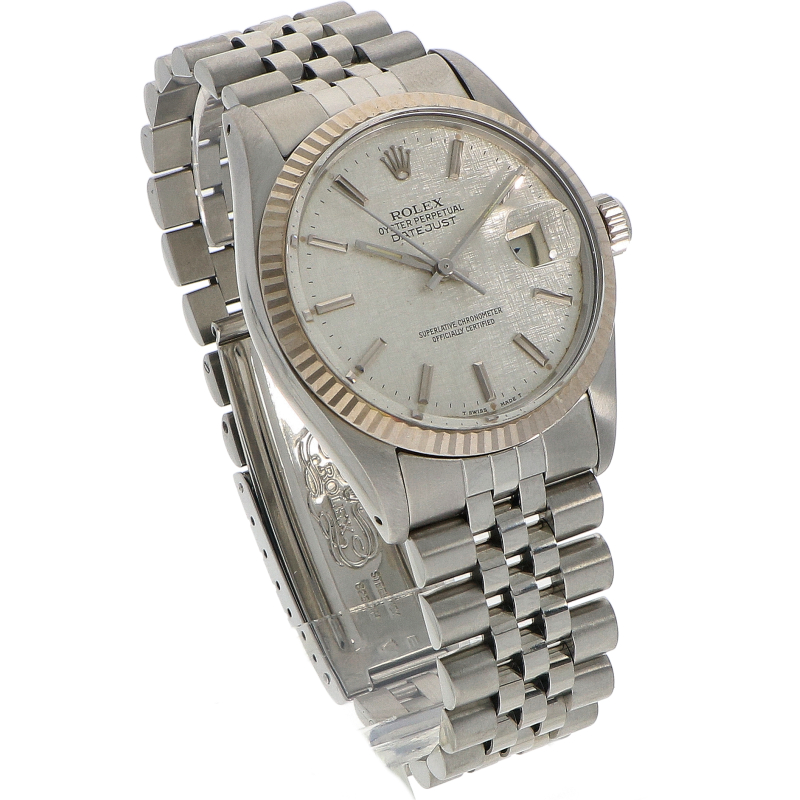 This Rolex DateJust reference 16014 features a stainless steel Oyster case (36 mm), a stainless steel Jubilee bracelet with five links, and an elegant 18K white gold bezel. The watch is powered by a perpetual movement cal. 3035 and has a date function. What makes this watch special, however, is the dial, which is finished with a fine, regular texture reminiscent of woven linen fabric or canvas (hence the nickname 'Linen Dial').