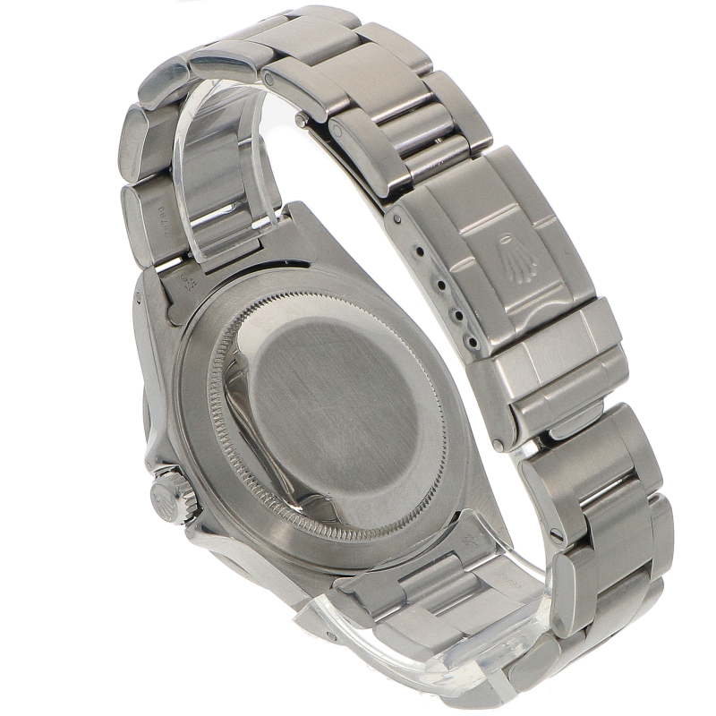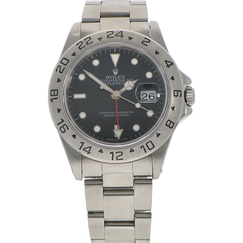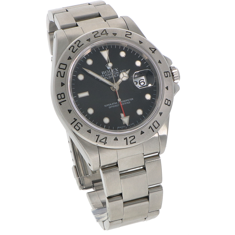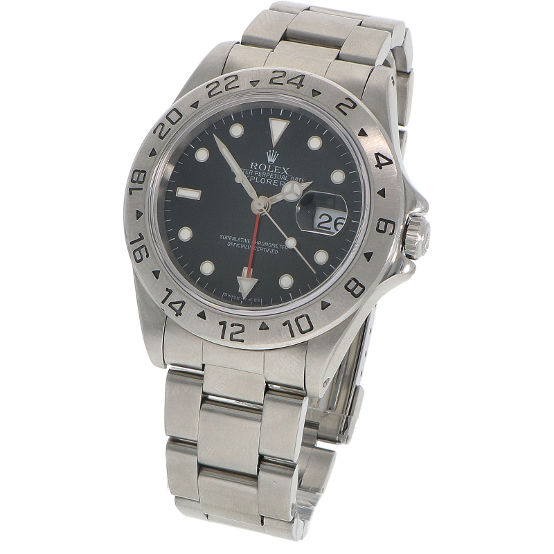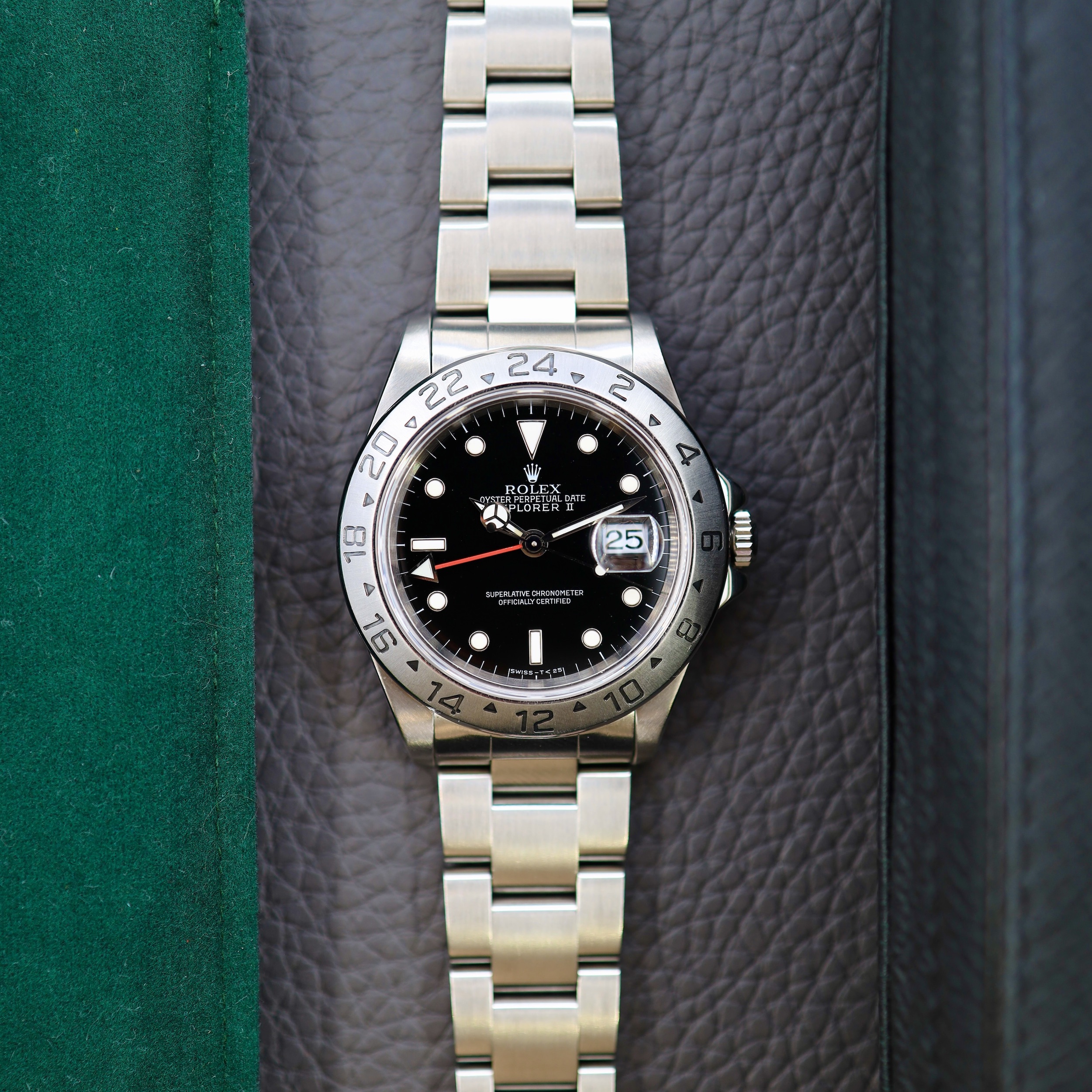 Rolex Explorer II had been introduced in 1971, when reference 1655 saw the light of day. Reference 16570 is what collectors now call Neo-Vintage. This watch has a black dial with Tritium hour markers and a red 24-hour hand. The case (40mm), brushed steel bezel and steel strap are in good condition.