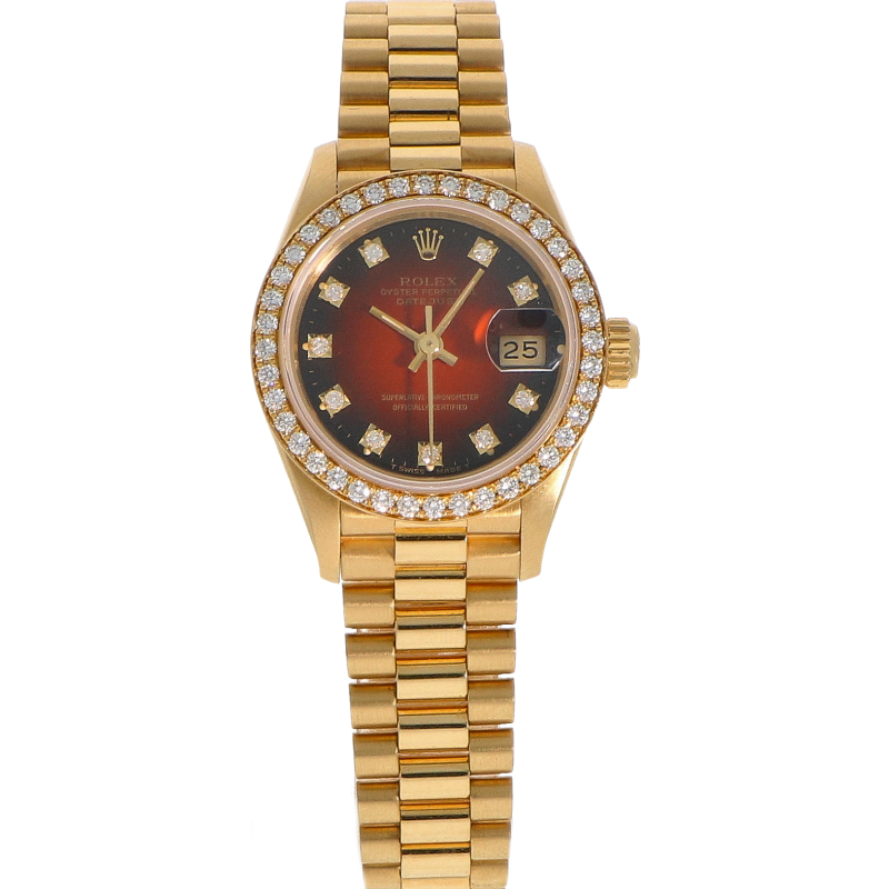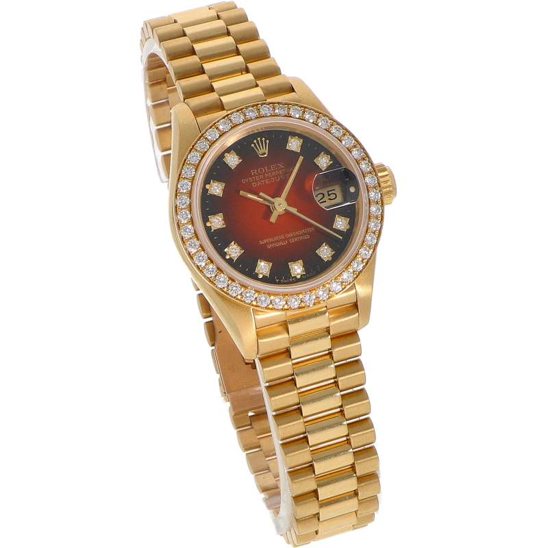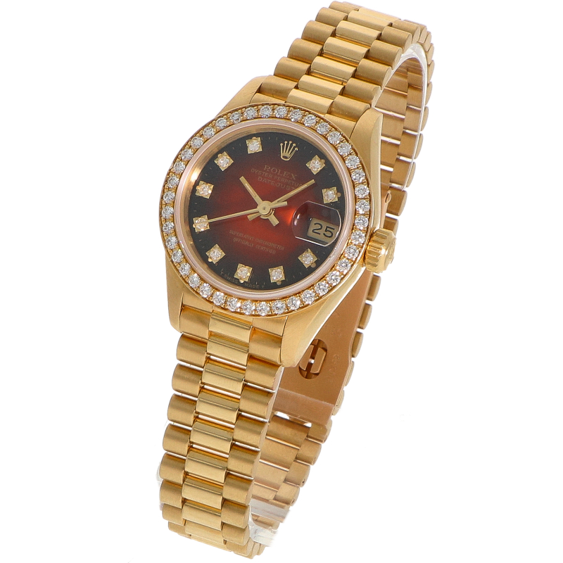 Ref. 69138 is an exceptionally luxurious version of the Lady-DateJust (26mm). The watch is executed in 18-karat yellow gold and delivered on the famous President strap. The most defining feature of this watch is the dial with a vignette effect and diamond hour markers. Vignette refers to the technique in which the color of the dial subtly transitions, in this case from bright red to almost black toward the edges. This watch also features a special diamond-set bezel. The small, perfectly cut diamonds surrounding the case catch the light and provide unparalleled brilliance.