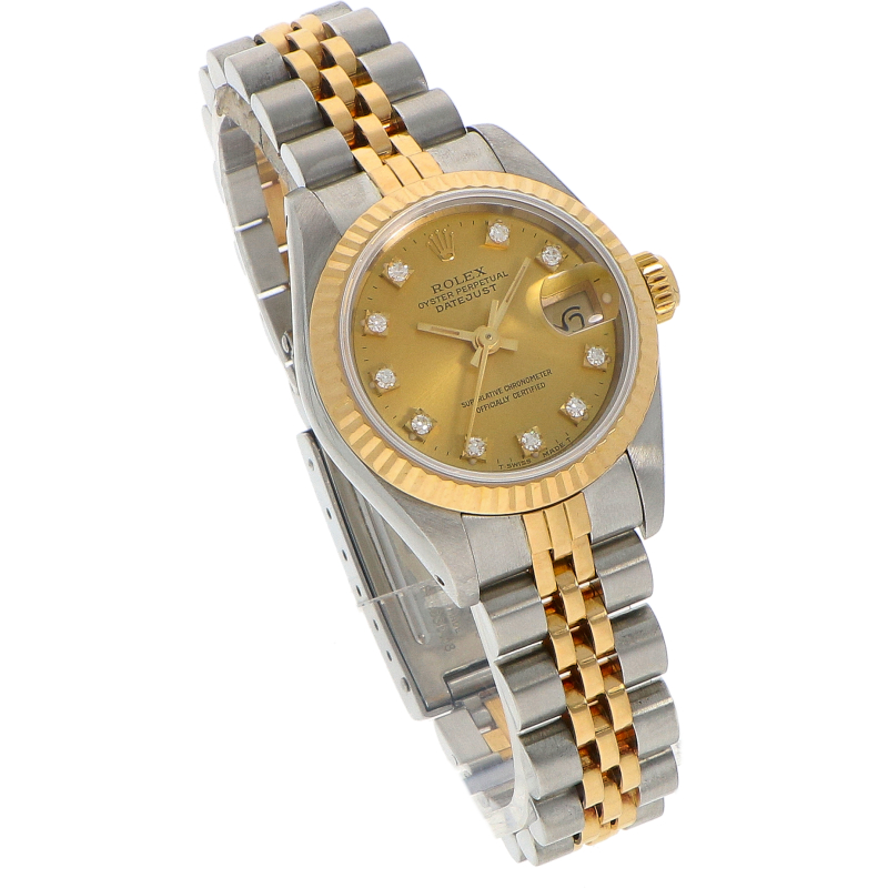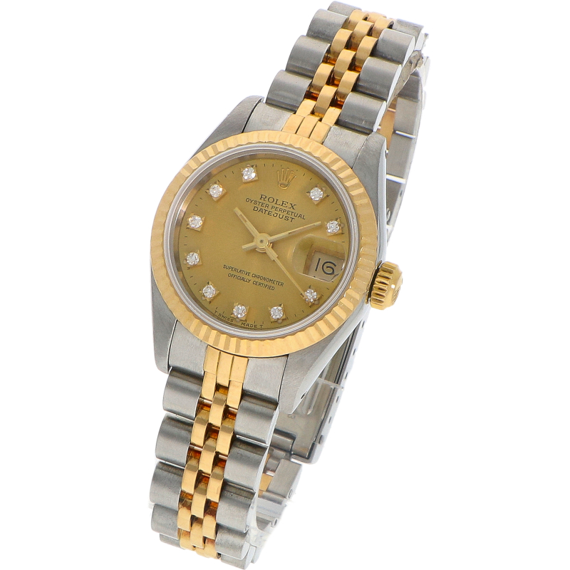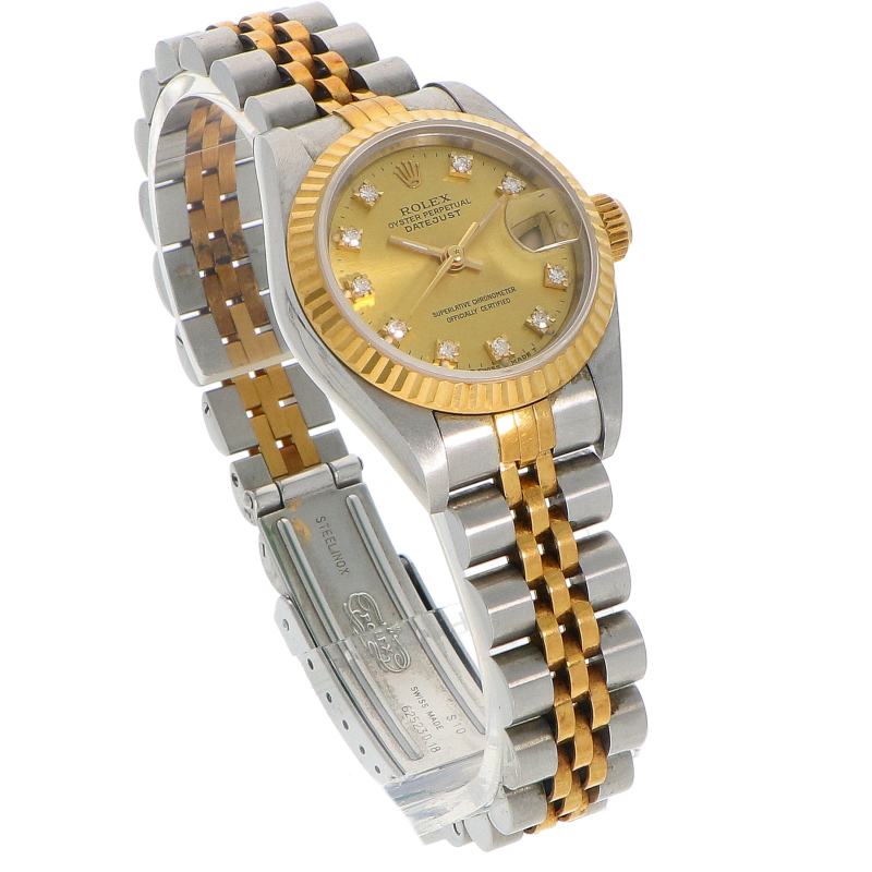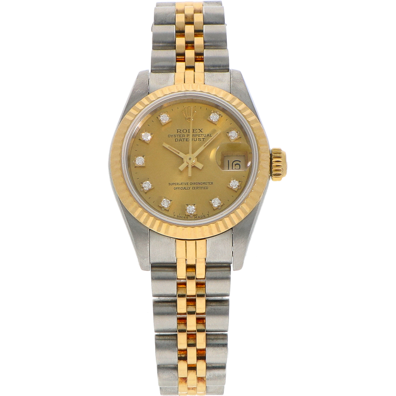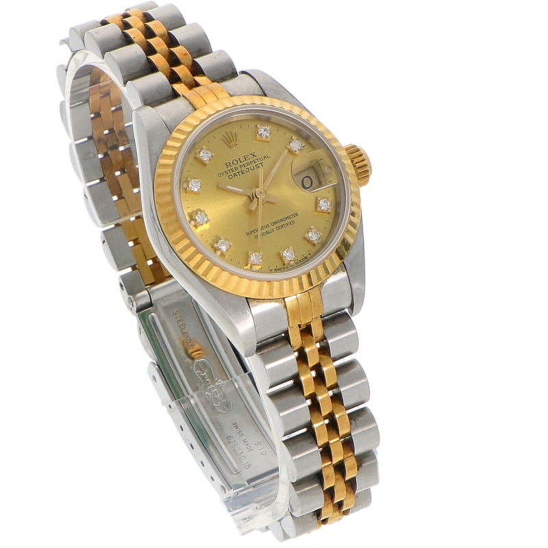 Stainless steel watch case (26mm) with 18K yellow gold fluted bezel. Very special champagne gold dial with sparkling diamond hour markers. Scratch-resistant sapphire crystal. Automatic movement with date (cal. 2135). Stainless steel and 18K yellow gold Jubilee strap with a folding clasp.