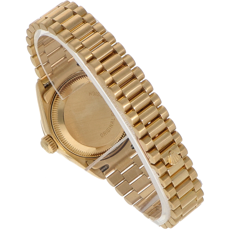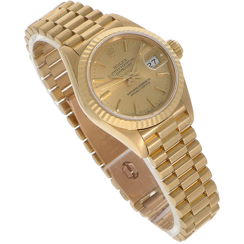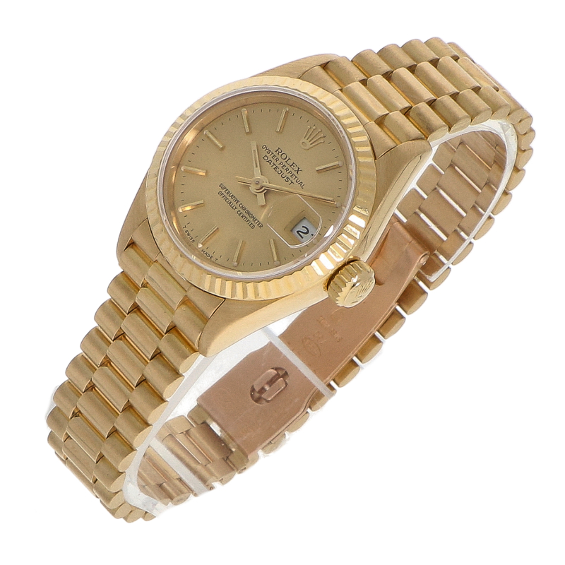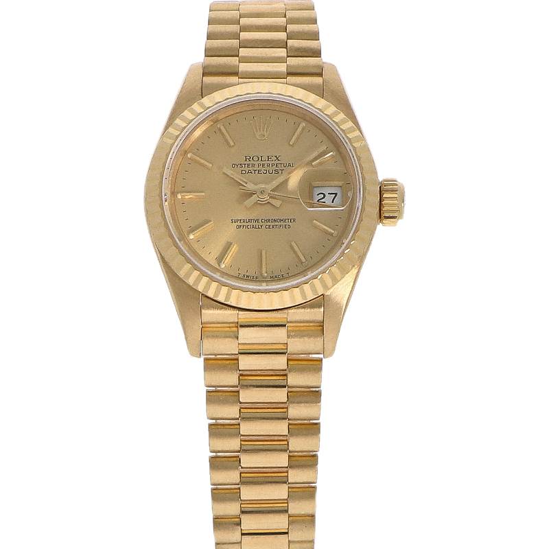 Ref. 69178 is the all-gold version of the 26mm DateJust. The champagne gold dial features minimalist stripe hour markers. The watch is powered by a cal. 2135 automatic movement and comes on the famous President strap with a Crownclasp clasp.