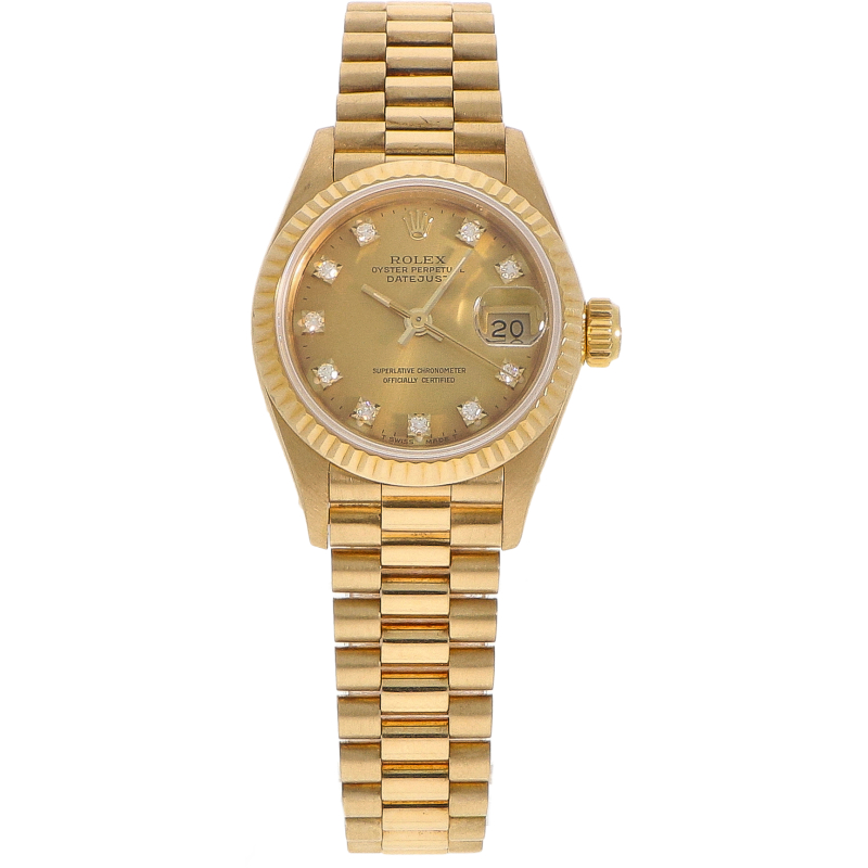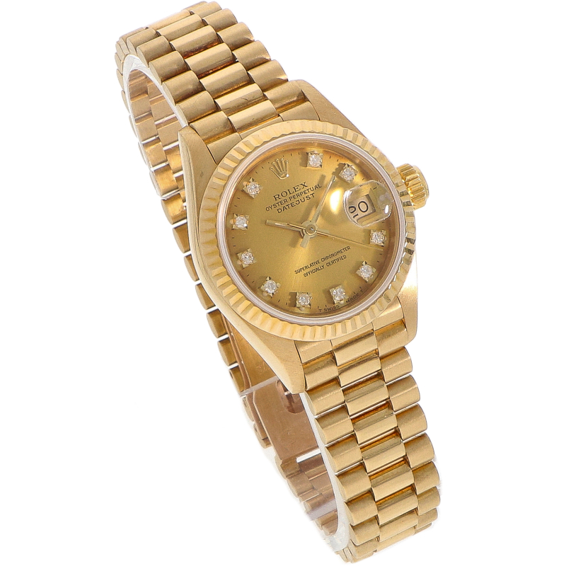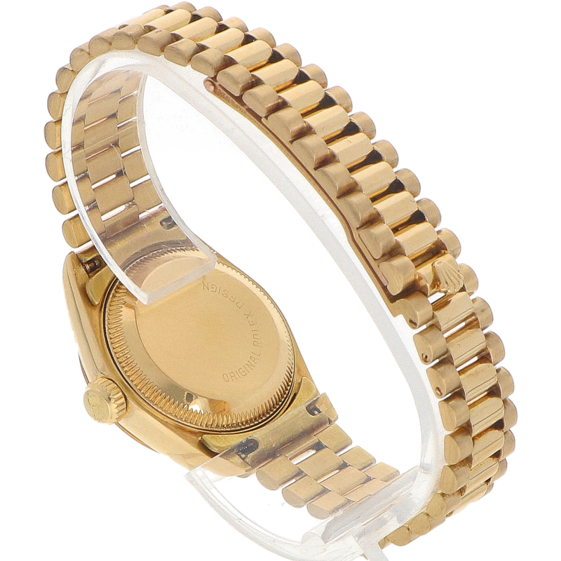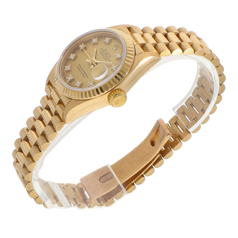Ref. 69178 is made entirely of 18-karat yellow gold. The case has a diameter of 26mm. The champagne gold dial features diamond hour markers. The watch is powered by an automatic movement cal. 2135 and comes on the prestigious President strap.