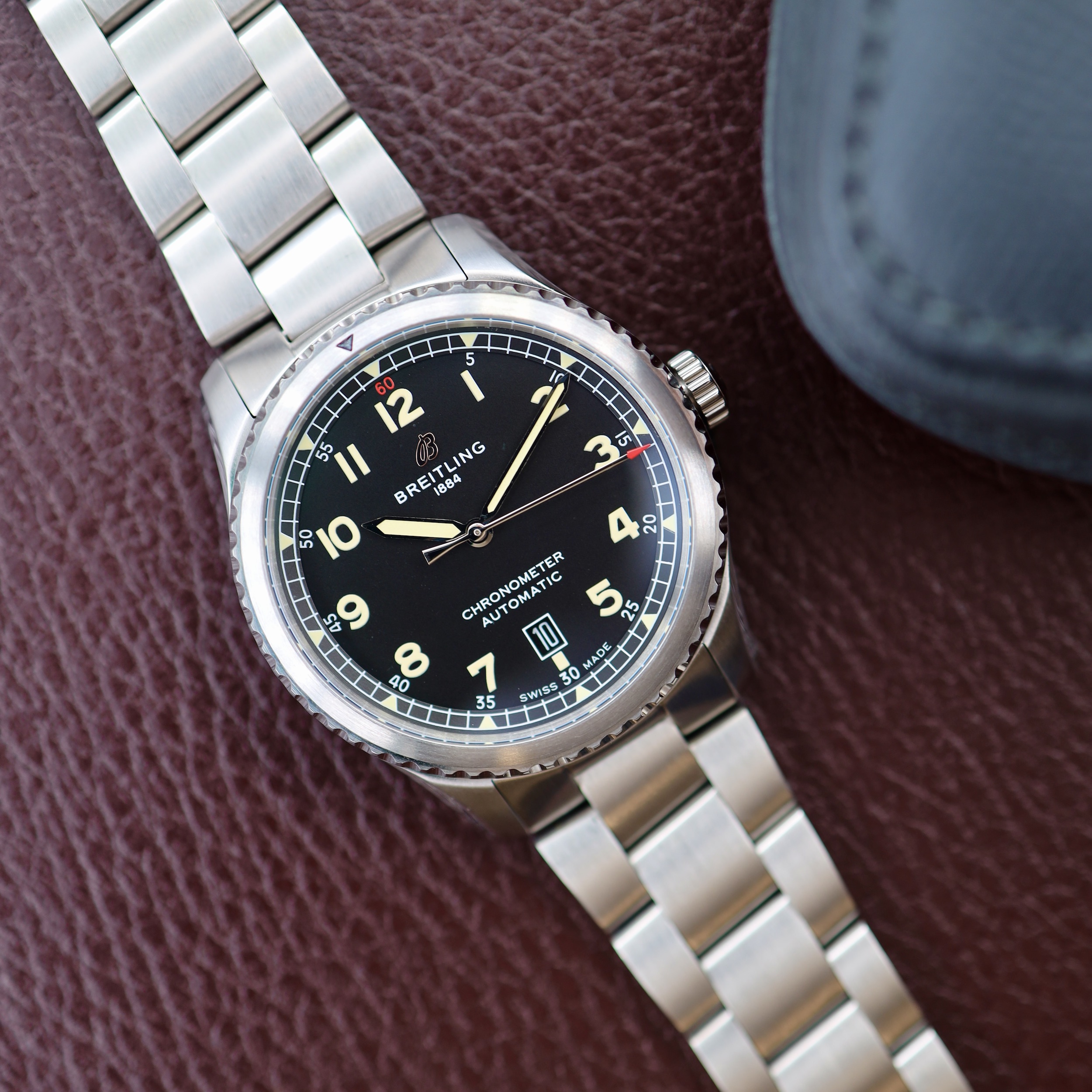 De Aviator 8 is geinspireerd op de ‘Huit Aviation Department’ van Breitling, opgericht in de jaren ’30 om boordinstrumenten voor vliegtuigen te maken. Met een diameter van 41mm is het een aanzienlijk horloge. De gesatineerde afwerking op de kast geeft het een stoere, militaire uitstraling. De wijzerplaat kenmerkt zich door grote Arabische cijfers en een duidelijke ‘spoorweg’ minuten- track. De datumweergave bevindt zich op de 6- uur positie. Het horloge is voorzien van een bidirectionele bezel en wordt aangedreven door een automatisch uurwerk. Geleverd op een stoere piloten armband.