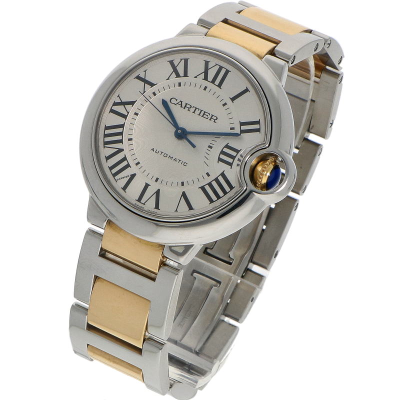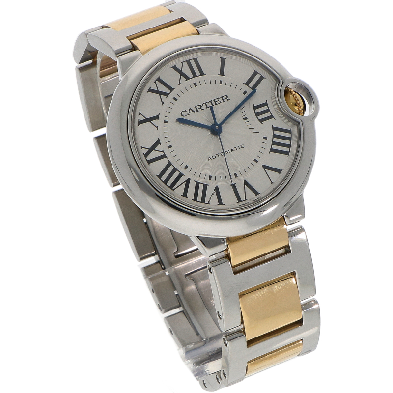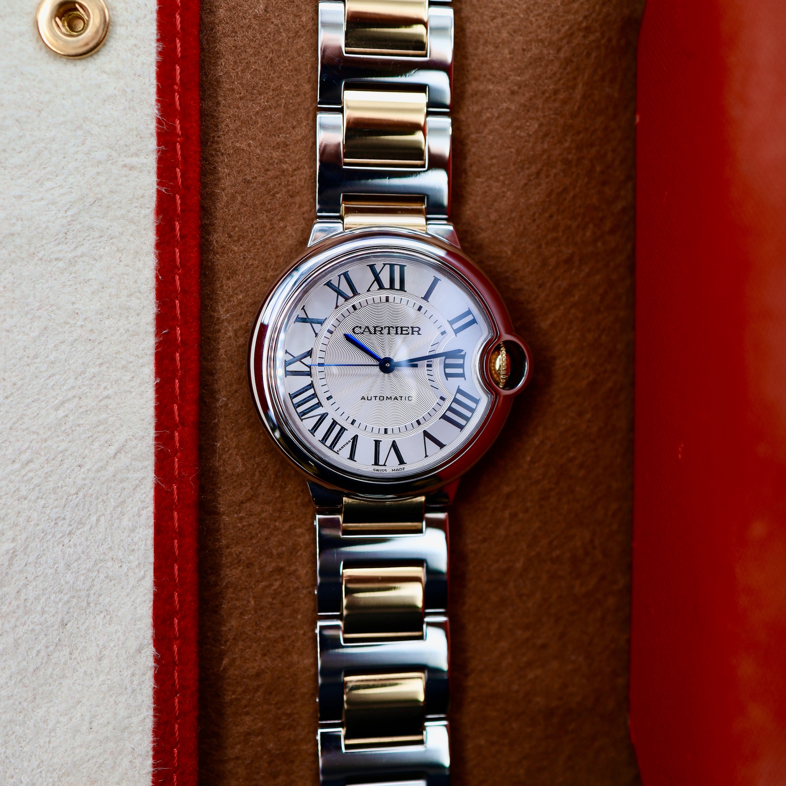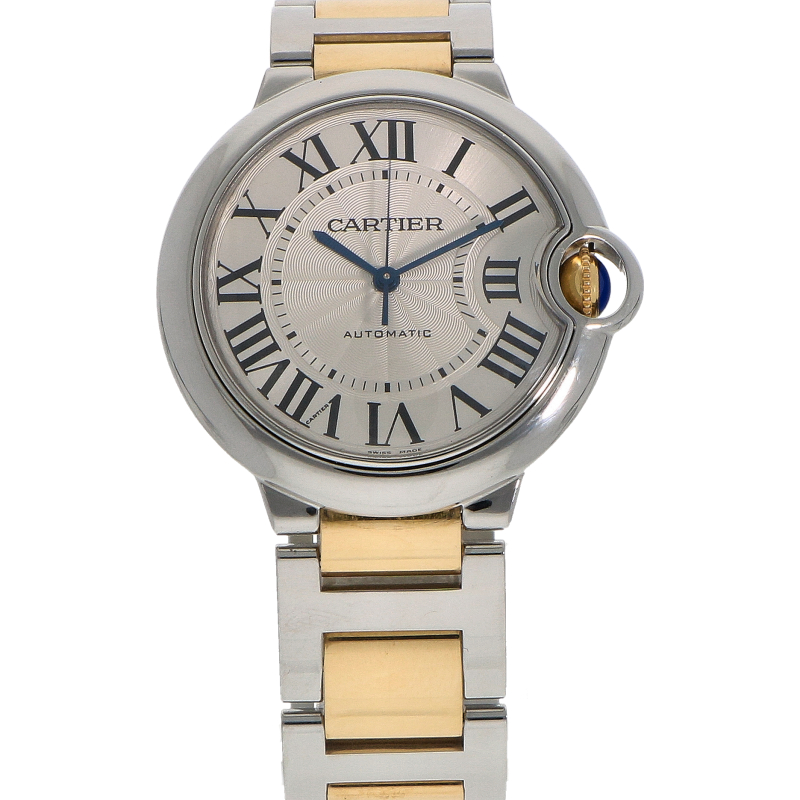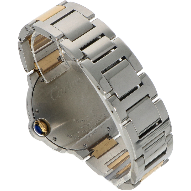 Het ontwerp van de Ballon Bleu- serie is geïnspireerd op een zwevende ballon, wat resulteert in een kast die zowel aan de boven- als onderkant licht bolvormig is. Met een diameter van 36mm is dit een perfecte ‘mid-size’ maat. De kast is volledig gepolijst roestvrij staal met een 18- karaats geelgouden kroon. Het meest iconische detail is de blauwe saffier-cabochon die in de kroon is geplaatst. De kroon wordt beschermd door een metalen boog die in de kast is geïntegreerd. Het horloge os voorzien van een klassieke Cartier- wijzerplaat: zilveren met een guilloché- patroon, zwarte Romeinse cijfers en zwaardvormige wijzers uitgevoerd in geblauwd staal. Dit model is uitgerust met de gepolijste goud/stalen schakelarmband, die zeer soepel op de pols valt en sluit met een onzichtbare dubbele vouwsluiting. Aangedreven door een automatisch urwerk.