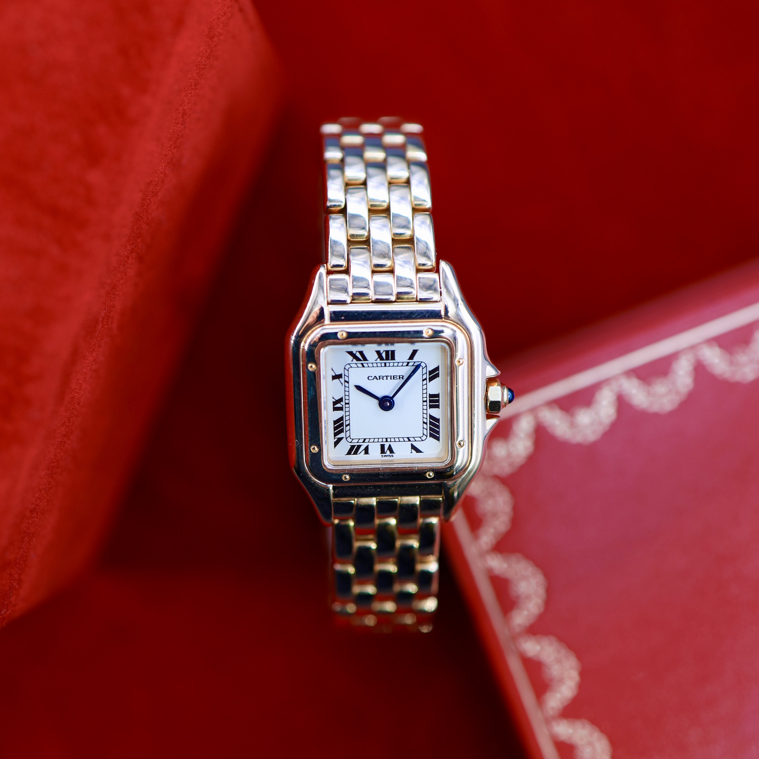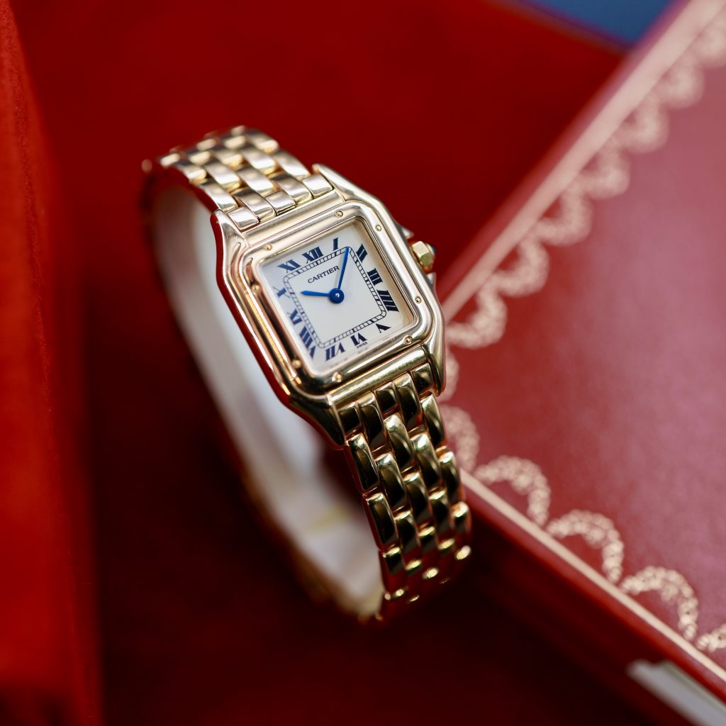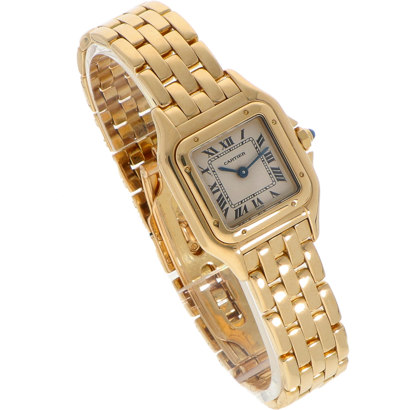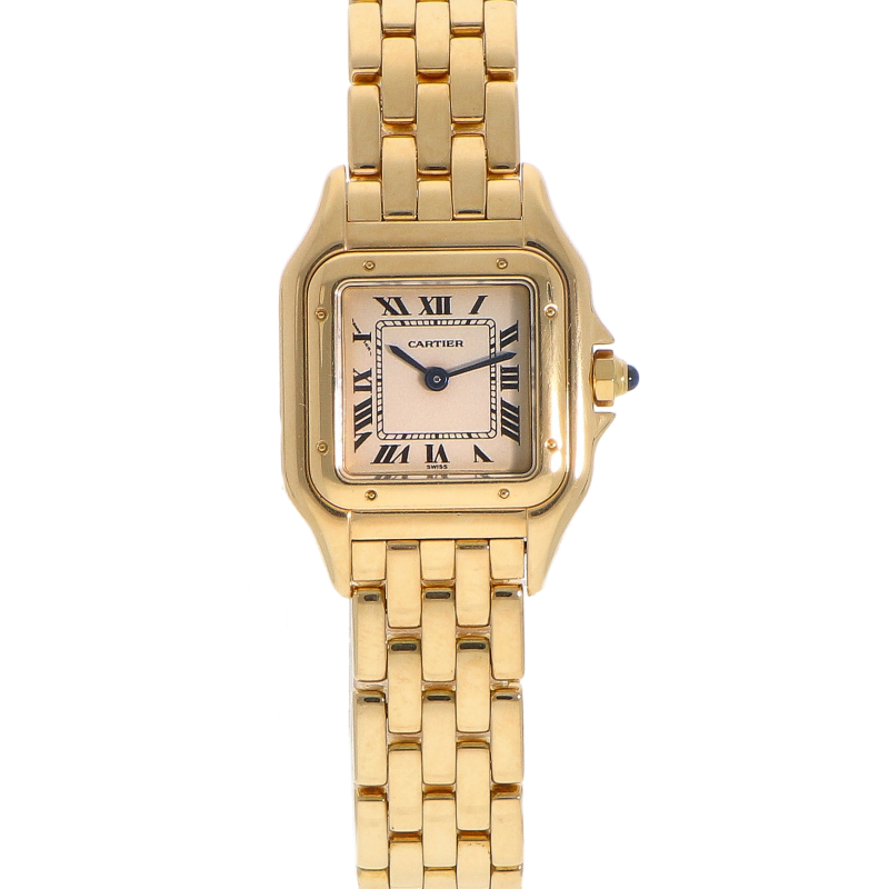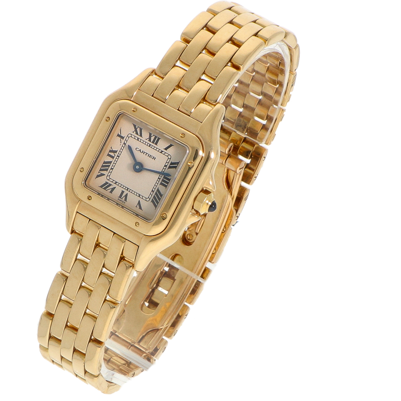Cartier Panthère ref. 8669 is een van de meest iconische dameshorloges uit de jaren ’80 en ’90. Dit specifieke referentienummer staat synoniem voor de klassieke, volledig gouden uitvoering. Het is een ‘Small Model’ – de afmetingen van de kast zijn 22 x 30mm. De wijzerplaat heeft een typische Cartier- esthetiek: zwarte Romeinse cijfers, een spoorweg- minuutmarkering en geblauwde zwaardvormige wijzers. Het horloge wordt aangedreven door een quartz uurwerk. Geleverd op de wereldberoemde Panthère armband met vijf rijen kleine schakels, die de souplesse van de bewegingen van een panter moeten nabootsen.