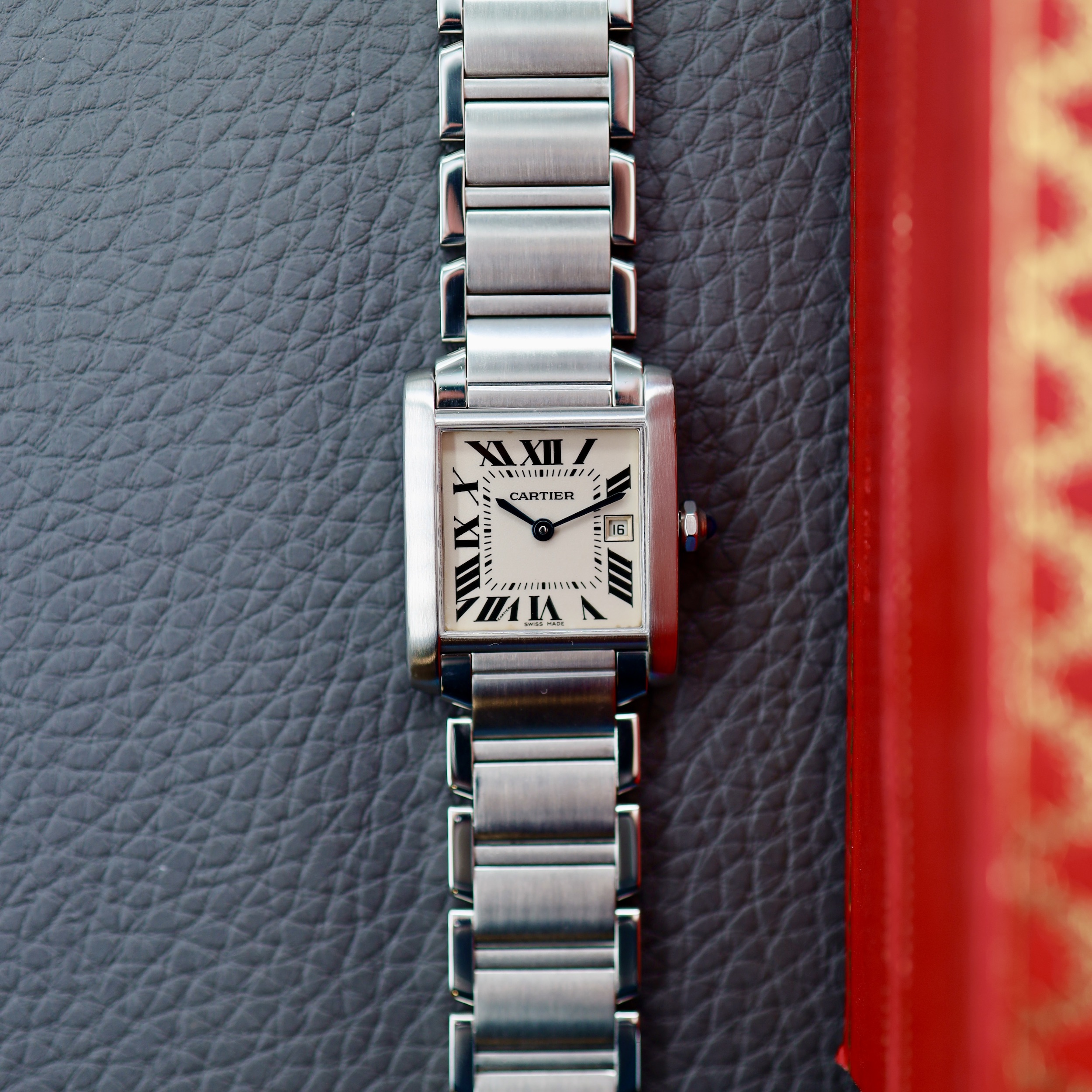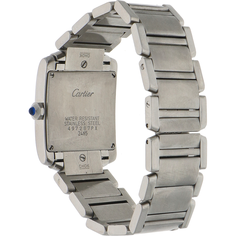 Dit is een medium model van de populaire Cartier Tank Française: de afmetingen van de kast zijn 25 x 30mm. Het meest opvallende kenmerk is de robuuste schakelband, die is volledig geïntegreerd met de kast. De wijzerplaat is klassiek Cartier met zwarte Romeinse cijfers en geblauwde stalen zwaardwijzers. Een specifiek kenmerk van deze referentie is de datumweergave op de 3- uur positie. Dit model wordt aangedreven door een quartz uurwerk.