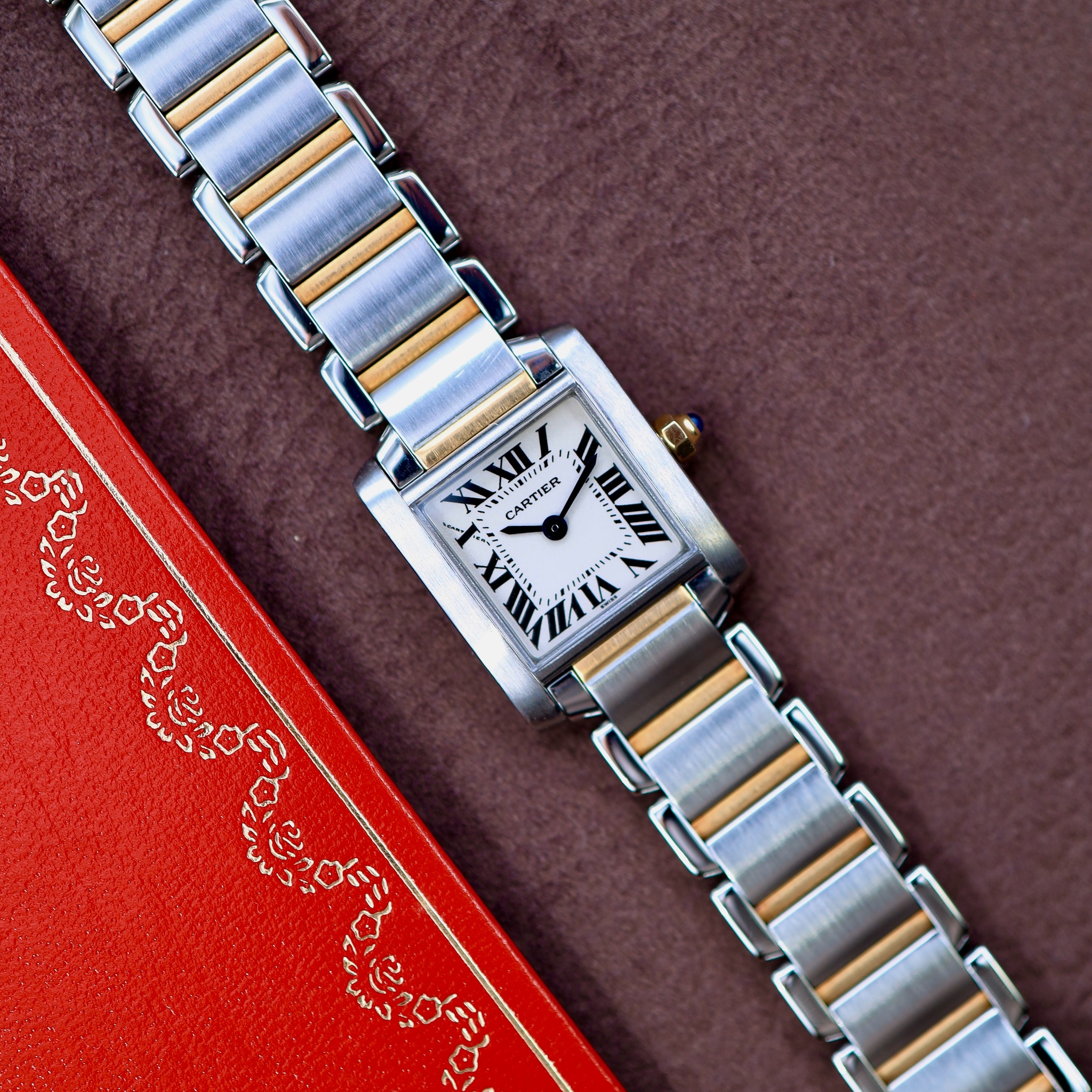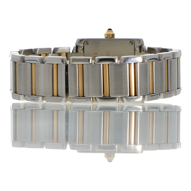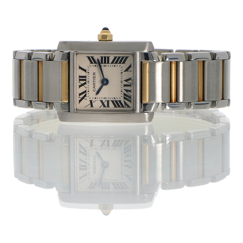 Ref. 2300 is de kleine maat van de Tank Française – de kast heeft een diameter van 20mm. De kast is gemaakt van roestvrij staal en heeft een geelgouden kroon bezet met een saffier. De witte wijzerplaat is voorzien van de klassieke zwarte uurmarkeringen en geblauwde stalen zwaardwijzers. Het horloge wordt aangedreven door een quartz uurwerk. Het mooiste detail van dit horloge is wel de ’two-tone’ geïntegreerde armband. De schakels zijn geïnspireerd op de rupsbanden van een leger- tank. De armband is heel soepel in valt mooi om de pols.