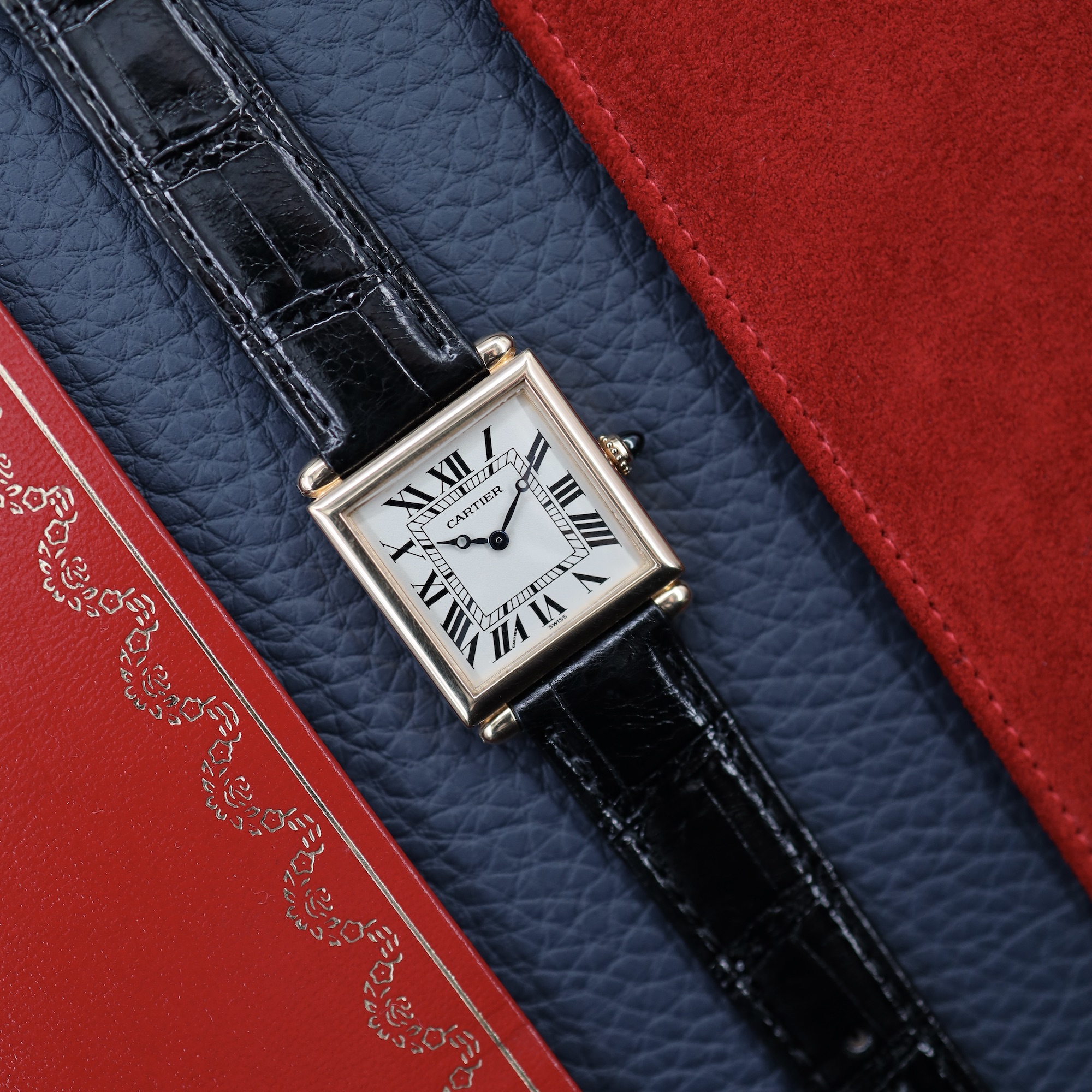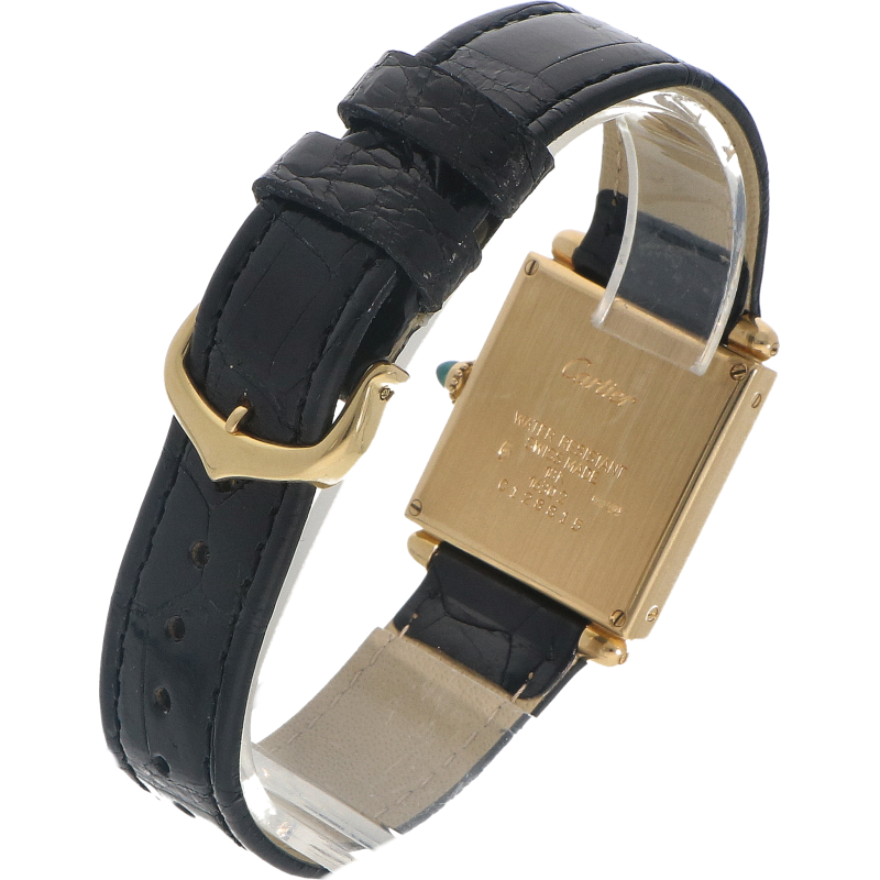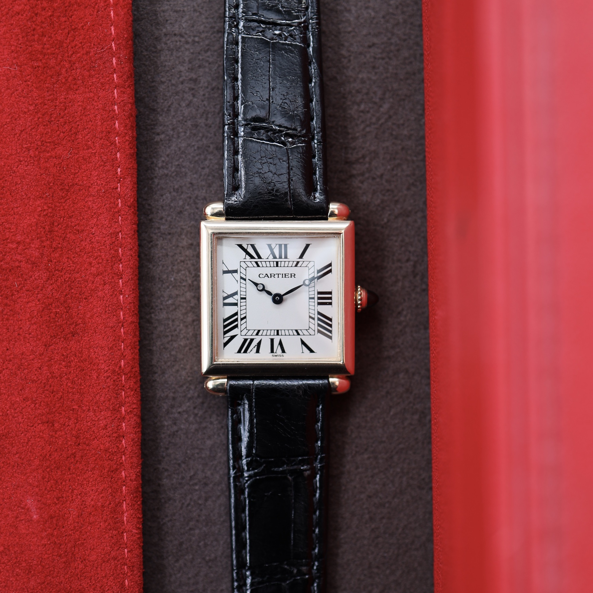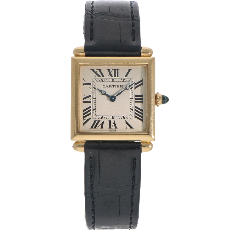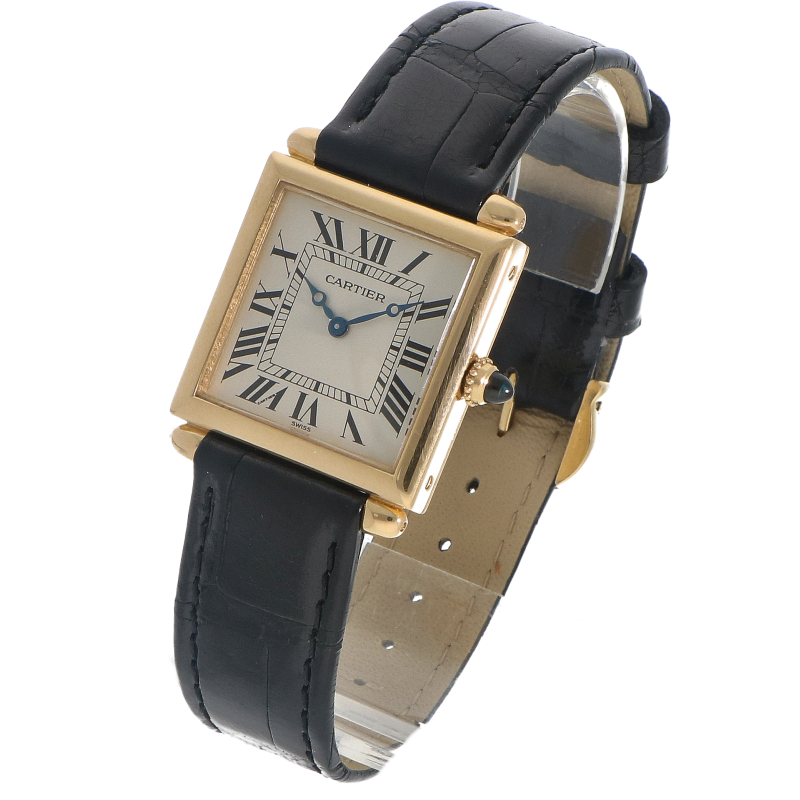 18k geelgouden kast met een diameter van 24x24mm Dit exemplaar is voorzien van een romig zilverkleurige wijzerplaat met zwarte Romeinse cijfers. De geblauwde Breguet-wijzers en de kroon met blauwe cabochon geven het geheel een elegante uitstraling. Voorzien van een nieuwe lederen band uit eigen collectie met originele 18k gouden Cartier gesp.