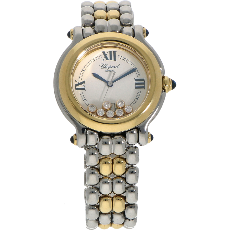 Ref. 8249 is een iconisch horloge dat luxe combineert met een speelse, sportieve elegantie. Het meest kenmerkende element zijn de ‘Happy Diamons’: zeven lossen diamanten die zich tussen de twee lagen saffierglas bevinden. Ze glijden over de wijzerplaat bij elke beweging van de pols, zonder de wijzers te hinderen.Dit model heeft een klassieke ronde kast met een diameter van 32mm. De kast is vervaardigd uit hoogwaardig gepolijst roestvrij staal en heeft een 18- karaats geelgouden bezel. De witte wijzerplaat heeft zwarte Romeinse cijfers op de kwartieren, geblauwde stalen zwaardwijzers en een datum venster op de 6 uur positie. Een luxueus detail zijn de blauwe saffieren cabochons die op de vier lugs van de kast en op de kroon zijn geplaatst. Het horloge wordt aangedreven door een quartz uurwerk. Geleverd op een staal/gouden ‘beads-of-rice’ band.