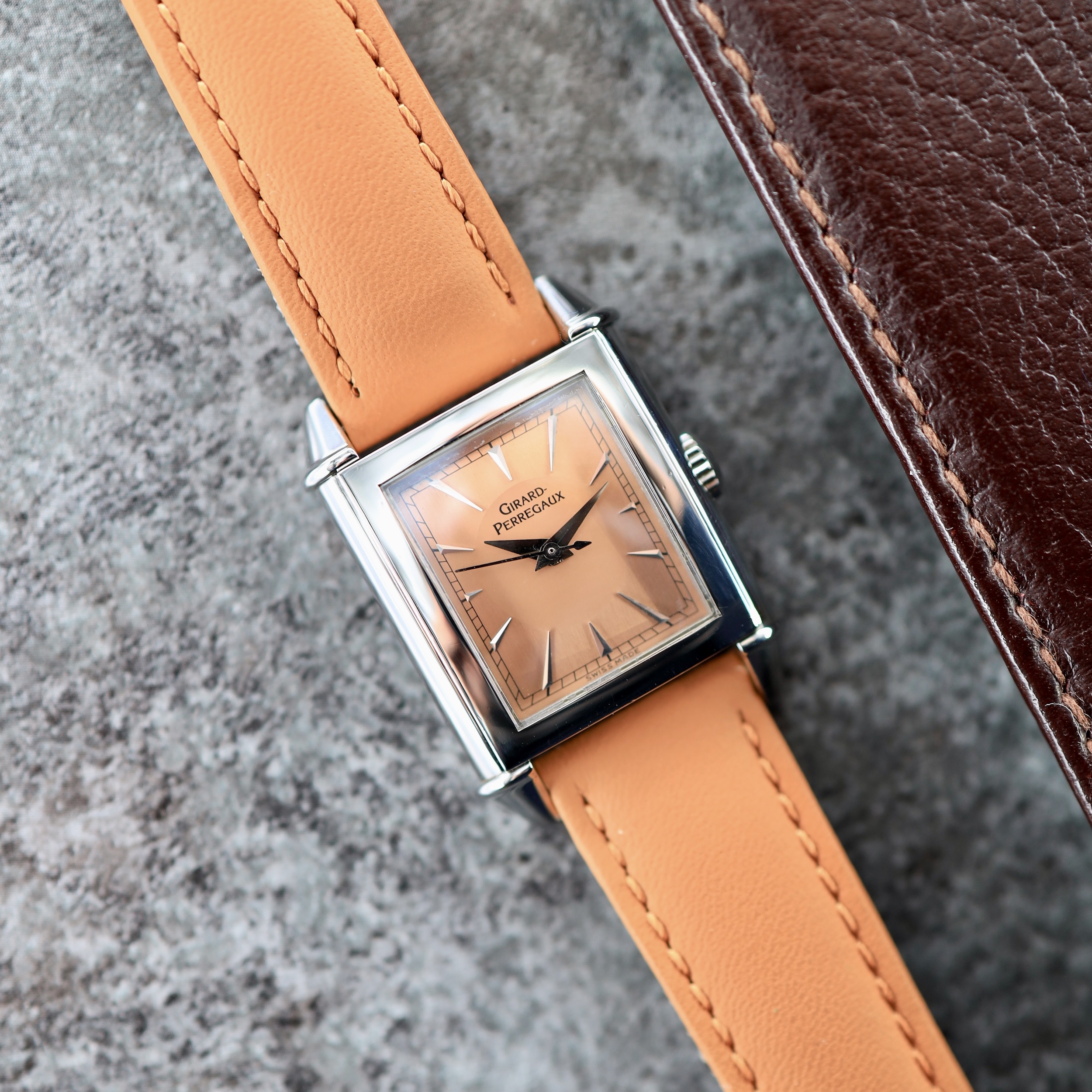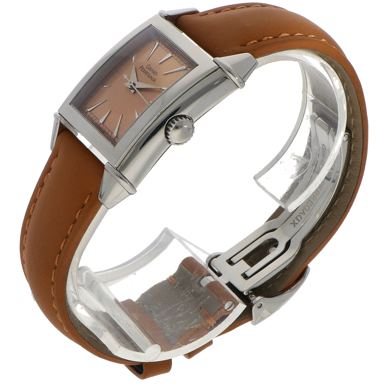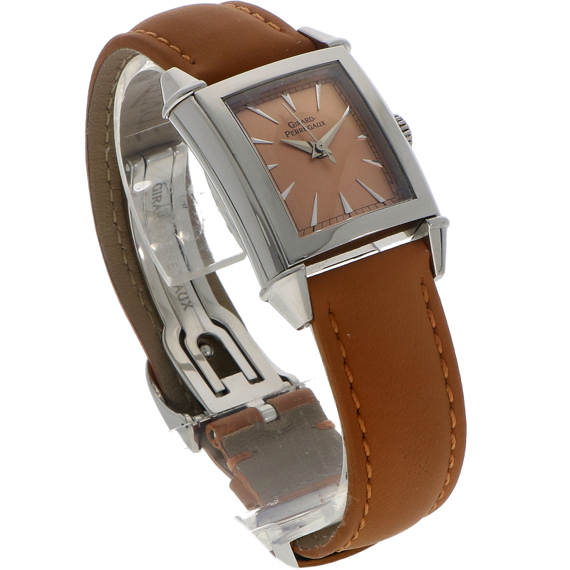 De Girard Perregaux 2591 is een onderdeel van de Vintage 1945 collectie en is een prachtig voorbeeld van de Art Deco- revival waar dit Zwitserse horlogehuis om bekendstaat. Het is een horloge dat elegantie uitstraalt zonder te schreeuwen. Het heeft de iconische rechthoekige kast die aan de zijkanten licht gebogen is, waardoor het horloge zeer comfortabel om de pols zit. De kast meet circa 23 x 34mm. De kopperkleurige ’two-tone’ wijzerplaat is voorzien van elegante indexen en dauphine wijzers. Het horloge is uitgevoerd in edelstaal. Het wordt aangedreven door een quartz uurwerk en geleverd op een lederen band met een stalen vouwsluiting.