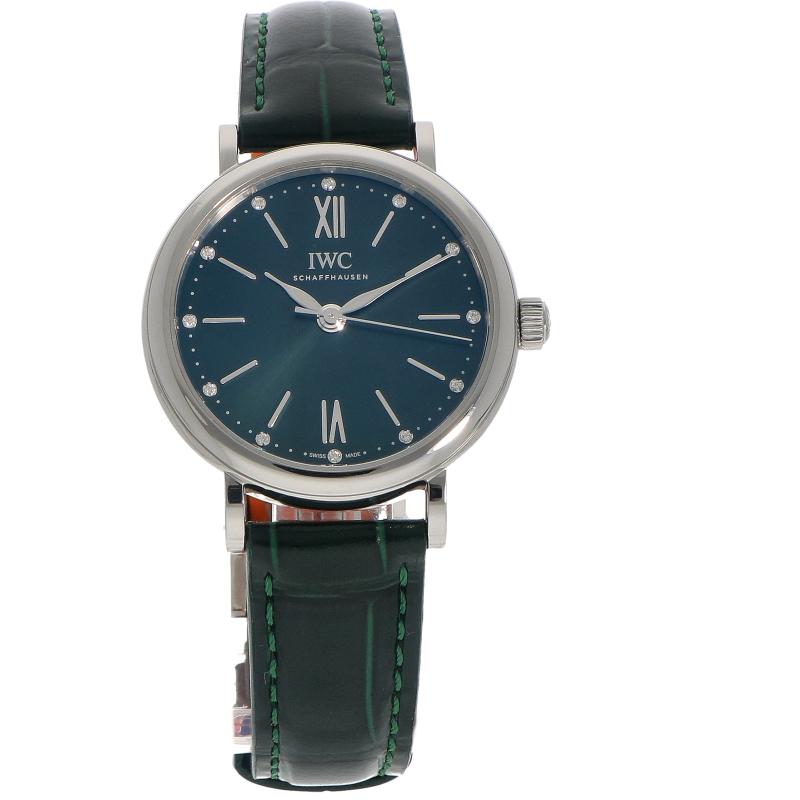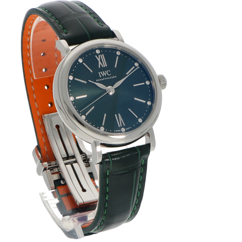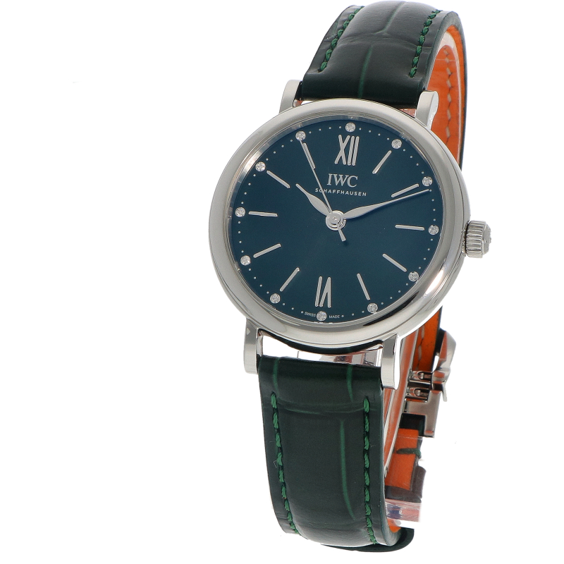 Ref. IW357405 is een van de meest verfijnde en vrouwelijke modellen binnen de Portofino- familie. De kast is gemaakt van hoogwaardig gepolijst roestvrij staal en heeft een diameter van 34mm. Dit model heeft een prachtige diepblauwe wijzerplaat met een ‘sunray’- finish en 12 glinsterende diamanten ernaast de uurmarkeringen. Dit horloge wordt aangedreven door een automatisch uurwerk. Geleverd op een lederen band met een vouwsluiting.