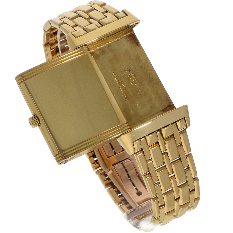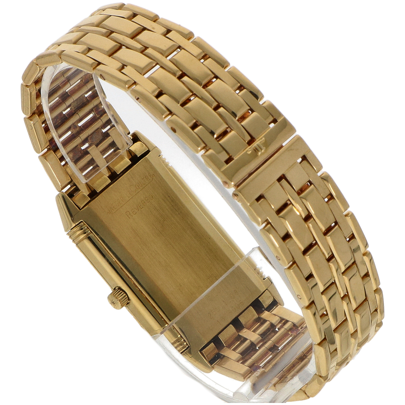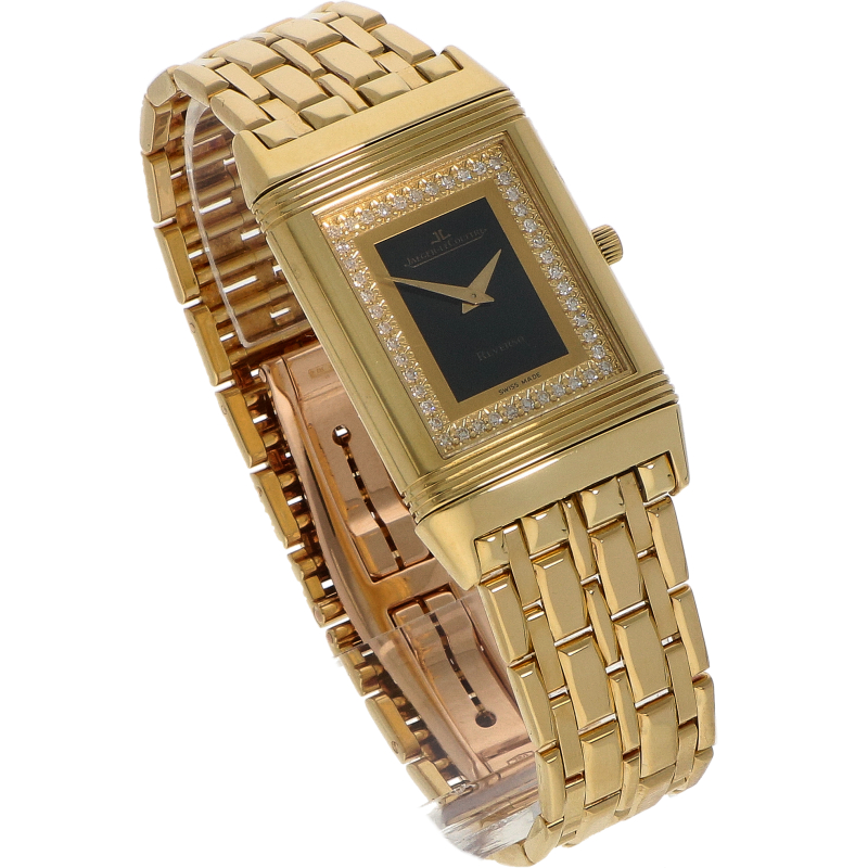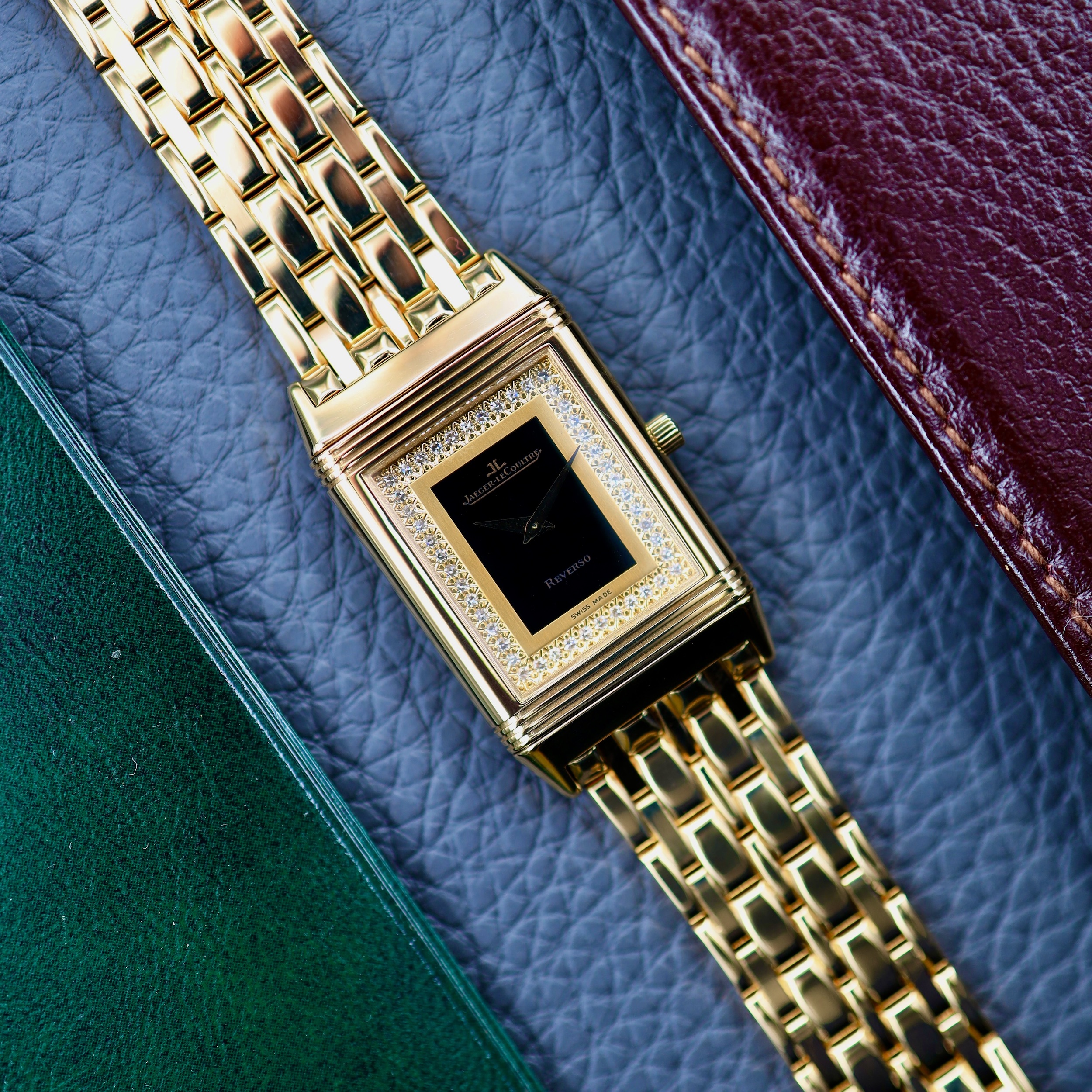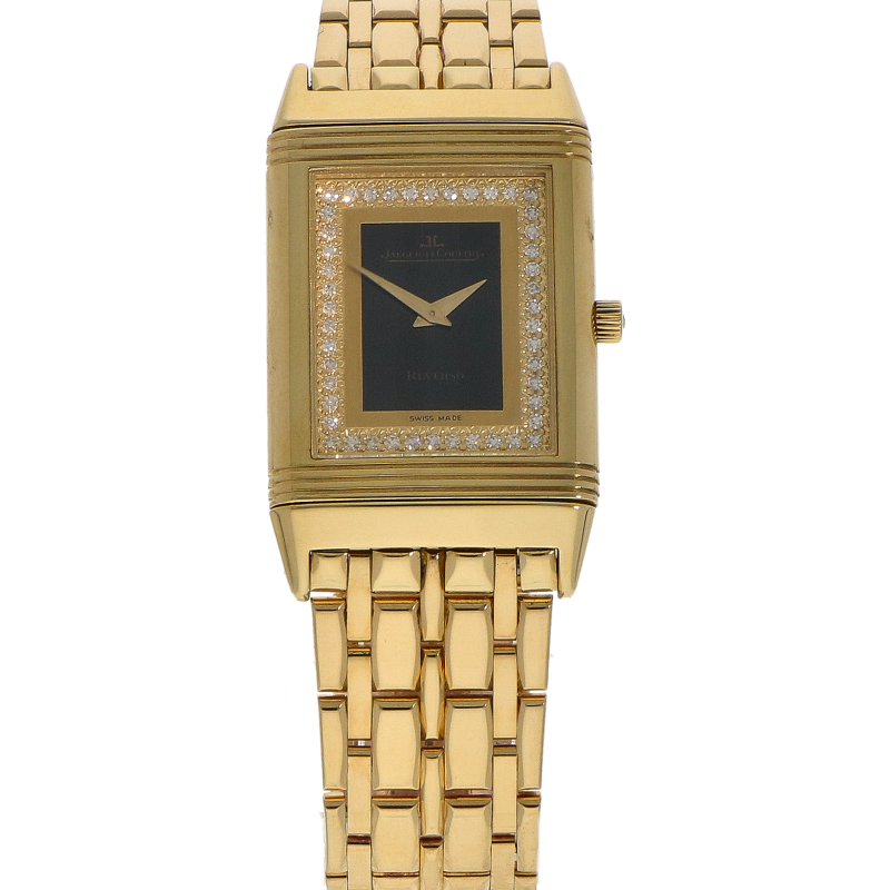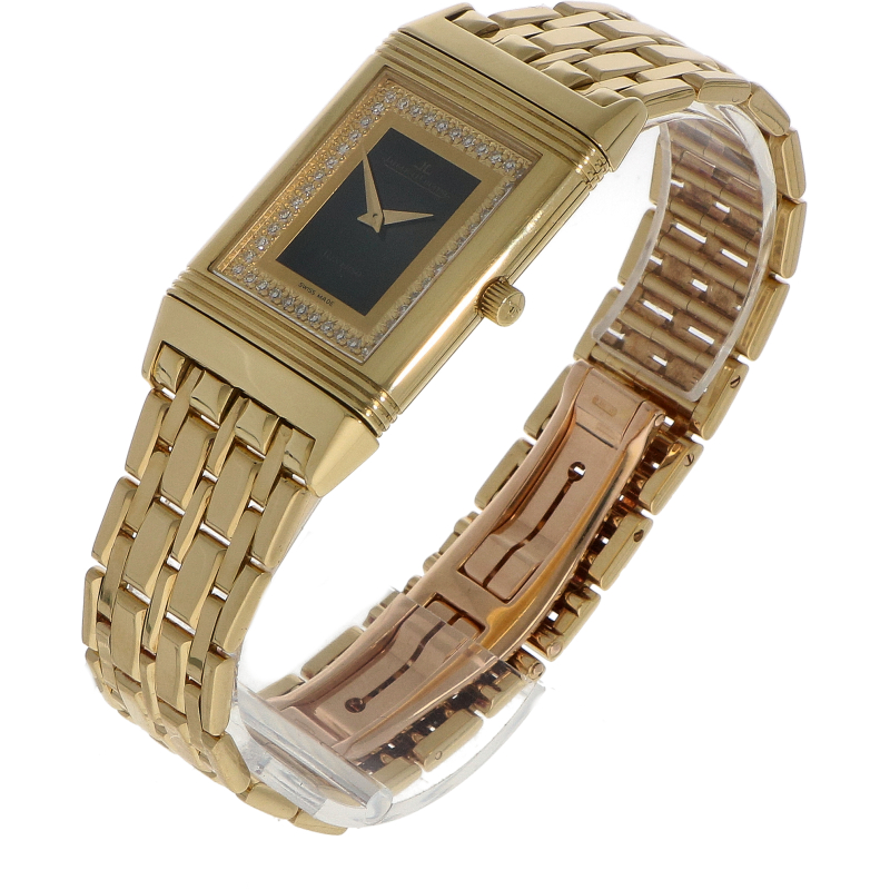 De Jaeger-LeCoultre Reverso Classique is een iconisch horloge dat de Art-Deco- stijl van de jaren ’30 belichaamt. De kast is gemaakt van 18- karaats geelgoud en heeft de kenmerkende rechthoekige vorm met de bekende gadroons. Het is een midsize model met afmetingen van 23 x 38mm. De achterzijde van de omkeerbare kast is van massief goud en leent zich uitstekend voor een persoonlijke gravering. Wat dit horloge extra bijzonder maakt is de zwart/goude wijzerplaat, die omringd is door een rij briljant geslepen diamanten. Dit specifieke model wordt aangedreven door een uiterst nauwkeurig quartz uurwerk. Geleverd op een 18- karaats geelgouden armband.