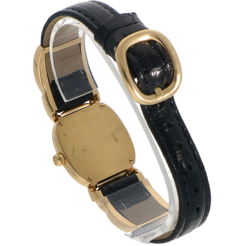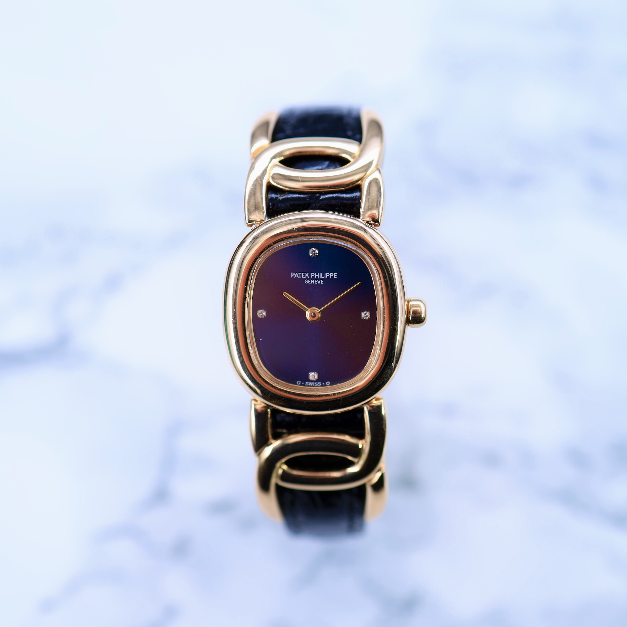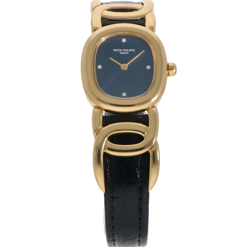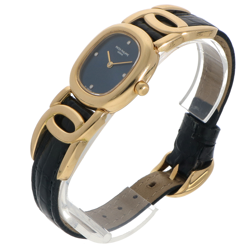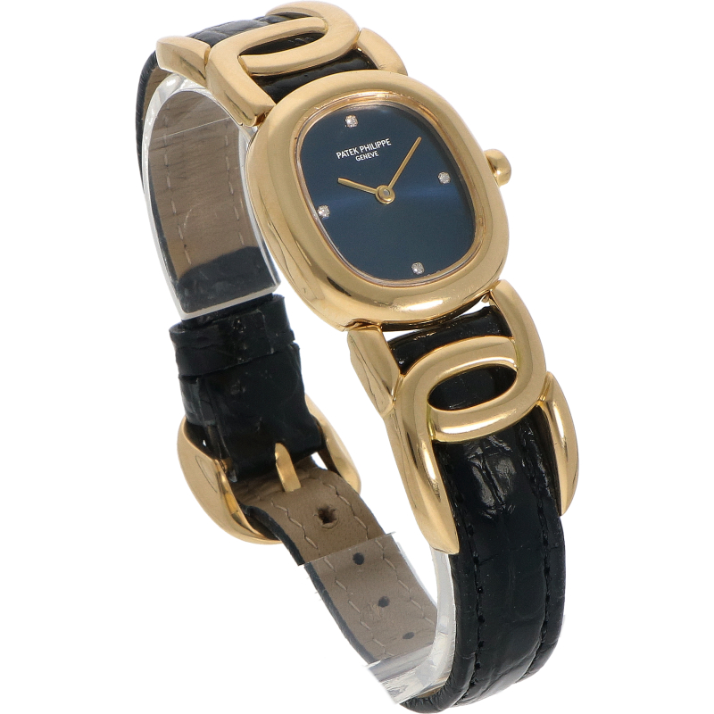 De Patek Philippe 4830 is een prachtig voorbeeld van een verfijnde, vrouwelijke esthetiek van Patek Philippe uit de jaren ’90. De Art-Deco geïnspireerde kast van dit horloge is compact (21mm) en elegant. Het is vervaardigd uit 18- karaats geelgoud. De blauwe wijzerplaat is zeer minimalistisch, met 4 diamanten uurmarkeringen en geelgouden wijzers. Het horloge wordt aangedreven door een quartz uurwerk. Het wordt geleverd op een nieuwe lederen band met sierlijke 18- karaats geelgouden elementen en een geelgouden gespje. Daardoor krijgt het horloge een juweel-achtige uitstraling.