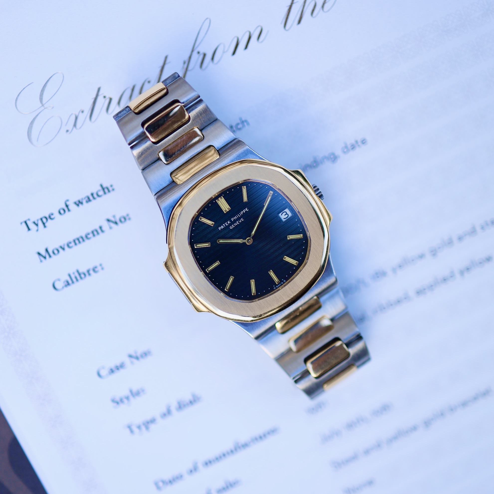 De legendarische Nautilus-lijn begon in 1976 met de iconische referentie 3700, bijgenaamd “Jumbo” vanwege zijn imposante formaat voor die tijd. Gemaakt door de eveneens legendarische Gerald Genta, wordt het beschouwd als een van zijn beste en meest tijdloze ontwerpen. De referentie 3700/1 maakt deel uit van de eerste serie die van 1976 tot 1982 werd geproduceerd. Staal/gouden modellen werden veel minder gemaakt dan de stalen, wat dit een zeldzamer model maakt.