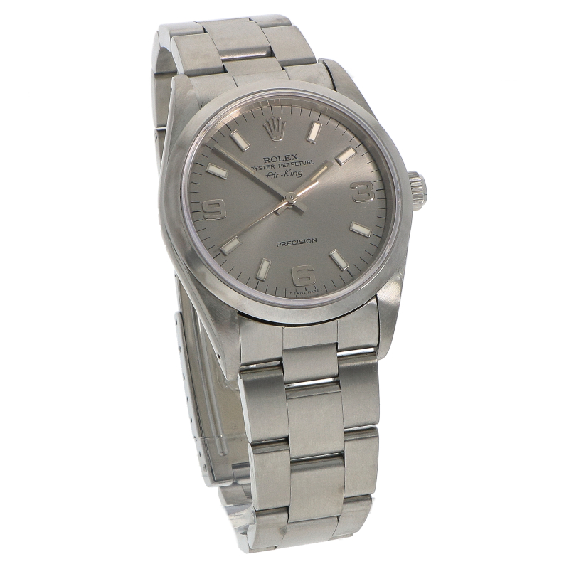 De Air-King staat bekend om zijn strakke ‘Time-Only’ ontwerp. Ref. 14000 was het eerste Air-King model dat werd uitgerust met saffierglas. Het horloge is gemaakt van roestvrij staal en heeft een gladde, gepolijste lunette. Het is voorzien van een zilver/grijze ‘Explorer-style’ wijzerplaat: met Arabische cijfers op 3, 6 en 9 uur. Het wordt aangedreven door een automatisch uurwerk cal. 3000. Geleverd op een robuuste Oyster- band.