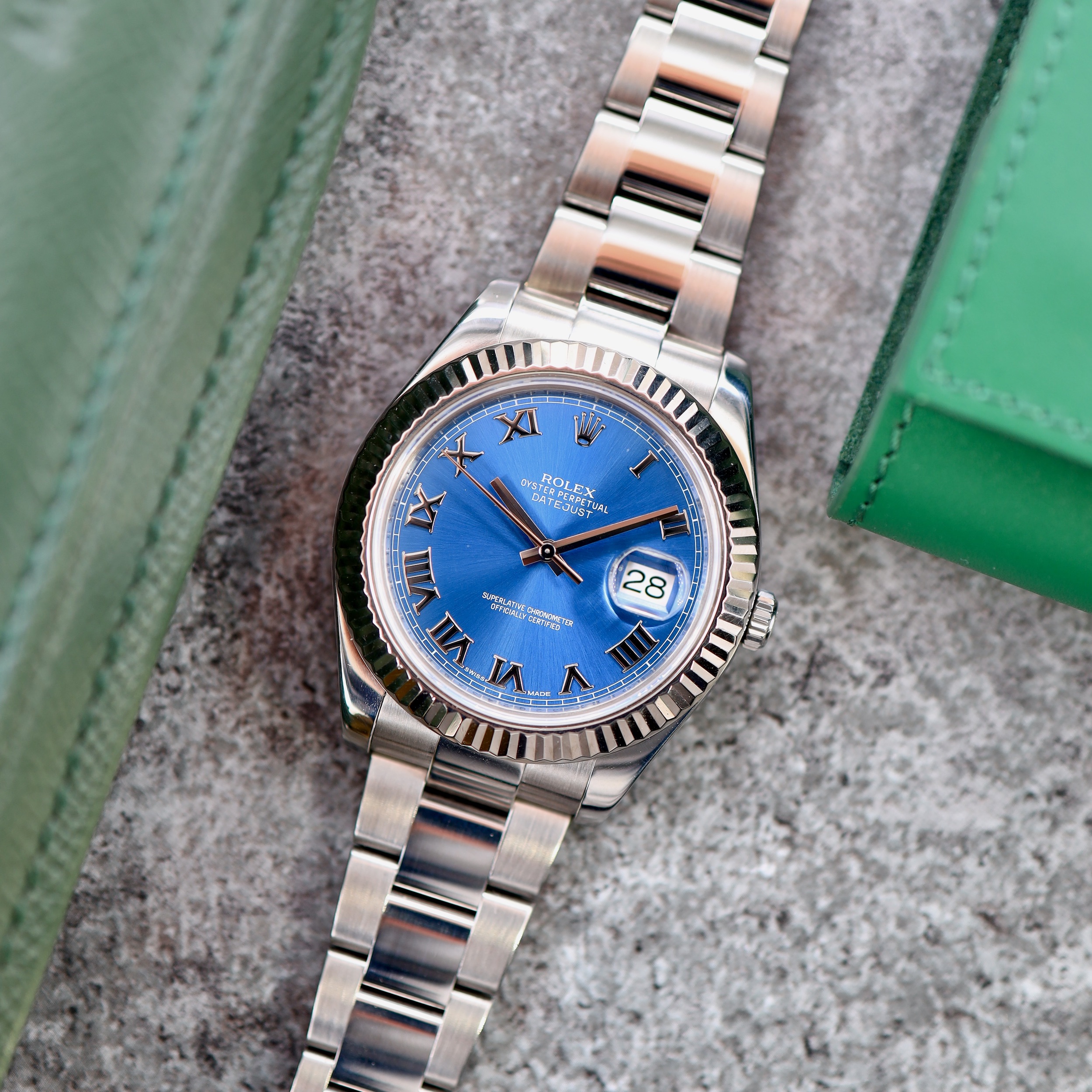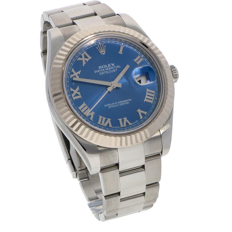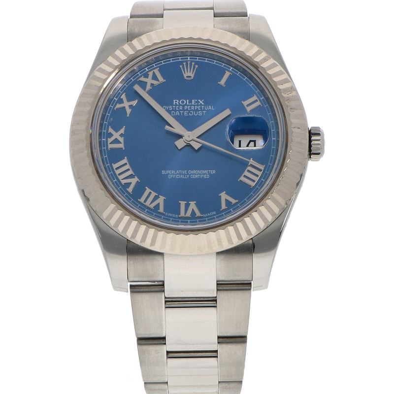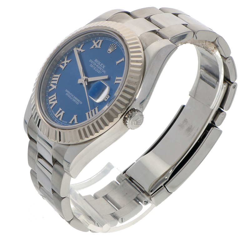 Deze Rolex DateJust II met de Azzuro Blue wijzerplaat is een van de meest herkenbare en geliefde uitvoeringen van de grotere DateJust- modellen. Dit horloge combineert de sportieve kracht van 41mm roestvrijstalen kast met de klassieke elegantie van witgouden gekartelde lunette. Het pronkstuk van dit horloge is echter de wijzerplaat. Dankzij de sunray- finish reflecteert de wijzerplaat het licht vanuit het midden, waardoor de kleur varieert van diep oceaanblauw tot fel hemelsblauw. De opgelegde witgouden Romeinse cijfers geven dit horloge een elegante uitstraling. Binnenin bevindt zich het nauwkeurige caliber 3136 automatisch uurwerk. Geleverd op de sportieve Oyster- band met het Easylink- verlengsysteem.