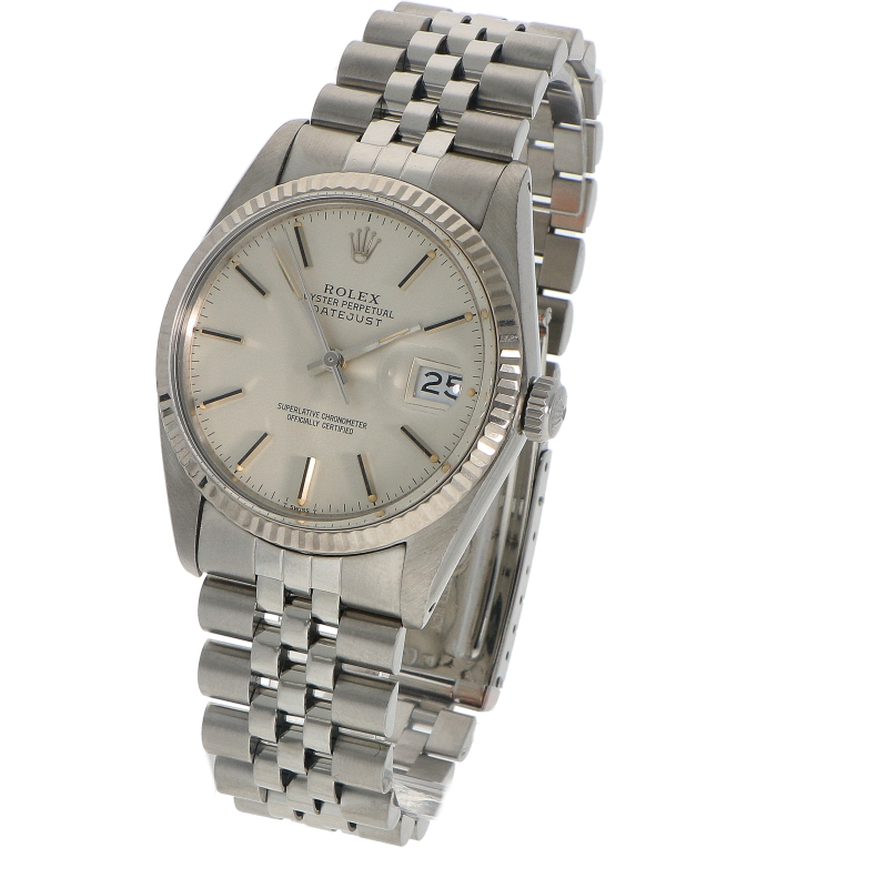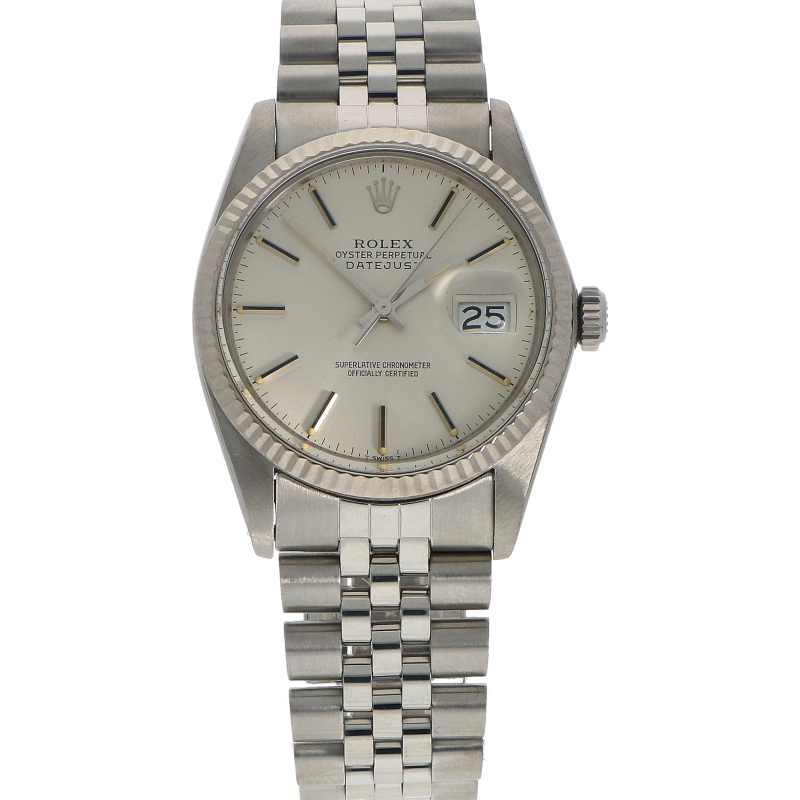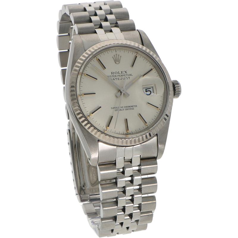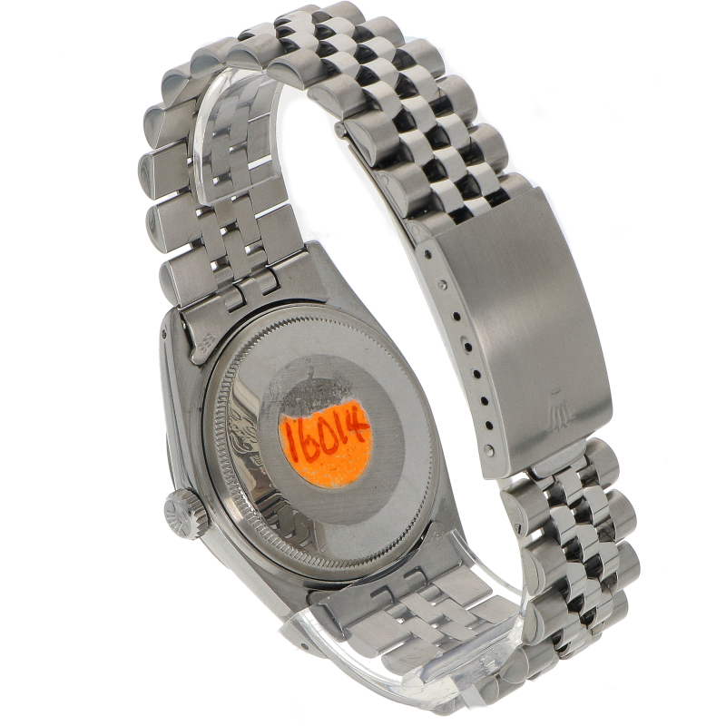 Deze Rolex DateJust referentie 16014 is voorzien van een roestvrijstalen Oyster-kast (36mm), een roestvrijstalen Jubilee-band met vijf schakels en een elegante 18K witgouden bezel. Het horloge wordt aangedreven door een perpetual uurwerk cal. 3035 en heeft een datum functie.