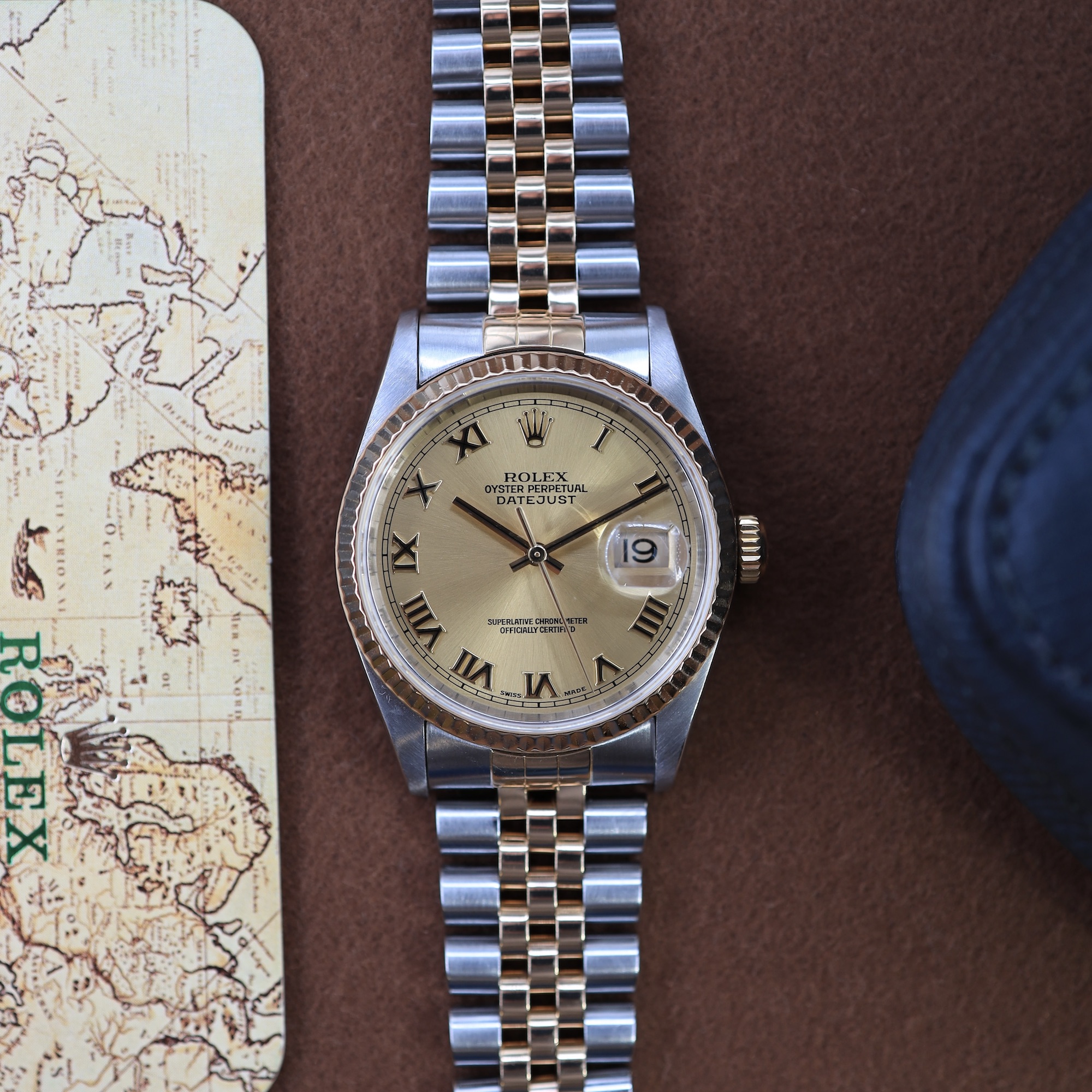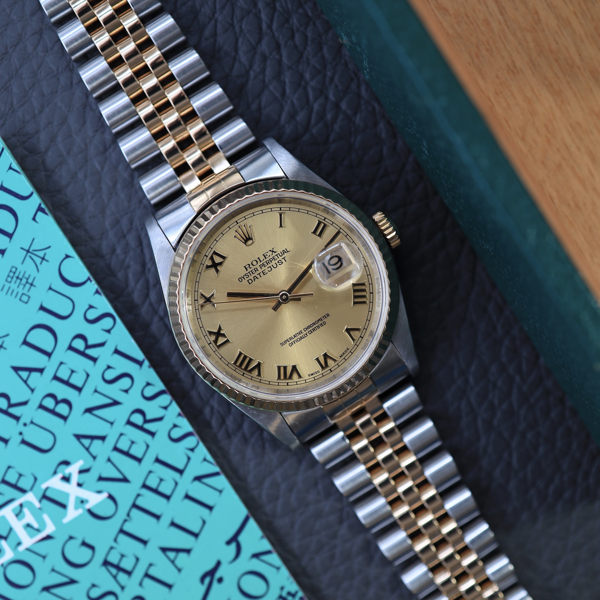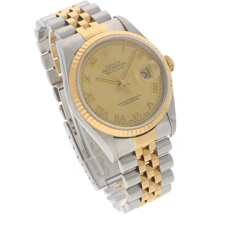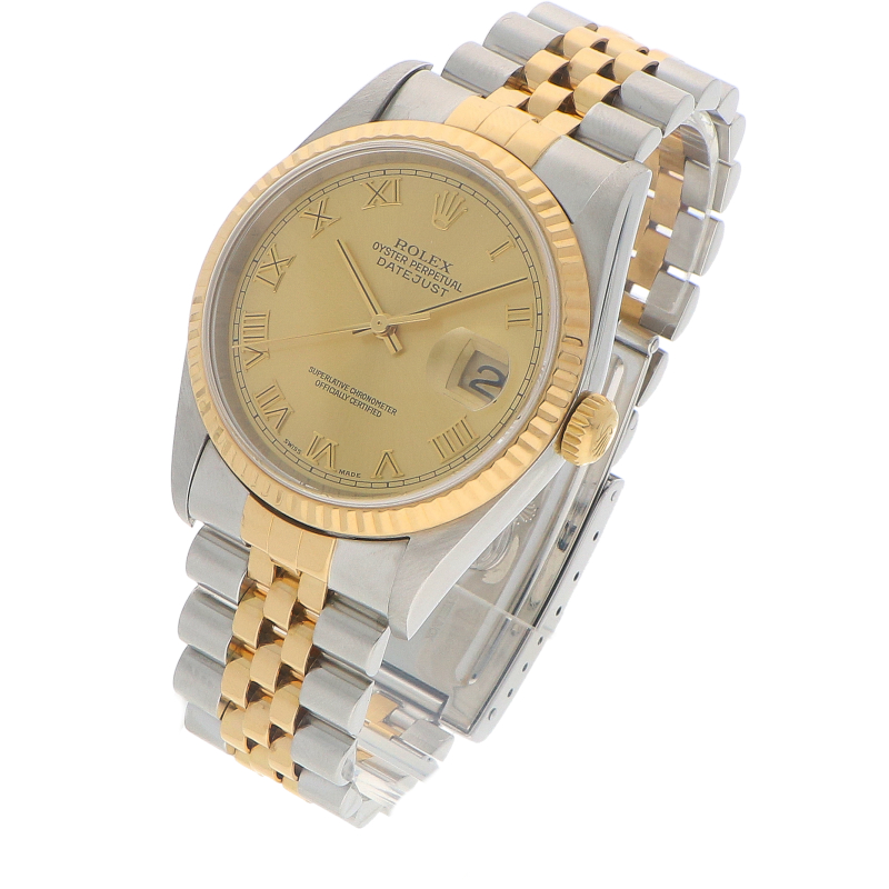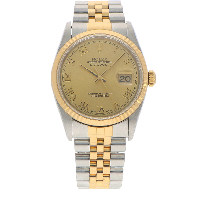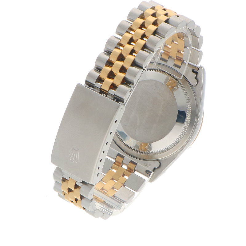 De kast heeft een diameter van 36mm, gemaakt van 18k geelgoud en roestvrij staal. De 16233 heeft een gekartelde (fluted) lunette die altijd is gemaakt van 18-karaats geelgoud. Het horloge is uitgerust met het betrouwbare automatische kaliber 3135. Dit uurwerk beschikt over een datumfunctie met een snelle instelling (quick set). De gouden wijzerplaat is voorzien van Romeinse cijfer uurmarkeringen. Dit horloge wordt geleverd op de iconische Jubilee band.