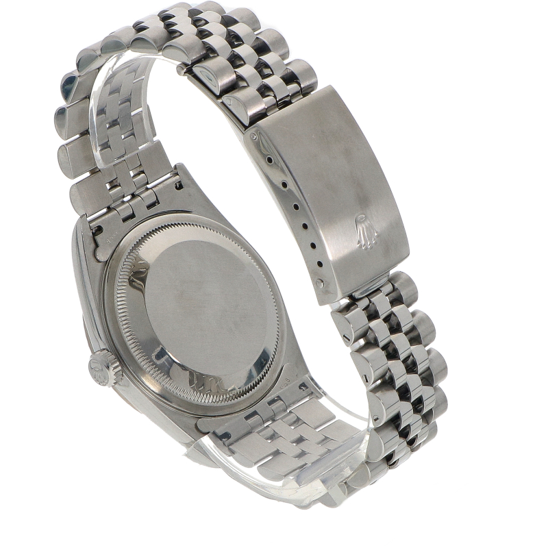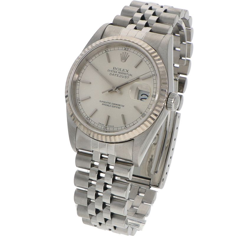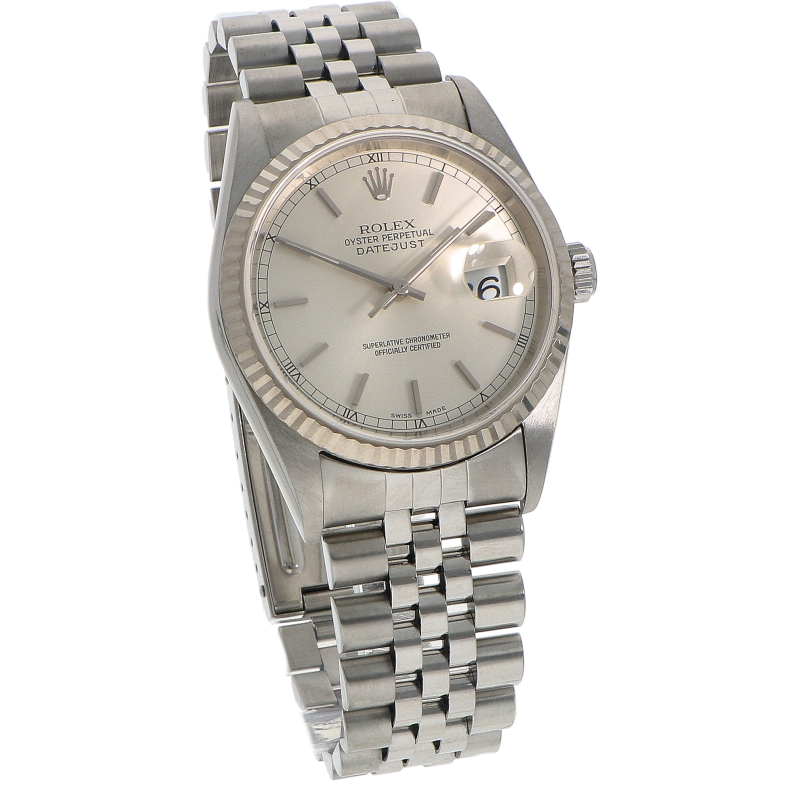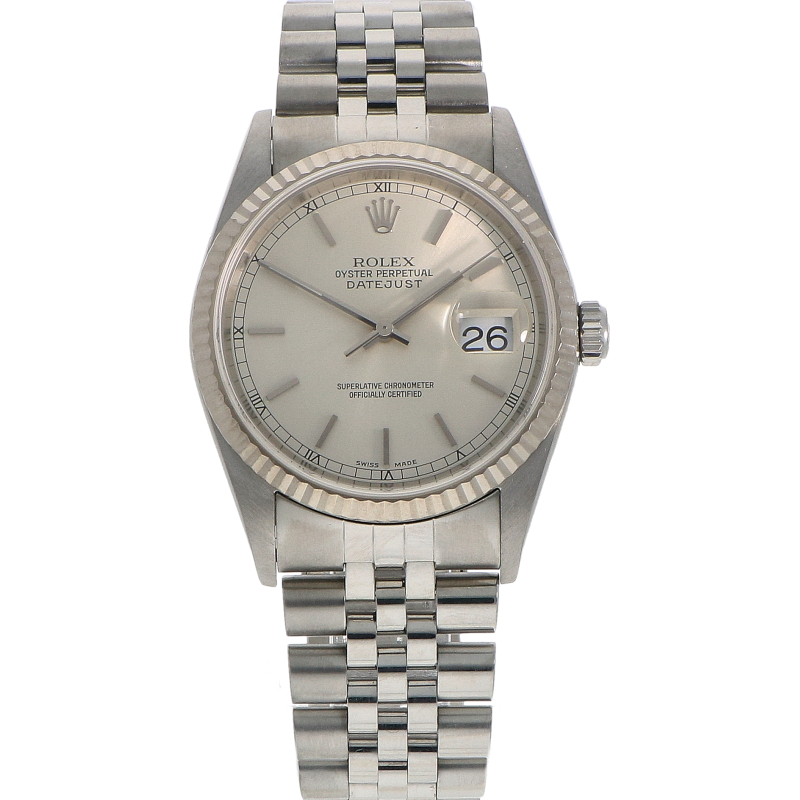 De kast heeft een roestvrijstalen kast met een diameter van diameter 36mm. Ref. 16234 heeft een gekartelde (fluted) lunette die altijd is gemaakt van 18-karaats witgoud. Het horloge is uitgerust met het betrouwbare automatische kaliber 3035. Dit uurwerk beschikt over een datumfunctie met een snelle instelling (quick set). De zilveren wijzerplaat is voorzien van streep en Romeinse cijfer uurmarkeringen. Geleverd op de iconische Jubilee band.