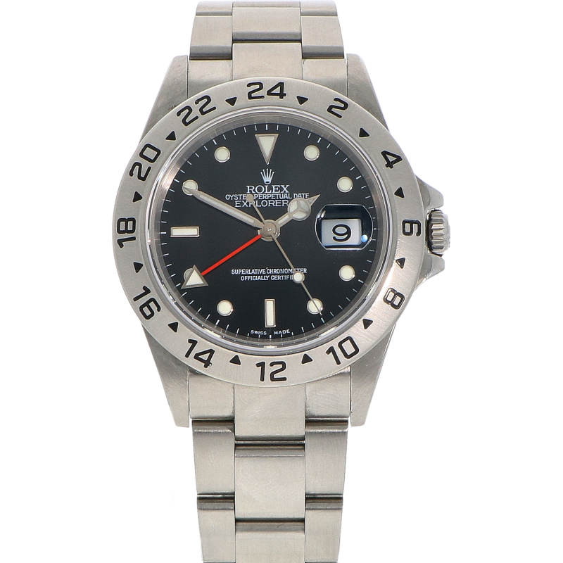Ref. 16570 is een van de meest gewilde ‘neo-vintage’ modellen van de Explorer II lijn. Dit model was in productie van 1989 tot 2011 en staat bekend om zijn robuuste, maar toch elegante 40mm formaat. De zwarte wijzerplaat geeft het horloge een klassiekere, meer ingetogen ‘Tool-watch’- uitstraling. Het horloge wordt aangedreven door cal. 3185 automatisch uurwerk en heeft een onafhankelijk instelbare 24-uurs wijzer, die de referentietijd aangeeft op de vaste lunette.Geleverd op de sportieve Oyster-band.