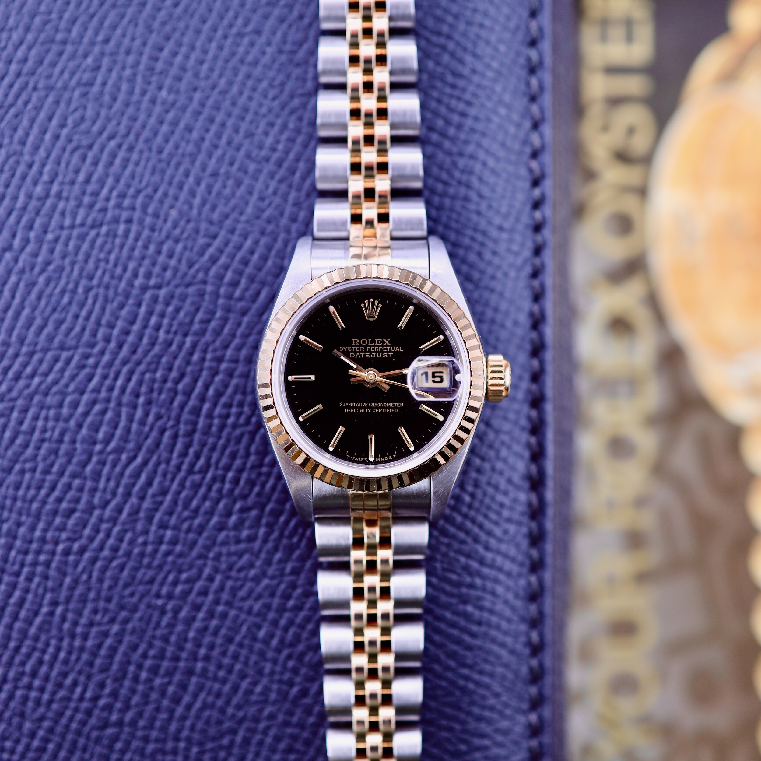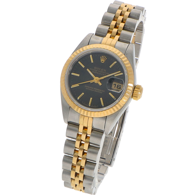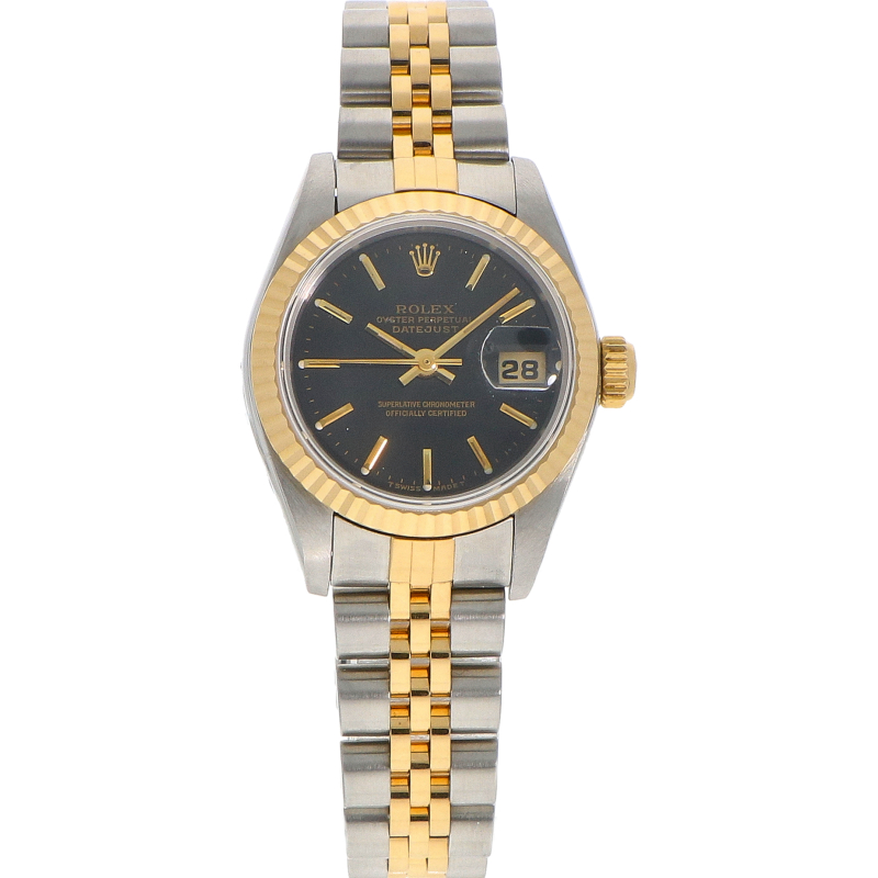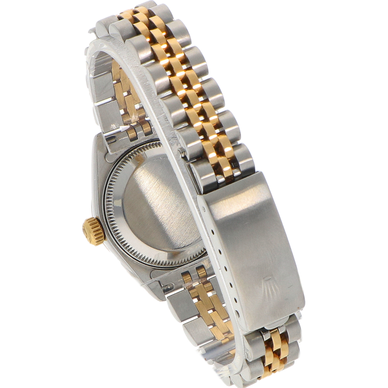 Ref. 69173 is een klassiek dameshorloge (26mm), uitgevoerd in het kenmerkende ‘Rolesor’ (combinatie van roestvrij staal en 18-karaats geelgoud) van Rolex. De zwarte wijzerplaat geeft het horloge een strakke en opvallende uitstraling die contrasteert met de gouden elementen. Aangedreven door automatisch uurwerk cal. 2135 en voorzien van een iconische Jubilee-band.