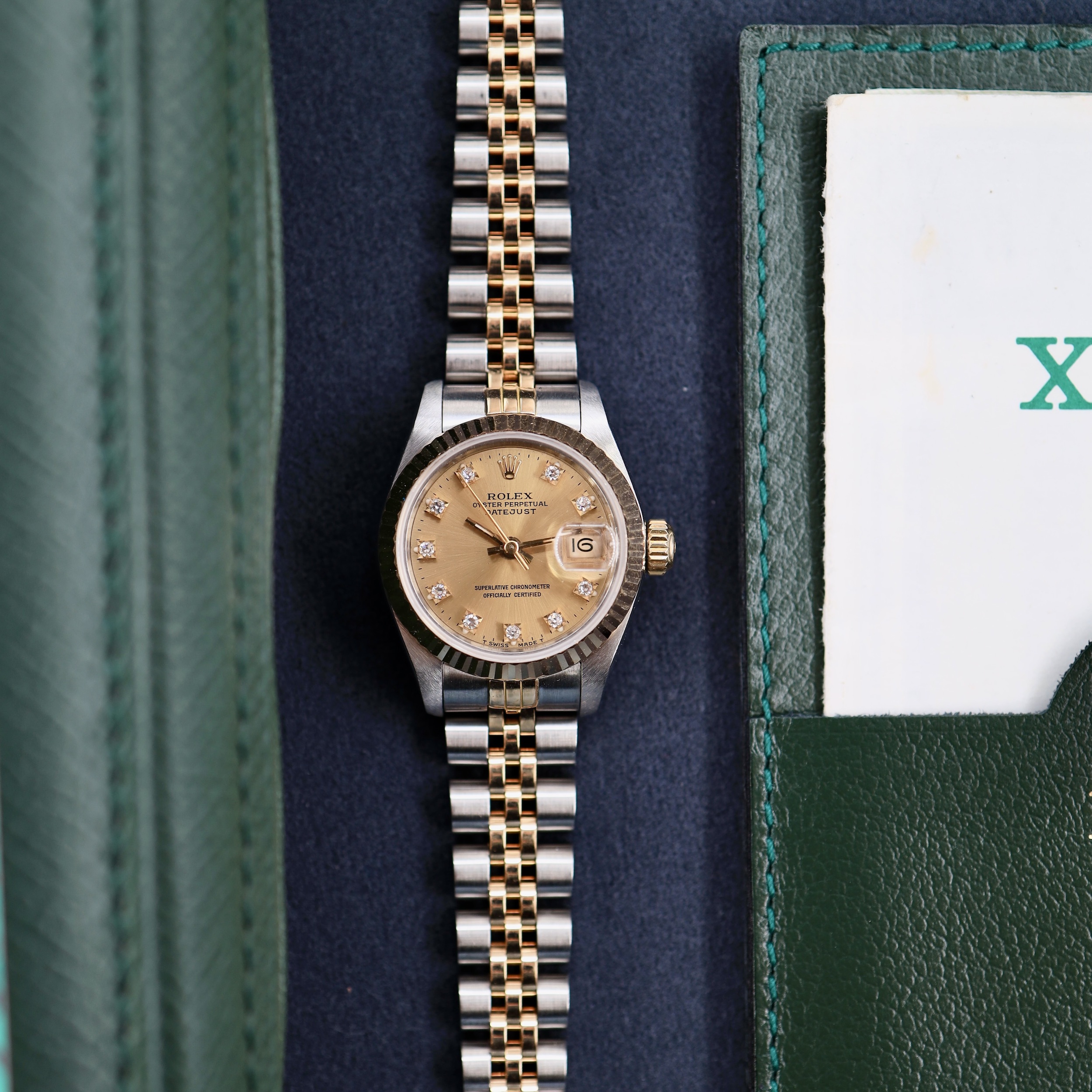 Dit horloge (ref. 69173) dateert uit 1989 en wordt geleverd met een luxe doos van onze winkel en het originele garantiecertificaat van Rolex.