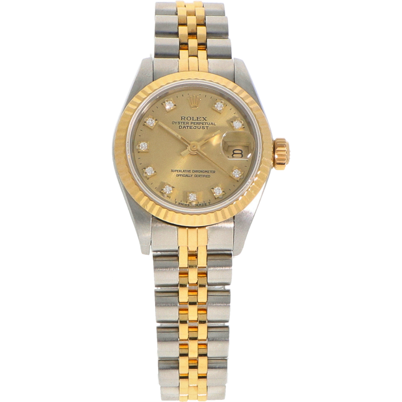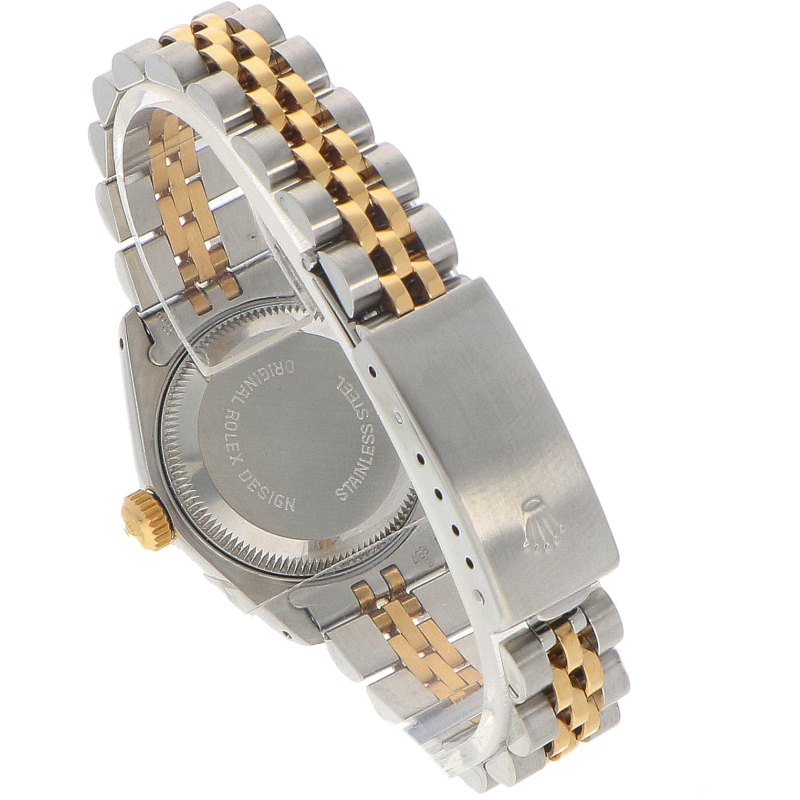 Roestvrijstalen horlogekast (26mm) met 18K geelgouden gekartelde lunette. Zeer bijzondere champagne gouden wijzerplaat met sprankelende diamanten uurmarkeringen. Krasbestendig saffierglas. Automatisch uurwerk met datum (cal. 2135). Roestvrijstalen en 18K geelgouden Jubilee band met een vouwsluiting.