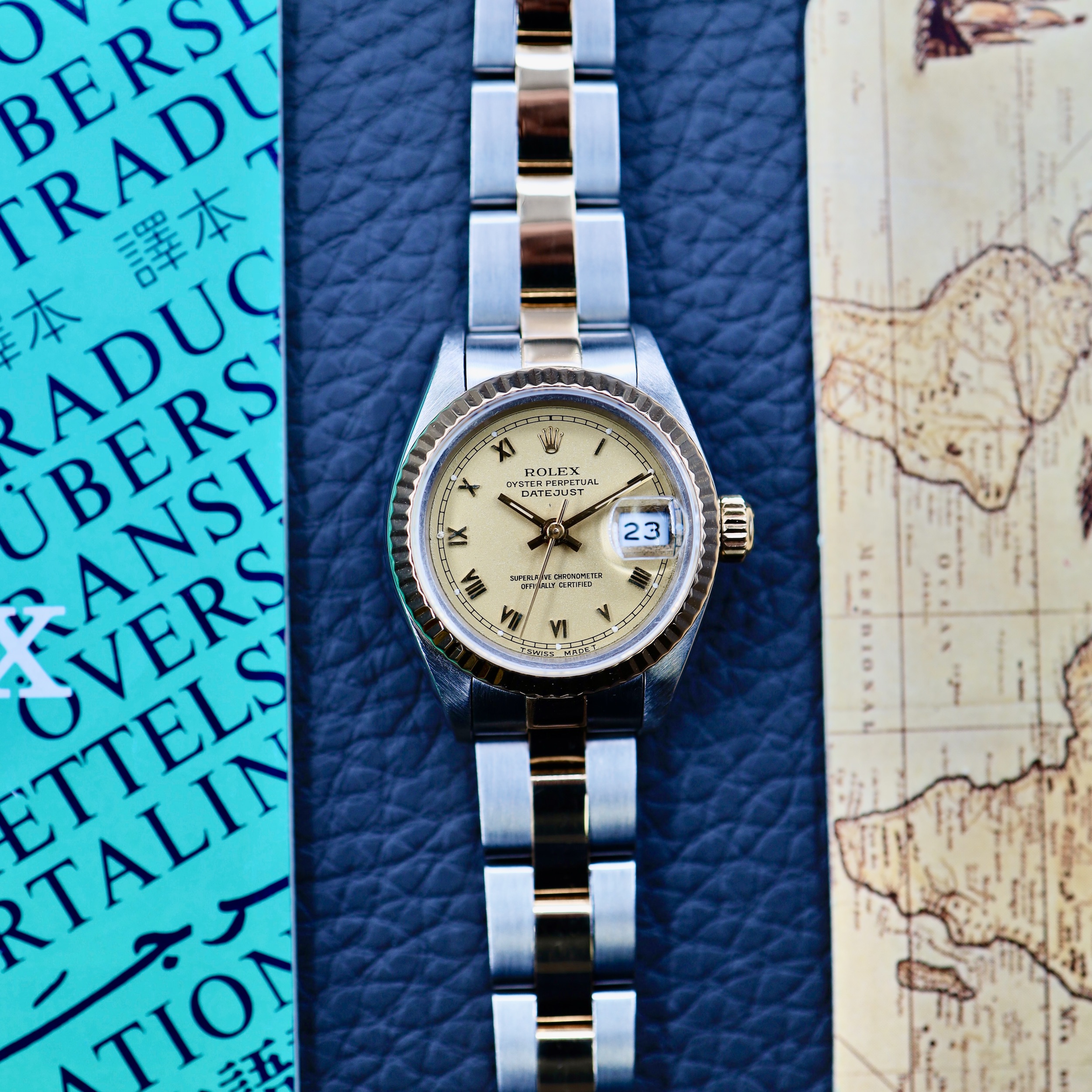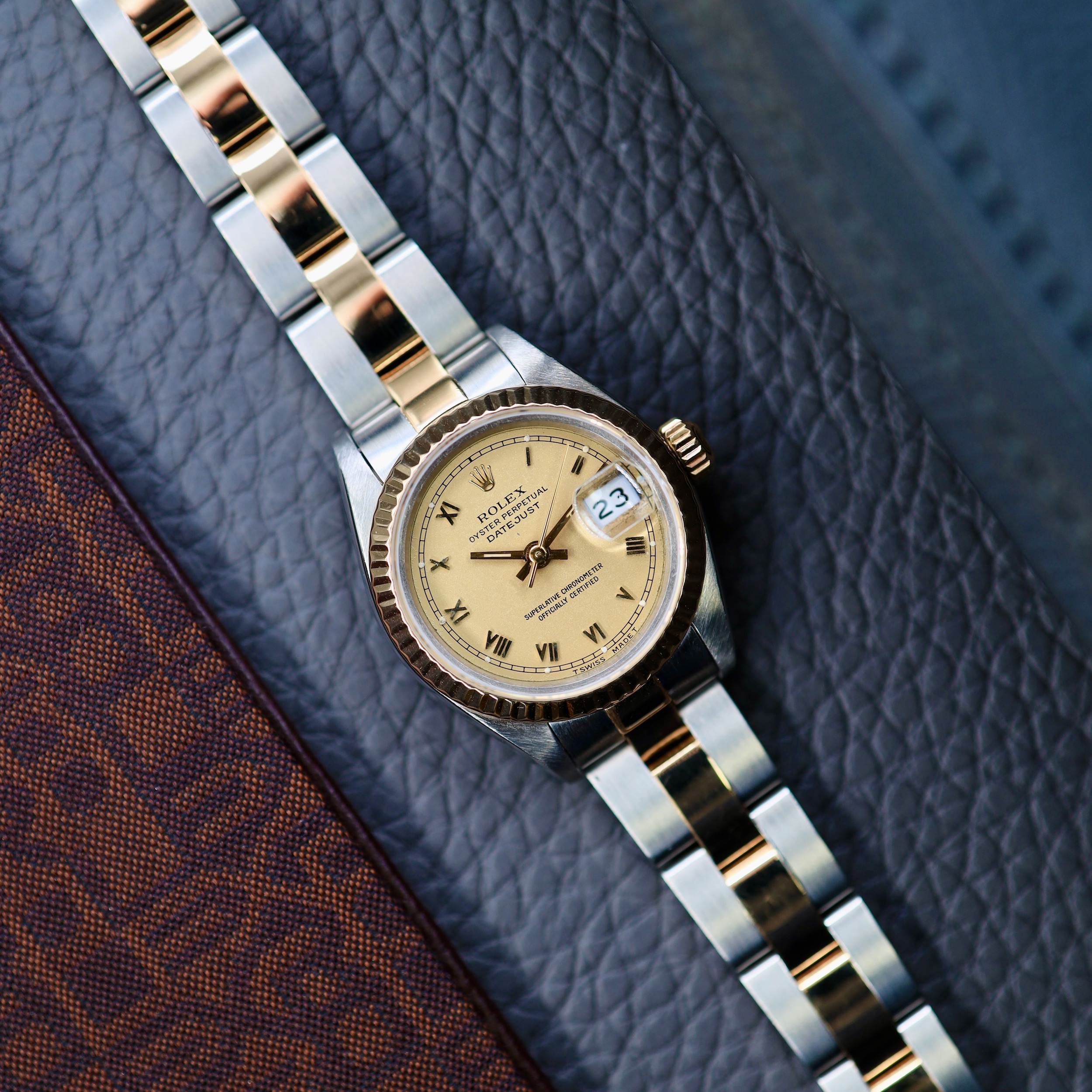 Dit horloge (ref. 69173) dateert uit 1993 en wordt geleverd met een luxe doos van onze winkel en het originele garantiecertificaat van Rolex.