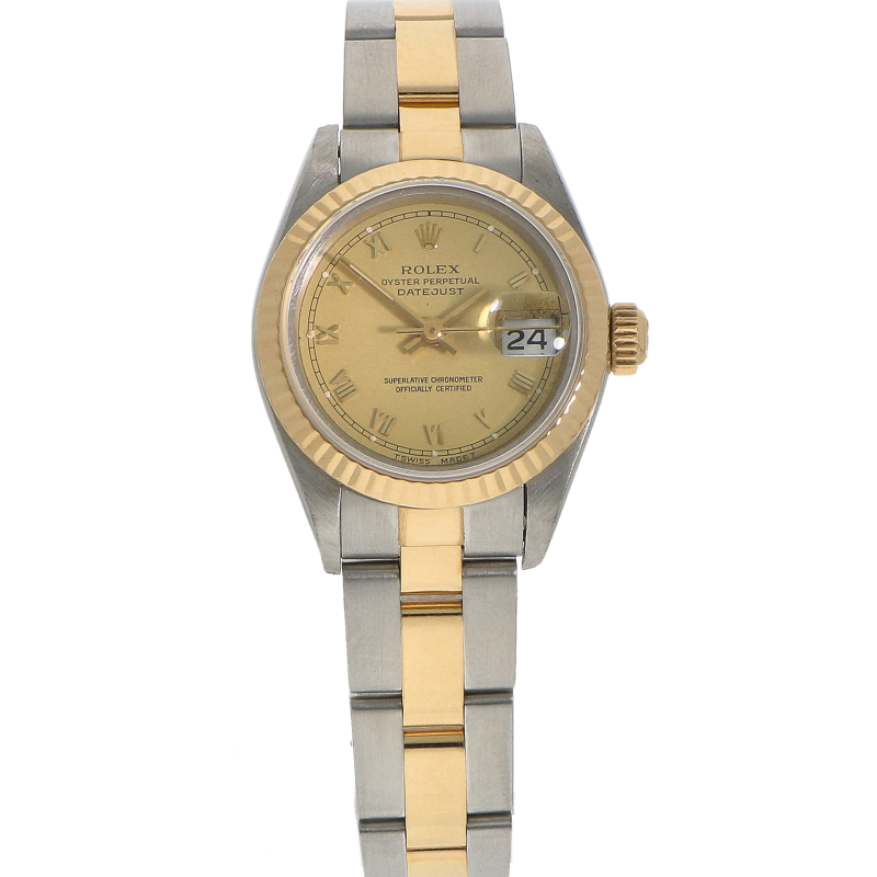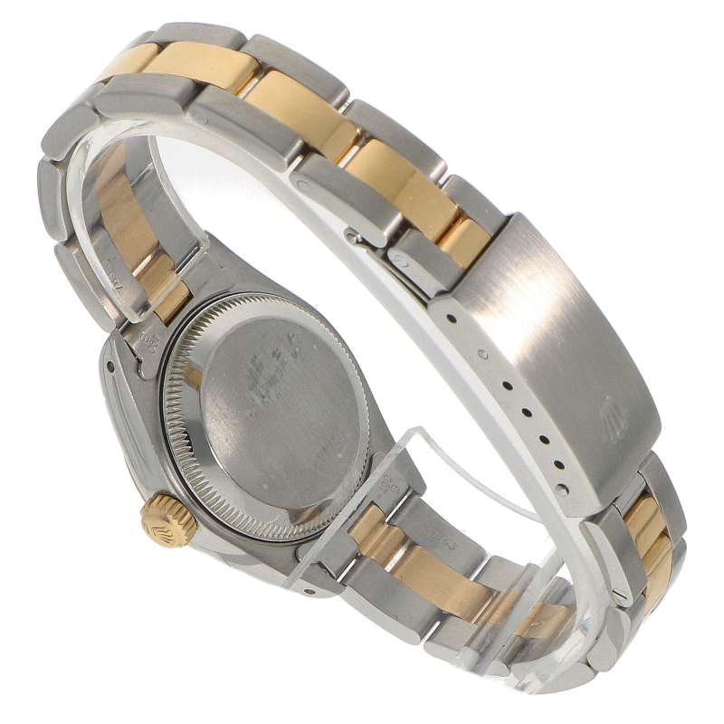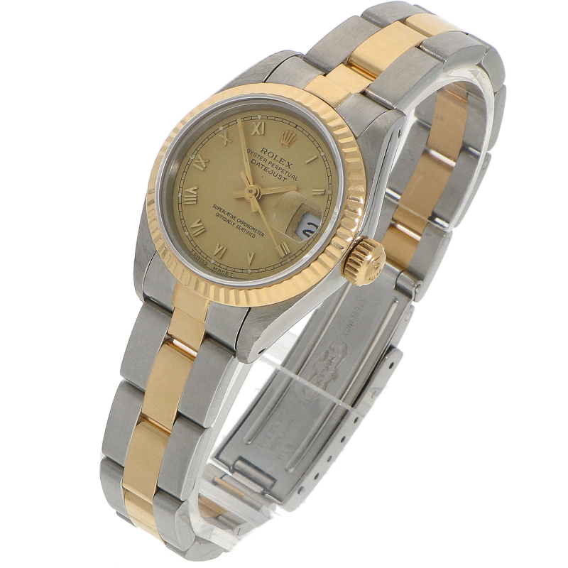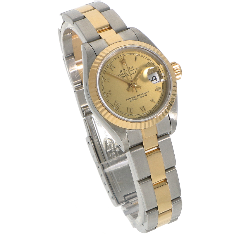 Roestvrijstalen horlogekast (26mm) met 18K geelgouden gekartelde lunette. Prachtige champagne gouden wijzerplaat met opgelegde Romeinse uurmarkeringen. Krasbestendig saffierglas. Automatisch uurwerk met datum (cal. 2135). Roestvrijstalen en 18K geelgouden Oyster band met een vouwsluiting.