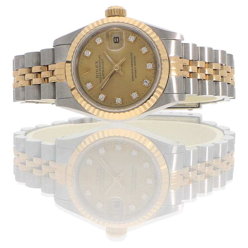 Roestvrijstalen horlogekast (26mm) met 18K geelgouden gekartelde lunette. Zeer bijzondere champagne gouden wijzerplaat met sprankelende diamanten uurmarkeringen. Krasbestendig saffierglas. Automatisch uurwerk met datum (cal. 2135). Roestvrijstalen en 18K geelgouden Jubilee band met een vouwsluiting.
