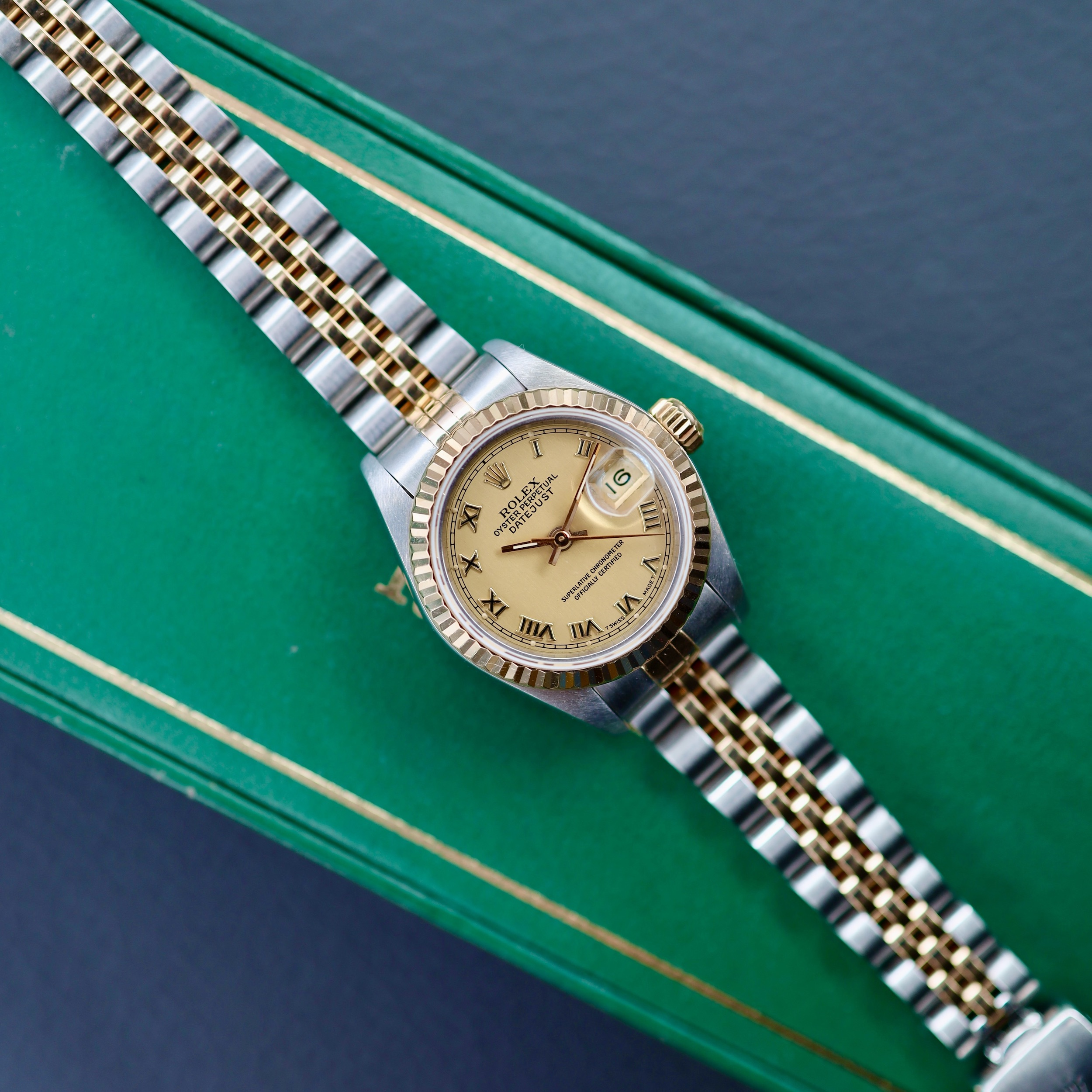 Dit horloge (ref. 69173) dateert uit 1996 en wordt geleverd met een luxe doos van onze winkel en het originele garantiecertificaat van Rolex.