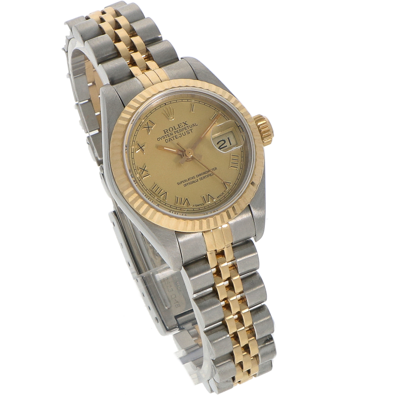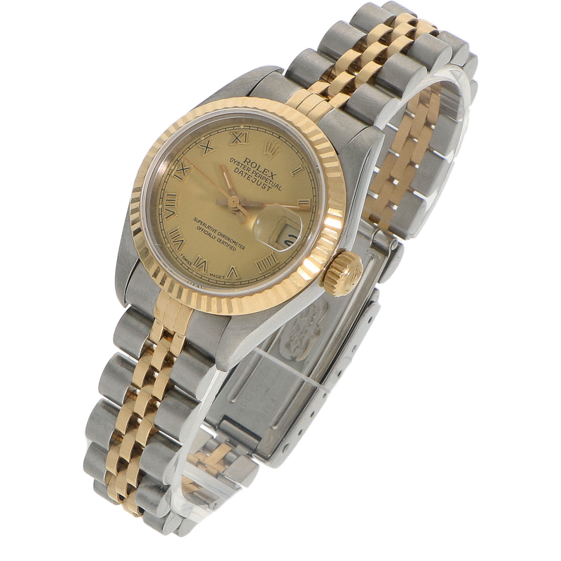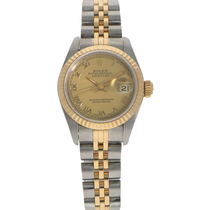 Roestvrijstalen horlogekast (26mm) met 18K geelgouden gekartelde lunette. Prachtige champagne gouden wijzerplaat met opgelegde Romeinse uurmarkeringen. Krasbestendig saffierglas. Automatisch uurwerk met datum (cal. 2135). Roestvrijstalen en 18K geelgouden Oyster band met een vouwsluiting.