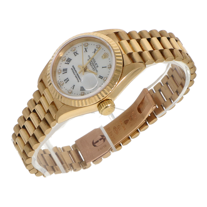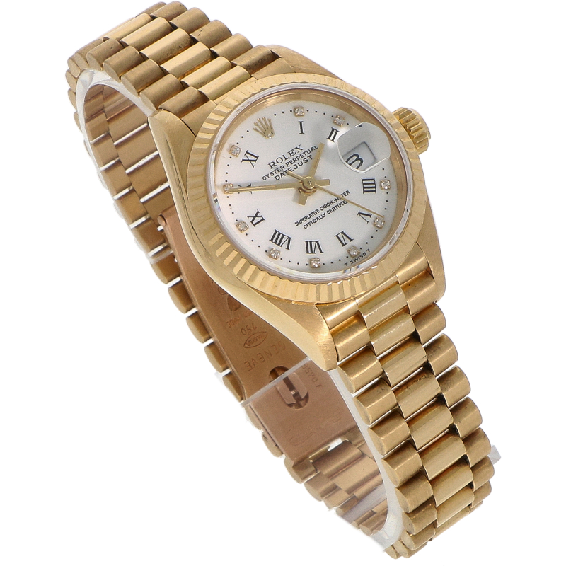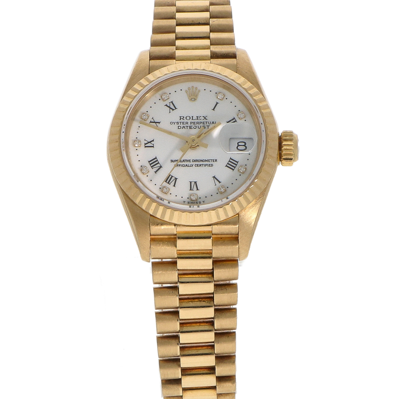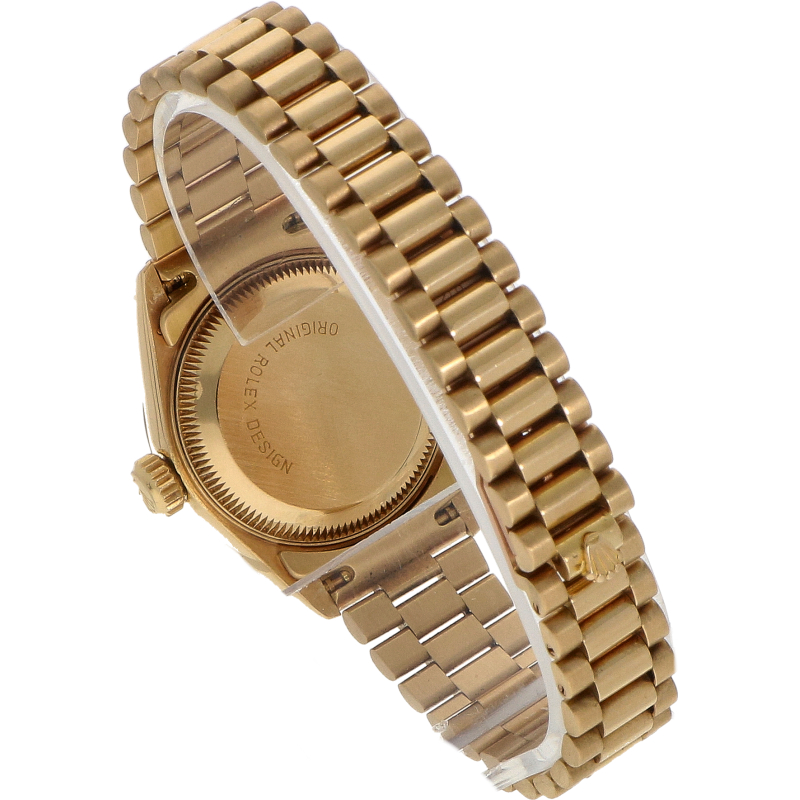 Ref. 69178 is een klassieke Lady-DateJust in volledig 18- karaats geelgoud. De kast heeft een vrouwelijke damesmaat van 26mm. De helderwitte wijzerplaat is voorzien van zwarte Romeinse uurmarkeringen en kleine diamantjes. De kast wordt beschermd door saffierglas. Het uurwerk is Rolex caliber 2135, een van de meest betrouwbare uurwerken dat Rolex ooit heeft gemaakt. Dit model is uitgevoerd met de bekende 18- karaats geelgouden President- band. Het is een krachtig statement- piece dat zowel vintage als modern aanvoelt en nooit uit de mode raakt.