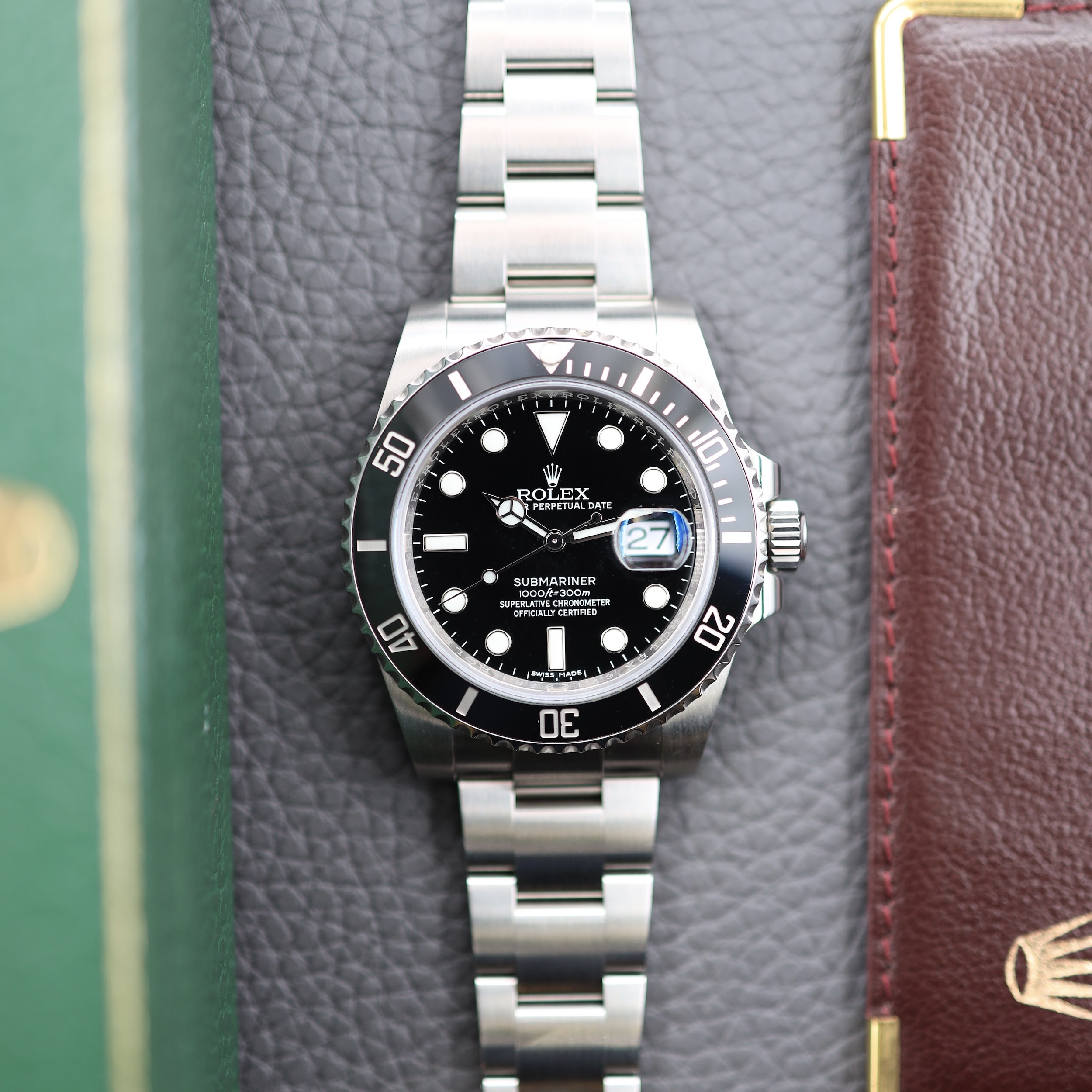 Ref. 116610LN bracht de Submariner naar het moderne tijdperk door de introductie van de Cerachrom Bezel (extreem krasbestendig keramiek), de Super Case (dikkere kastprofielen en lugs) en de Maxi Dial (grotere markeringen). De roestvrijstalen Oyster-band is voorzien van een uiterst functioncioneel Glidelock verlengsysteem in de sluiting. Het horloge wordt aangedreven door automatisch Rolex caliber 3135.