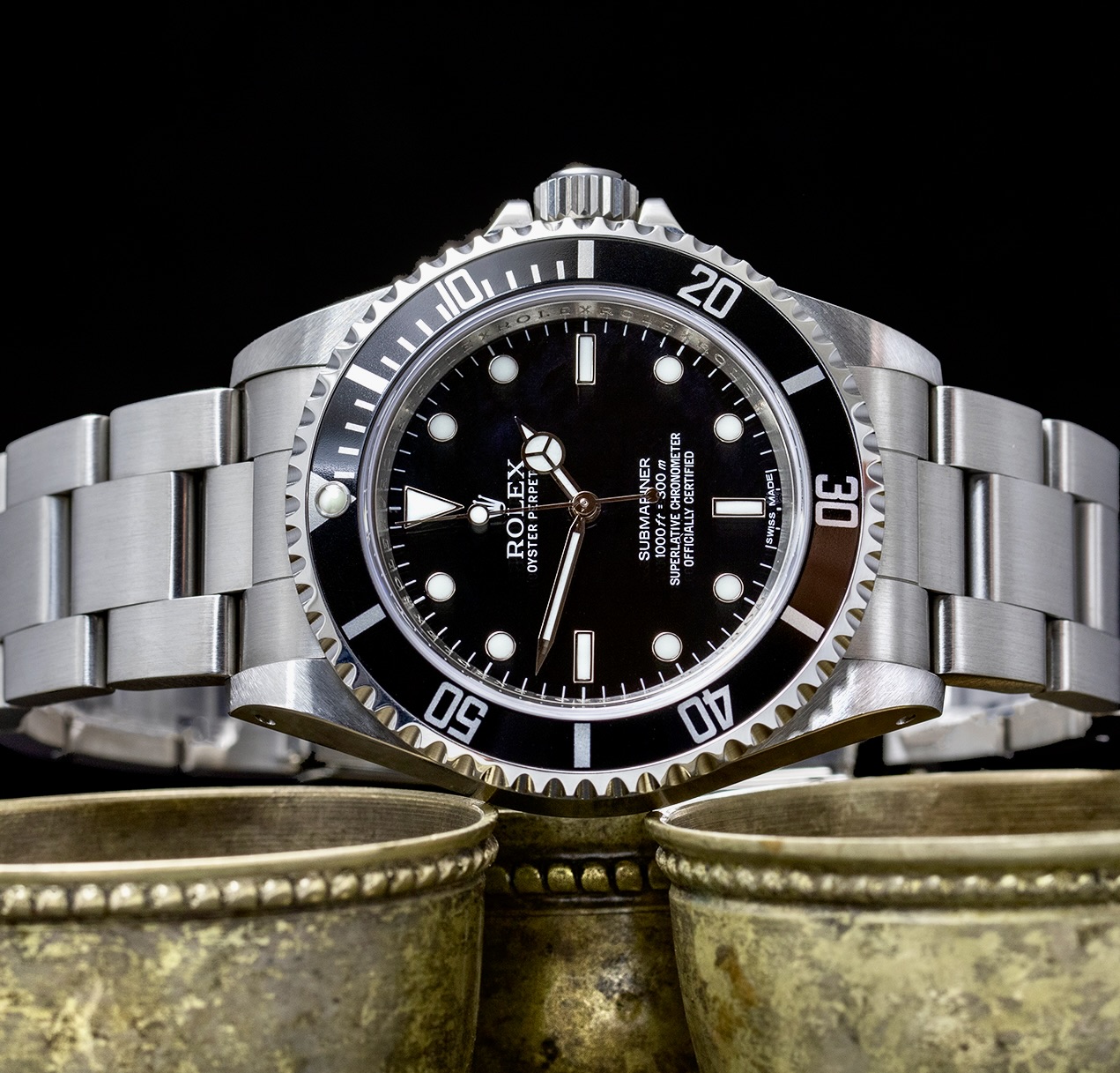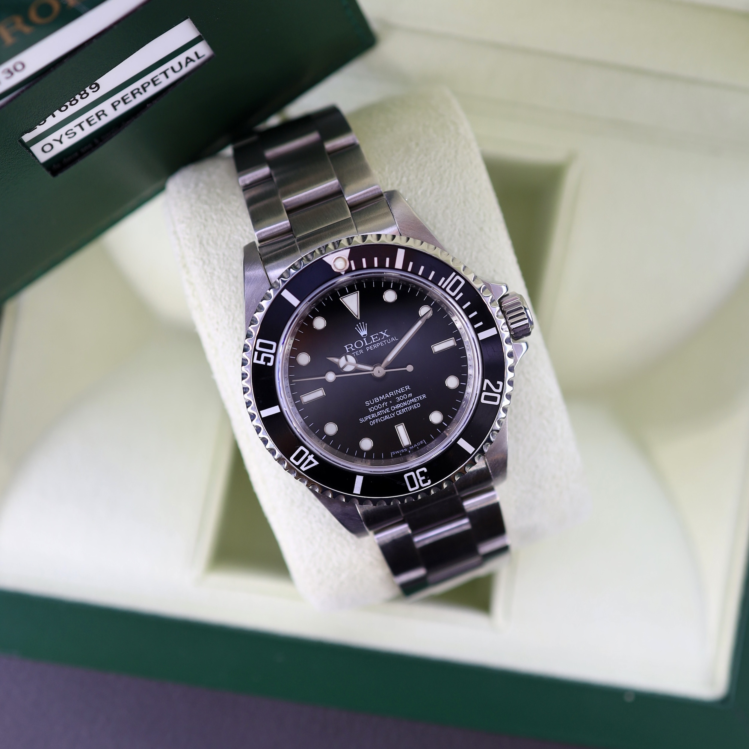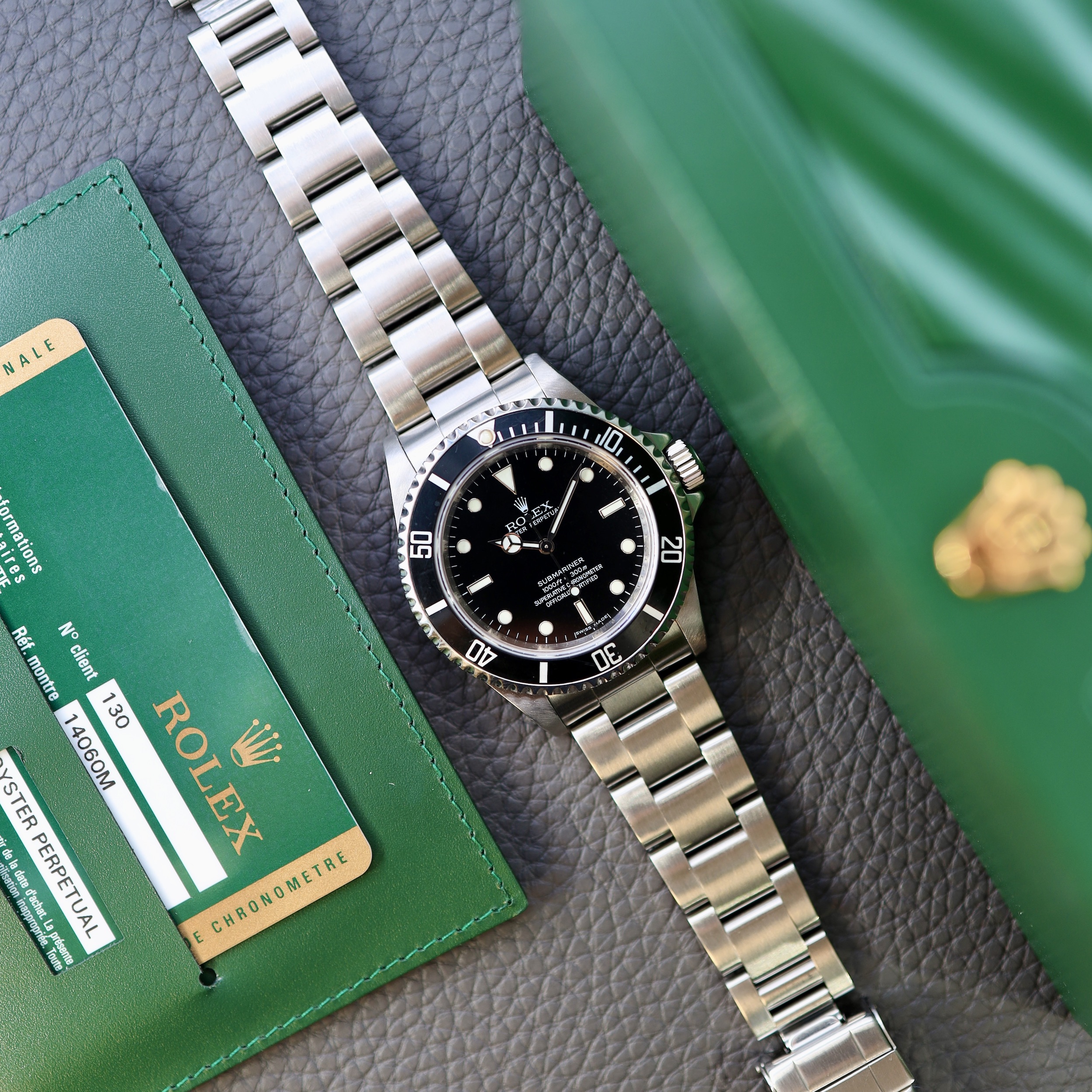 Ref. 14060M is de directe opvolger van de 14060 en werd geproduceerd van ongeveer 2003 tot 2012. De toevoeging van de ‘M’ staat voor ‘Modified’ en duidt op een belangrijke update van het uurwerk. De kastmaat is de klassieke 40mm. Het ontbreken van een datumvenster zorgt voor een perfect symmetrische wijzerplaat. Het horloge wordt aangedreven door automatisch uurwerk cal. 3130 en wordt geleverd op een stalen Oyster-band.