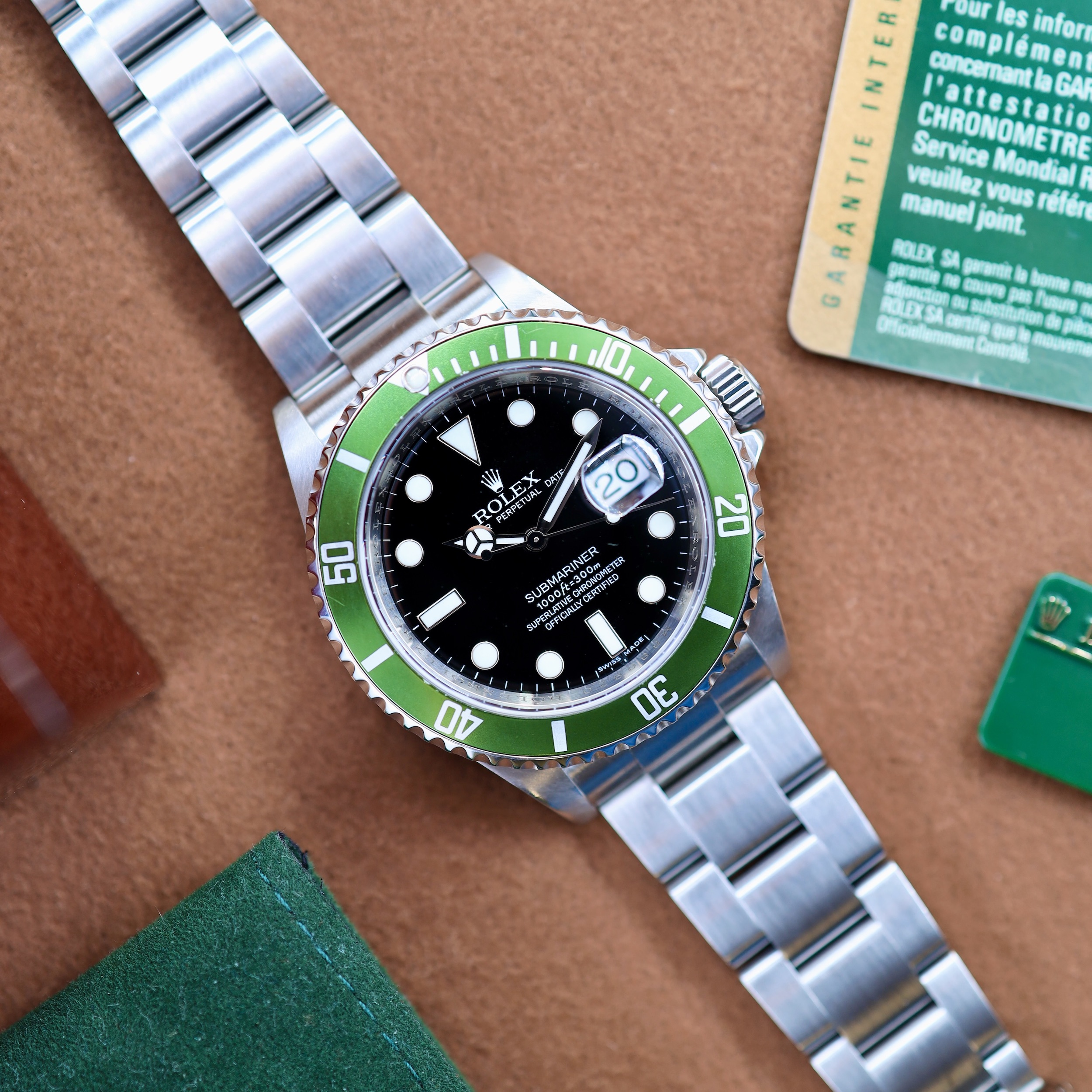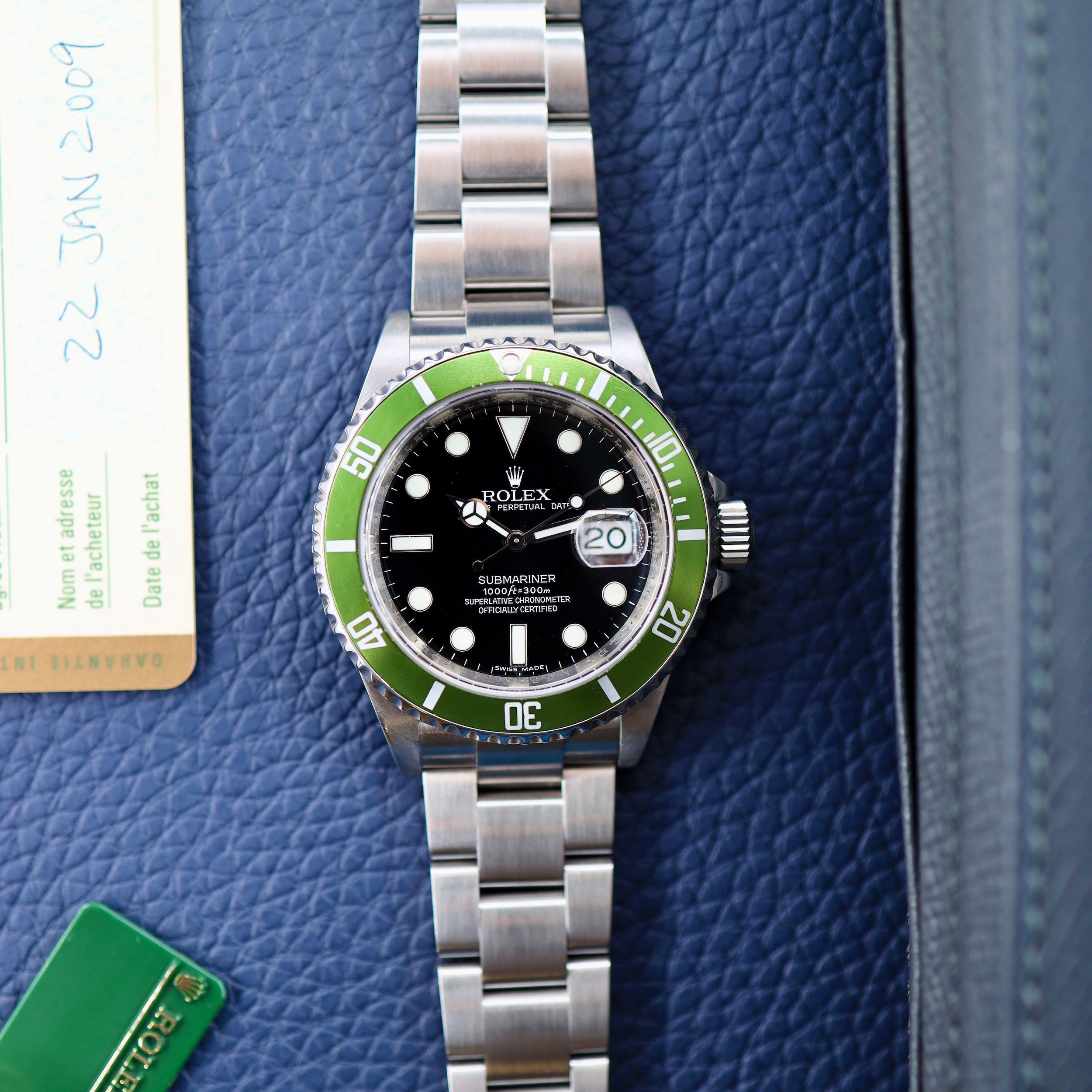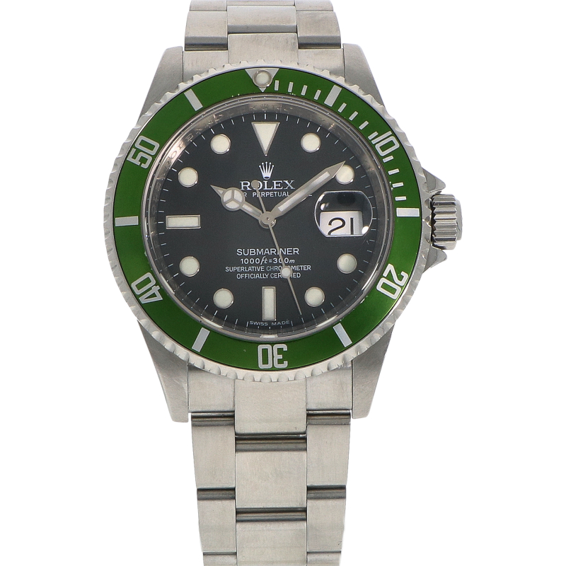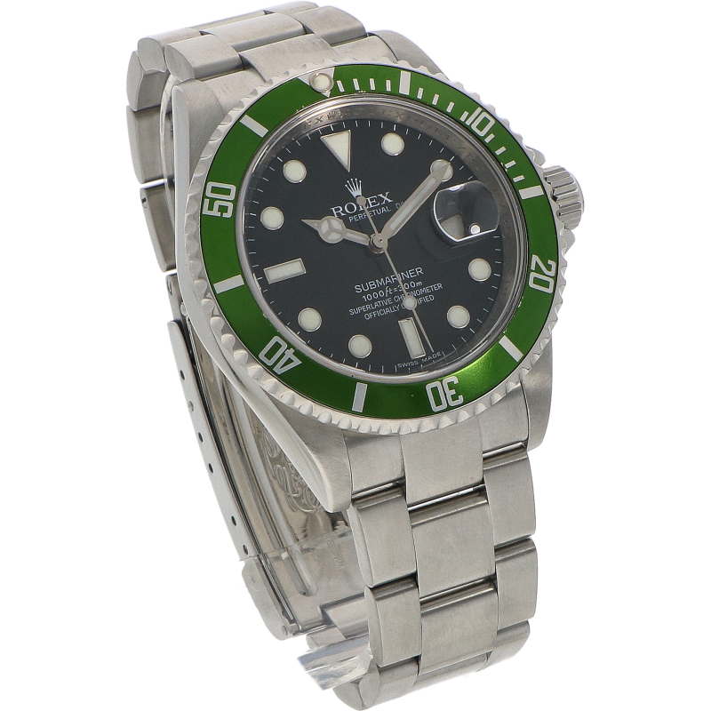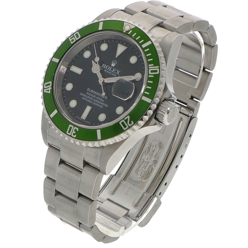De 16610LV werd in 2003 gelanceerd ter ere van de 50e verjaardag van de Rolex Submariner. Het meest onderscheidende kenmerk is de groene aluminium bezel (vandaar ook de bijnaam ‘Kermit’). De klassieke 40mm kast heeft zwarte wijzerplaat met wat grotere uurmarkeringen en wijzers (‘maxi-dial). Het horloge wordt aangedreven door het automatische caliber 3135.